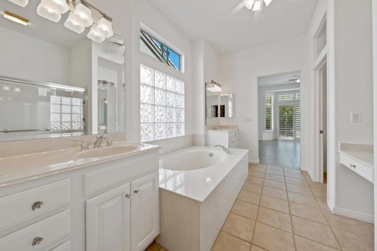 Sun City Palm Desert - Victoria. This truly great greatroom home has a spacious north facing rear yard with an extended patio and BBQ island. Stacked stone accents, lighted pilasters, decorative hardscape and leaded glass front door provide curb appeal. Inside, 10ft ceilings and tile flooring is throughout. The greatroom features a tile trimmed fireplace, crown molding and a slider to the rear patio. A den/office with custom built-in desk and shelving is off the main hallway. The chef's kitchen features a long island with breakfast bar, granite counters, under cabinet lighting, cabinets with pullout shelves, and an island with butcher block top. Raised panel maple cabinetry is in the kitchen and bathrooms. The spacious primary suite has a bay slider to the rear patio, shutters, crown molding and a huge walk-in closet with custom built-in storage. The primary suite bathroom features a stall shower with glass enclosure, an oversized tub and dual sinks. The extended guest suite is at the opposite side of the house and has a stall shower in its ensuite bathroom. The extended laundry room provides additional utility. The extended 2 car garage has an epoxy floor, nook for golf cart parking, built-in and hanging rack storage and its own AC. The home is equipped with dual Lenox AC new 2011 and 2013.