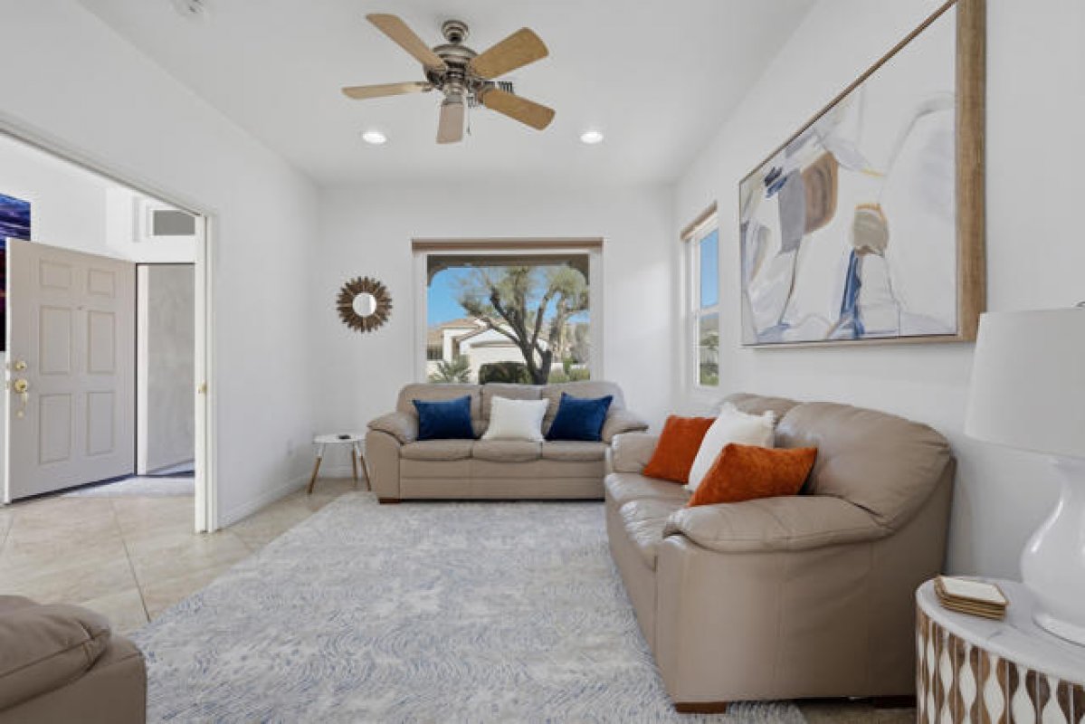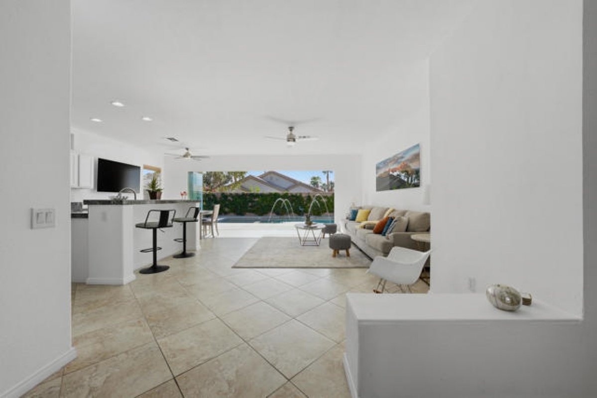 Sun City Palm Desert - Cayman. This popular greatroom home has been transformed into a private resort, featuring a stunning pebbletec pool and spa, a south facing rear yard with peekaboo mountain views, a spacious patio, and a folding glass panel wall that creates a seamless indoor-outdoor living experience. Upgraded windows, HVAC, and owned solar enhance comfort and efficiency. Inside, 20-inch tile flooring runs throughout the home--no carpeting. The upper portion of the wall between the greatroom and hallway has been removed, creating a more open, spacious feel. The kitchen is well appointed with granite countertops, stainless steel appliances, under-cabinet lighting, a chef's island, and a breakfast bar. Double pocket-doors off the greatroom open to a versatile den or office. The primary suite offers direct patio access and a walk-in closet with built-in storage. The en-suite bath includes dual sinks and a stall shower with textured glass doors. The guest bathroom features a tub/shower combination. The garage is finished with an epoxy floor, hanging rack storage, and a utility sink.