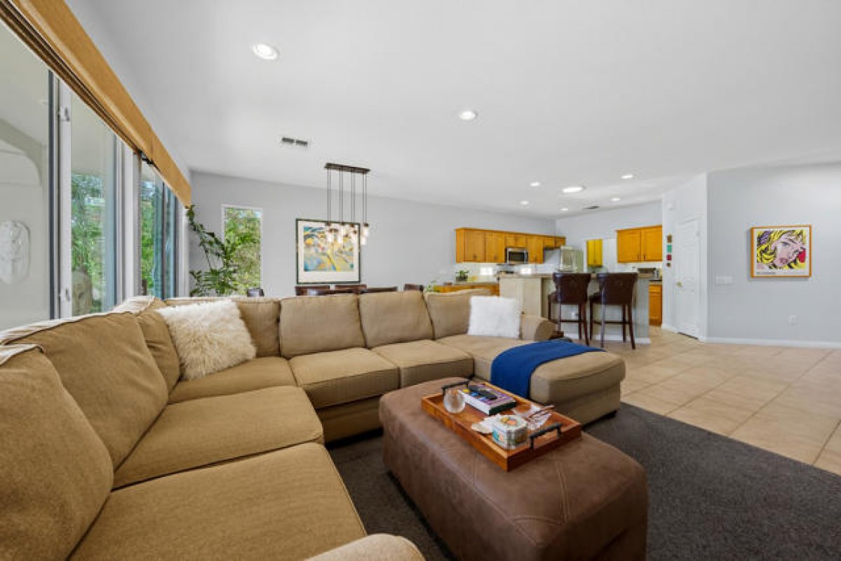 Sun City Palm Desert - St. Maarten. Located near two clubhouses and in the newest section of Sun City, this popular St. Maarten greatroom floor plan offers 2 bedrooms, 2 bathrooms, and a versatile den/office. One of the home's standout features is its spacious, north-facing rear yard situated on a large lot -- beautifully landscaped and designed for outdoor living with an extended decorative concrete patio, alumawood patio cover, and a sunken hot tub and fountain. Inside, the home is bright and open with abundant natural light enhanced by Solatubes in the kitchen, foyer, and den. Tile flooring runs throughout the main living areas, and the greatroom features a gas fireplace with a stacked-stone surround and direct access to the patio. The kitchen is both stylish and functional with granite countertops, under-cabinet lighting, recipe windows, stainless steel appliances, a breakfast bar, pantry, and pull-out shelving in the maple cabinetry -- which extends to the bathrooms, laundry, and linen storage. Accordion doors off the greatroom open to a spacious den/office with plantation shutters. The primary suite includes a media nook, large walk-in closet, and en suite bathroom with a sitting vanity and glass-enclosed shower. The guest bedroom also offers a walk-in closet and shutters, and the guest bath features a tub/shower combination. Additional highlights include a laundry room with built-in storage, a two-car garage with ample storage space, and a new AC installed in 2021.