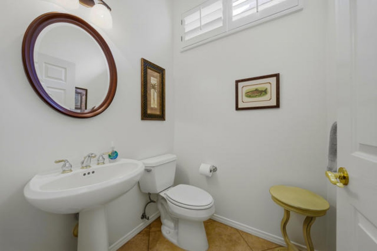 Sun City Palm Desert - Monterey. This highly sought-after great room home is ideally situated between the Lake View and Sunset View Clubhouses and just around the corner from the 18-hole putting course. The spacious east-facing rear yard is designed for outdoor living, featuring an extended decorative concrete patio with sitting wall, a large BBQ island with bar seating, a tranquil fountain, and lush desert landscaping accented by palm trees. Inside, 10-foot ceilings with transom windows create a bright, open atmosphere. Diagonally laid 18-inch tile flooring extends throughout the home, excluding the bedrooms, and plantation shutters are featured throughout. The great room offers a custom built-in media center with surround sound, perfect for entertaining or relaxing. The kitchen is both stylish and functional, showcasing quartz countertops, a breakfast bar with pendant lighting, upgraded single-basin sink and fixtures, smooth glass cooktop (also plumbed for gas), and raised-panel cabinetry with inset glass doors and pull-out shelves. Matching raised-panel maple cabinetry continues into the laundry room and bathrooms. Off the great room, rain-glass French doors lead to a spacious den or office. The generous primary suite includes a sliding door to the rear patio, a large walk-in closet with custom built-in storage, and an en suite bath with dual sinks, a stall shower with rimless glass enclosure, and an oversized soaking tub with stone tile backsplash and counters, complemented by upgraded mirrors and lighting. A pedestal sink highlights the powder room, while the spacious guest suite features mirrored wardrobe doors and an en suite bath with tub/shower combination and upgraded counters, mirror, and lighting. Additional features include a 2+ car garage with dedicated golf cart space, its own air conditioning unit, hanging rack, and built-in storage. The water heater was replaced in 2017.