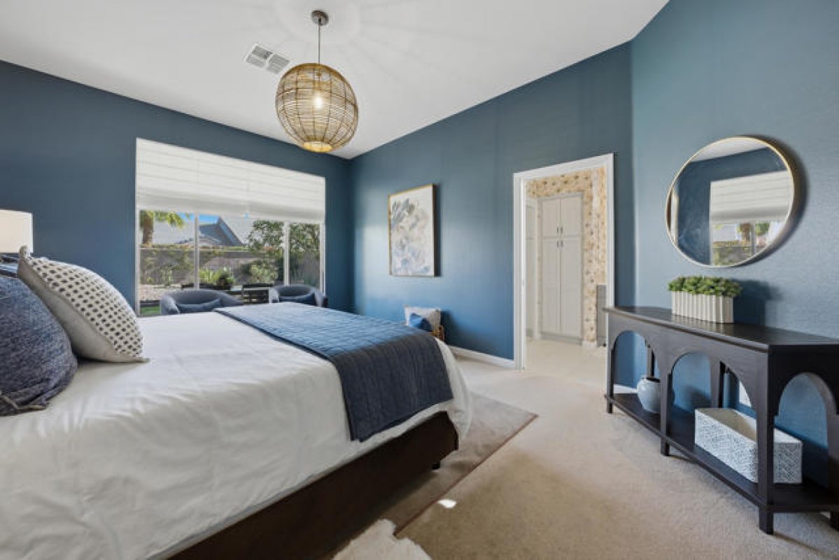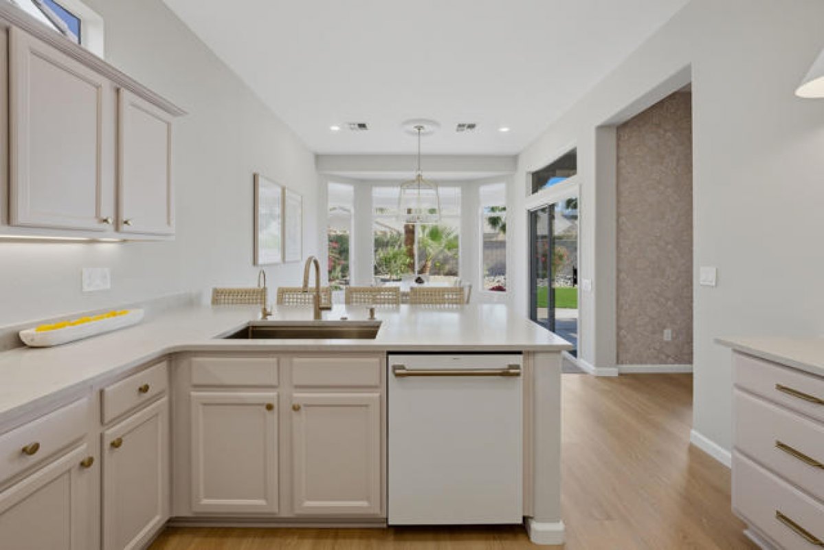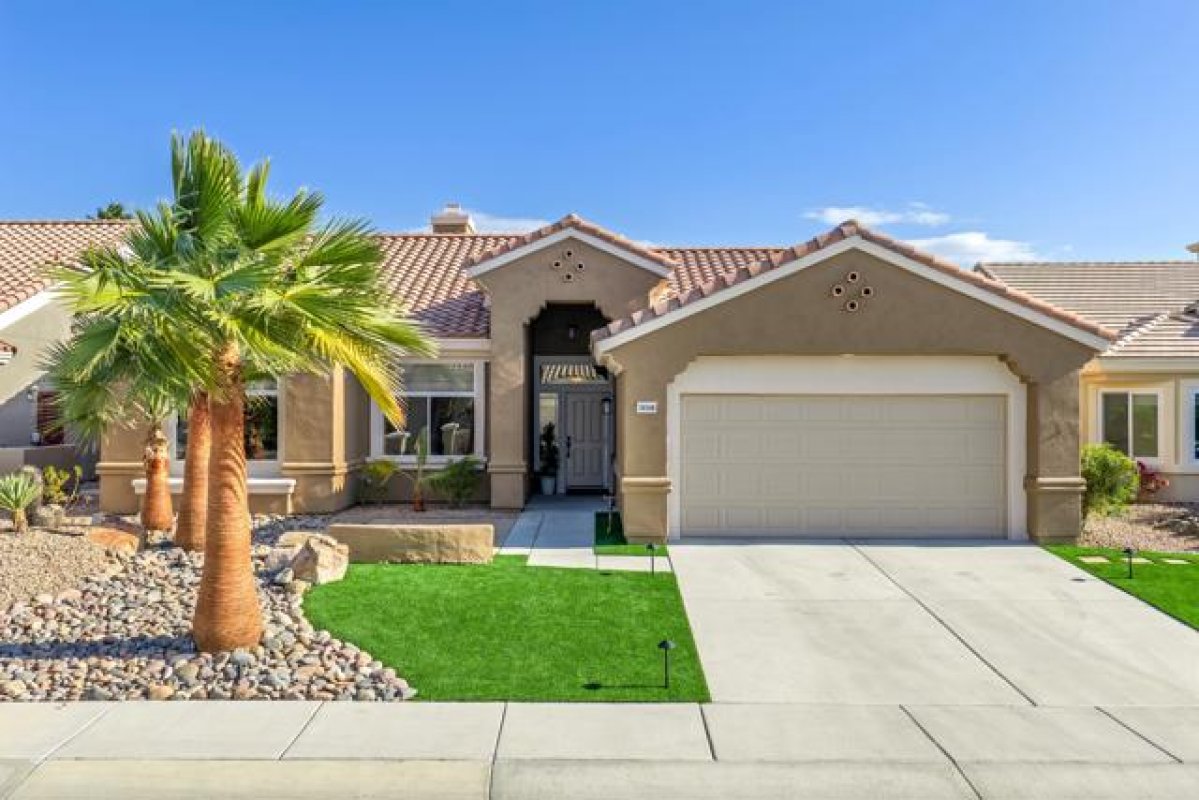 Sun City Palm Desert - Tangier. Beautifully renovated and thoughtfully transformed, this exceptional home is offered fully furnished. Ideally located in the heart of Sun City, just moments from the Sunset View Clubhouse, this residence has been completely re-imagined inside and out, blending modern design with effortless desert living. Inside, 10-foot ceilings and transom windows fill the home with abundant natural light. Vinyl plank flooring runs throughout, complemented by upgraded baseboards, LED lighting, and updated light switches. Upgraded door hardware and dramatic ligh fixtures are found throughout the home. The living room is highlighted by a striking designer light fixture and a fireplace that adds both style and warmth. The redesigned kitchen features upgraded appliances, a single-basin sink, gold fixtures, and refined finishes that pair seamlessly with curated designer wallpaper and furnishings. Double doors open to a den/office, adding both flexibility and style. The primary suite offers upgraded carpet, a pocket door to the bath, a custom walk-in closet with built-in storage, and a beautifully updated bathroom with dual-sink vanity, upgraded mirrors and lighting, and a tiled shower with glass enclosure. The guest bathroom includes a tub/shower combination with tasteful updates. Upgraded door hardware and fixtures are found throughout the home. Outdoors, the transformation continues with a freshly painted exterior, enhanced landscape lighting, desert landscaping, and low-maintenance artificial turf. Thoughtfully selected plantings and inviting outdoor furnishings create an ideal setting for relaxing or entertaining in the desert climate. Additional features include a two-car garage with a dedicated nook for golf cart parking. Impeccably styled and move-in ready, this rare offering allows you to enjoy the Sun City Palm Desert lifestyle immediately.