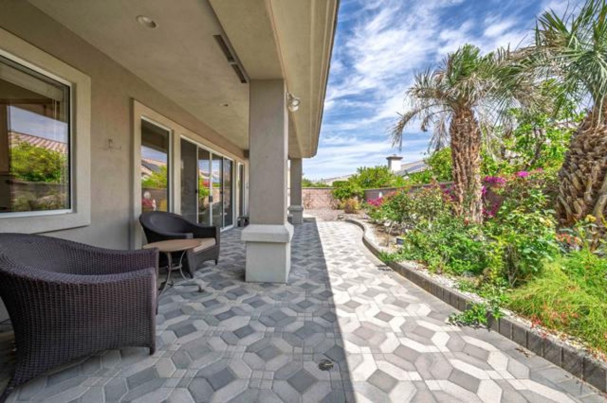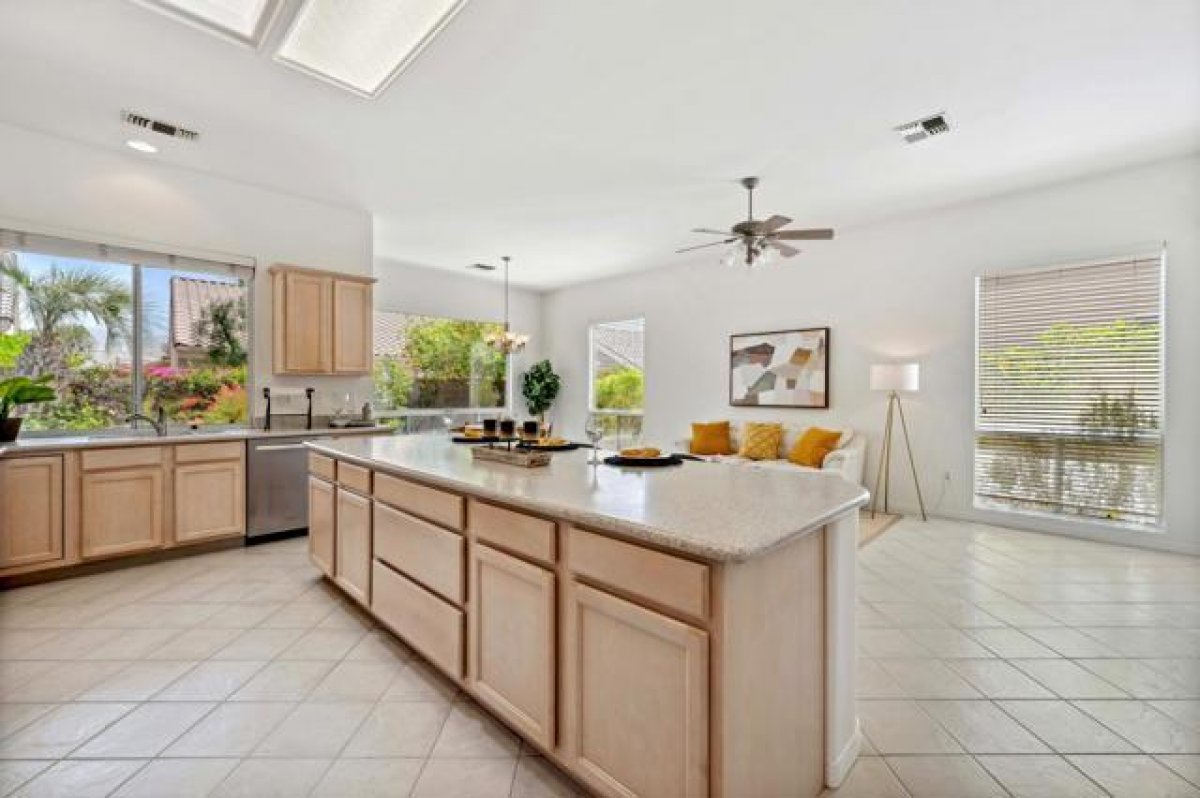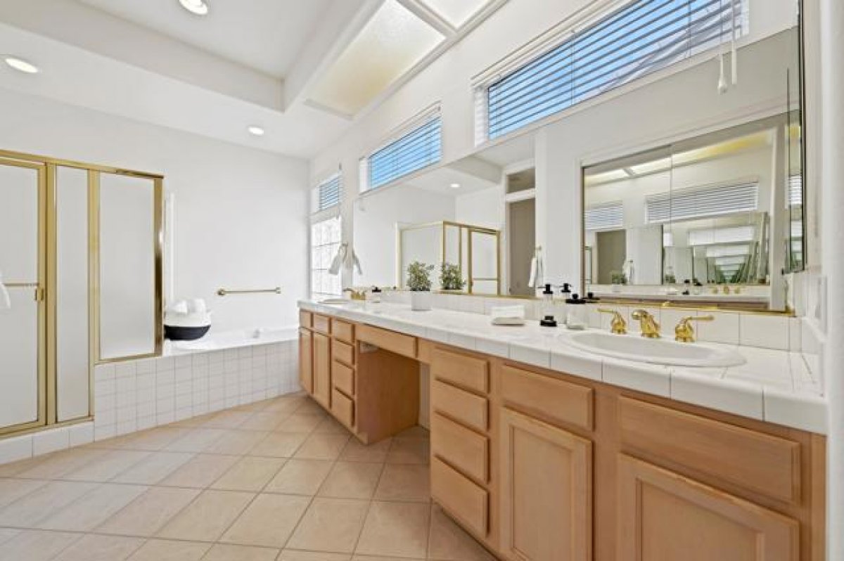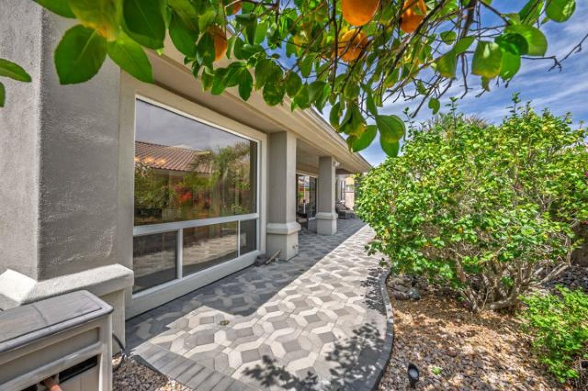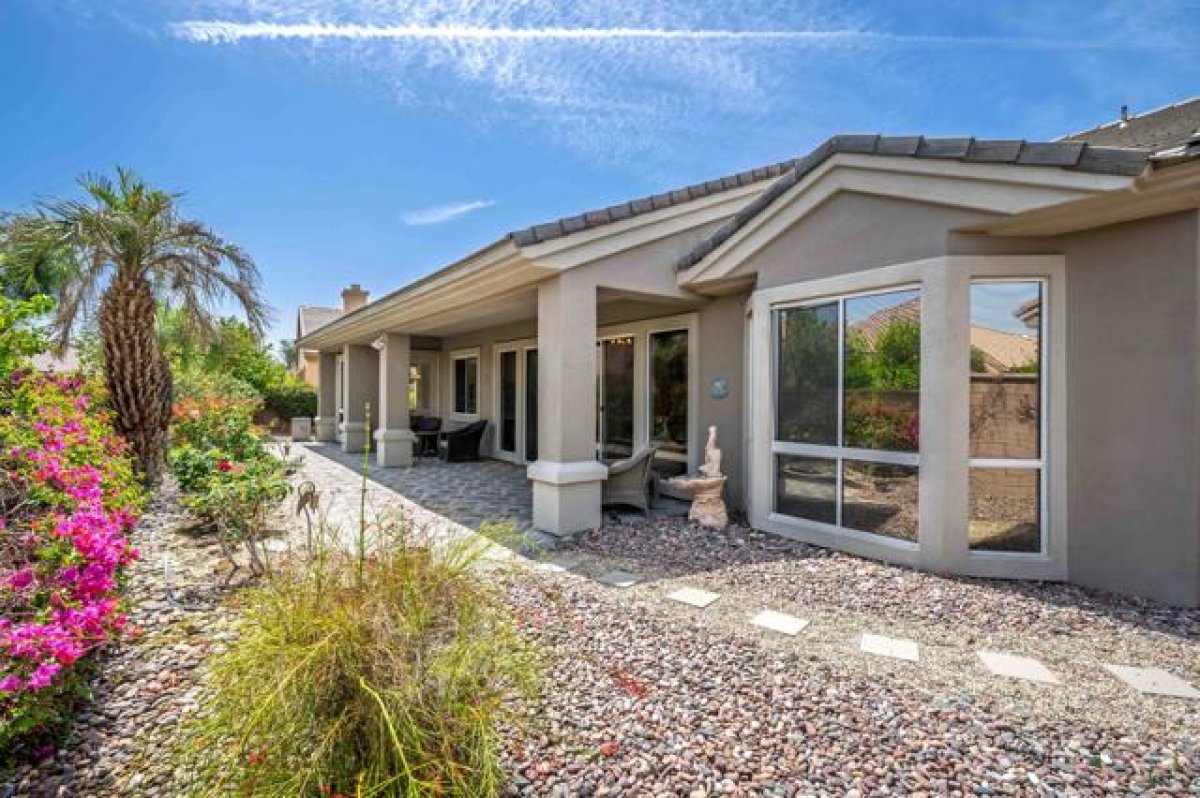 Sun City Palm Desert - Monaco. Conveniently located between the Sunset View and Mountain View clubhouses this estate model home exudes curb appeal with a paver hardscape updated paint scheme and stone accent on the facade. The rear yard is equally appealing with a large paver-patio surrounded by lush desert landscaping. Inside, the home is freshly painted. Diagonally laid tile flooring is used extensively. The greatroom and foyer have 12ft ceilings. 10ft ceilings are elsewhere. The greatroom has a double slider to the rear yard. The kitchen has corian counters with rounded edges, a large chef's island with breakfast bar, and stainless built-in appliances. The family room has a media nook and a door to the rear patio. The office has a custom built-in desk and shelving. The primary suite has a bay window, crown molding and a large walk-in closet with custom built-in storage and mirror doors. The primary suite bathroom has dual sinks, a stall shower with textured glass doors and an oversized tub. The extended guest suite has a shower/tub in its bathroom. Both en suite bathrooms and the powder room have tile surfaces. The extended 2+ golf cart garage has a utility sink, built-in and hanging rack storage
