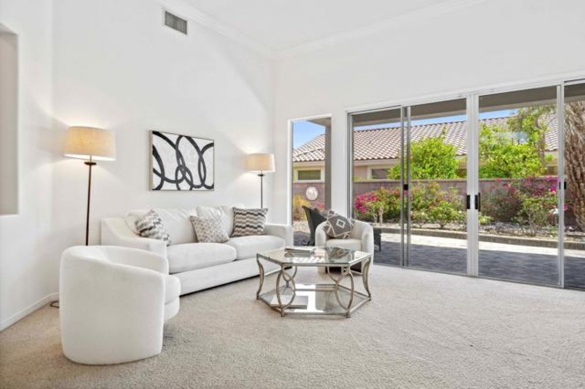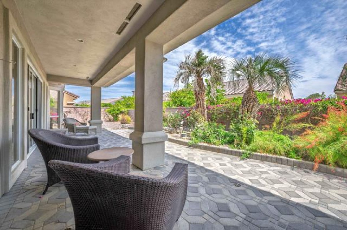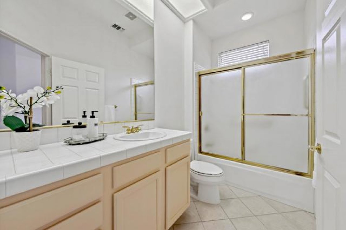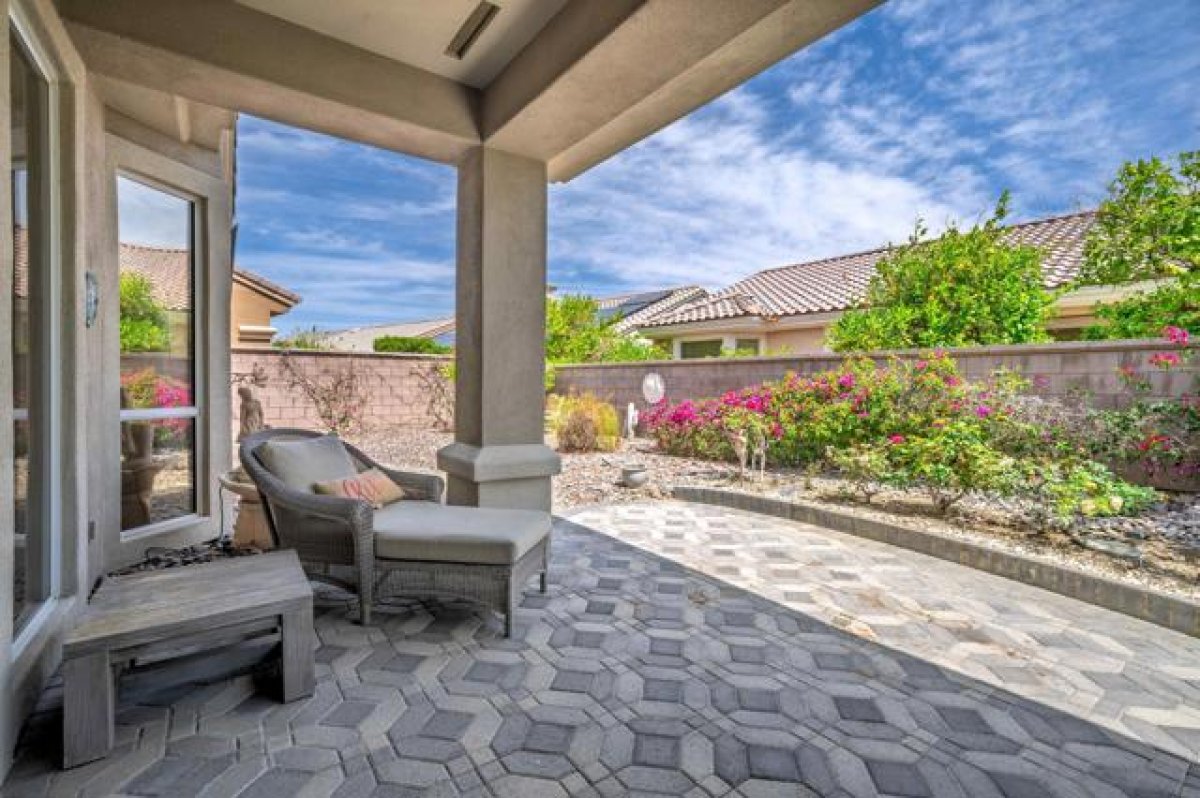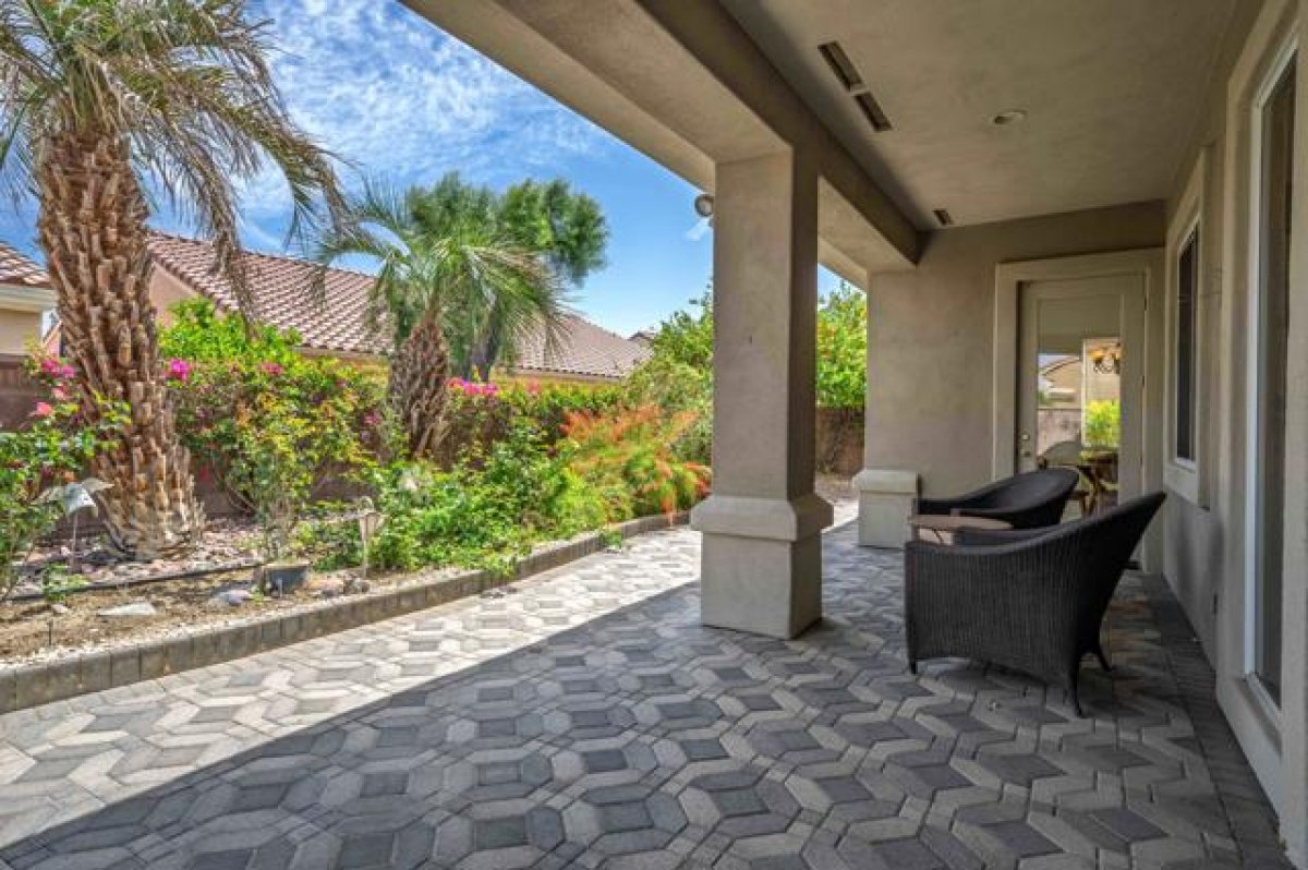 Sun City Palm Desert - Monaco. Conveniently located between the Sunset View and Mountain View clubhouses this estate model home exudes curb appeal with a paver hardscape updated paint scheme and stone accent on the facade. The rear yard is equally appealing with a large paver-patio surrounded by lush desert landscaping. Inside, the home is freshly painted. Diagonally laid tile flooring is used extensively. The greatroom and foyer have 12ft ceilings. 10ft ceilings are elsewhere. The greatroom has a double slider to the rear yard. The kitchen has corian counters with rounded edges, a large chef's island with breakfast bar, and stainless built-in appliances. The family room has a media nook and a door to the rear patio. The office has a custom built-in desk and shelving. The primary suite has a bay window, crown molding and a large walk-in closet with custom built-in storage and mirror doors. The primary suite bathroom has dual sinks, a stall shower with textured glass doors and an oversized tub. The extended guest suite has a shower/tub in its bathroom. Both en suite bathrooms and the powder room have tile surfaces. The extended 2+ golf cart garage has a utility sink, built-in and hanging rack storage