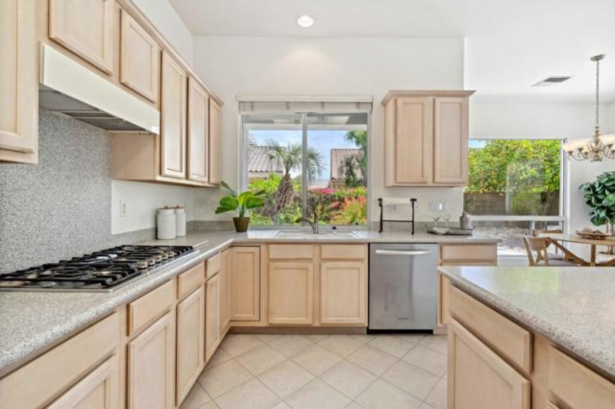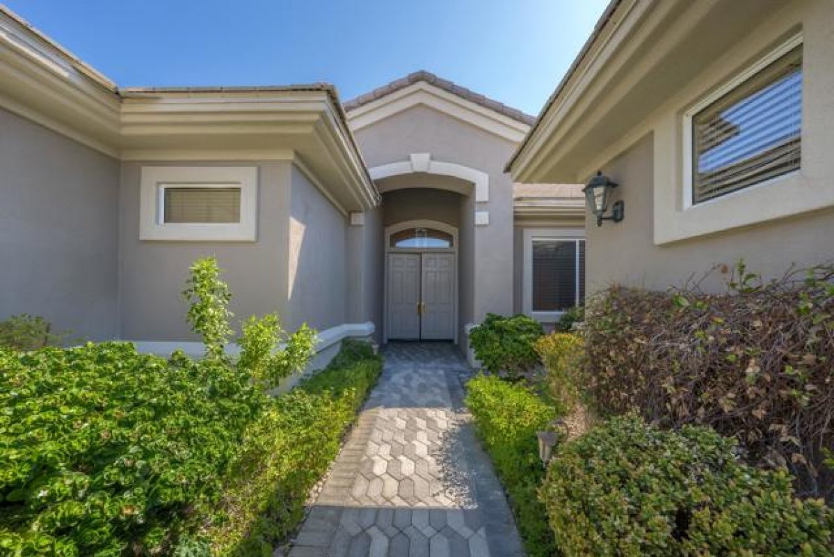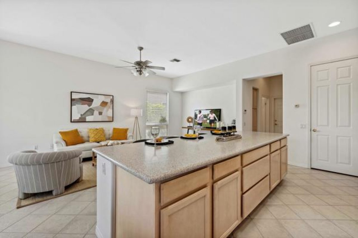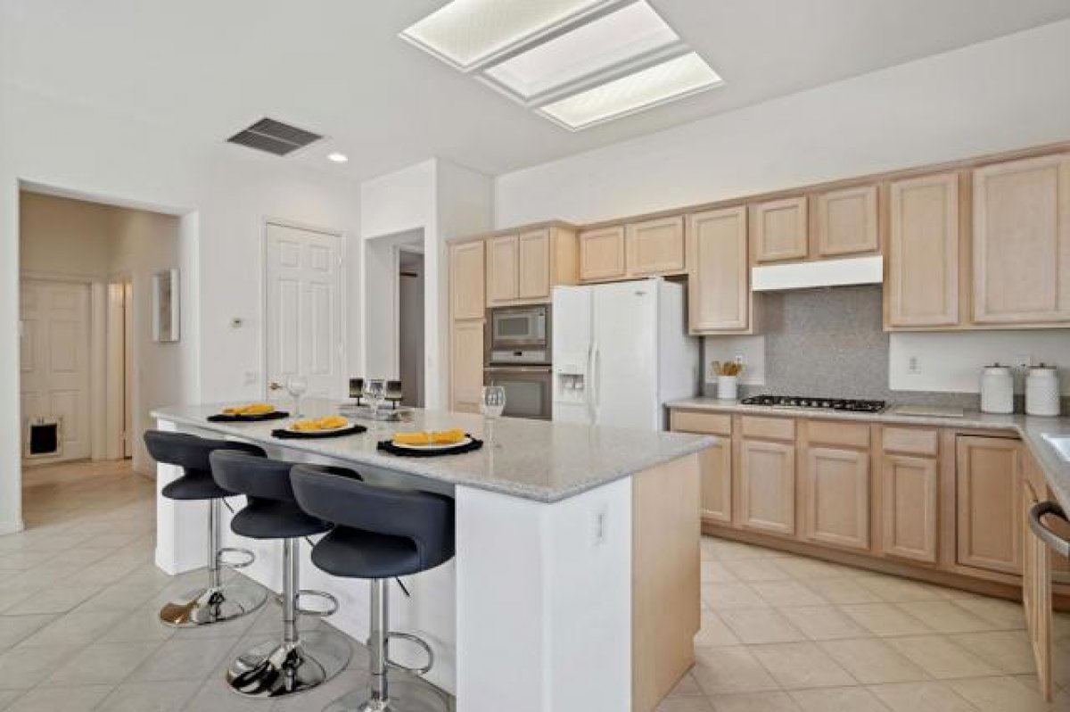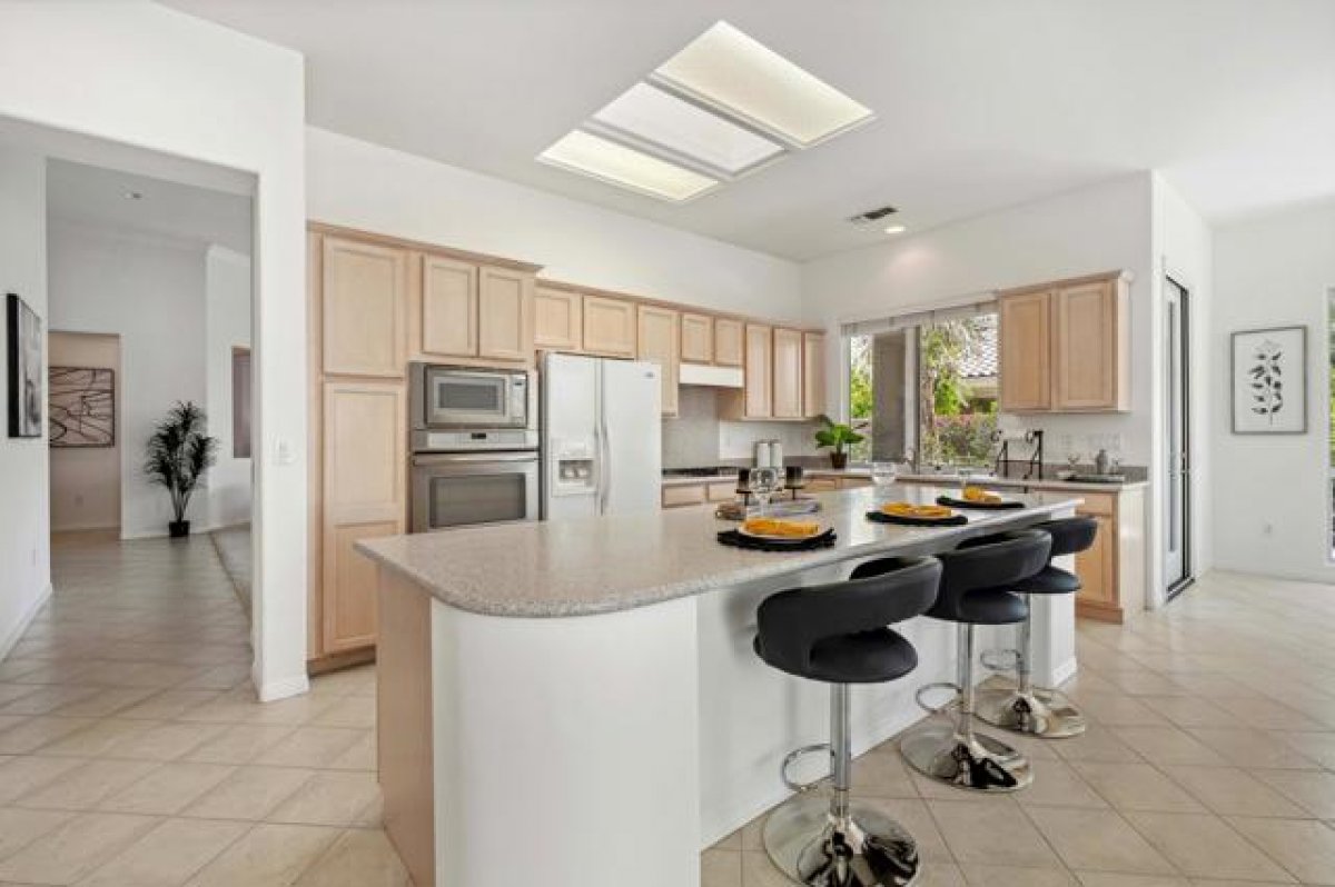 Sun City Palm Desert - Monaco. Conveniently located between the Sunset View and Mountain View clubhouses this estate model home exudes curb appeal with a paver hardscape updated paint scheme and stone accent on the facade. The rear yard is equally appealing with a large paver-patio surrounded by lush desert landscaping. Inside, the home is freshly painted. Diagonally laid tile flooring is used extensively. The greatroom and foyer have 12ft ceilings. 10ft ceilings are elsewhere. The greatroom has a double slider to the rear yard. The kitchen has corian counters with rounded edges, a large chef's island with breakfast bar, and stainless built-in appliances. The family room has a media nook and a door to the rear patio. The office has a custom built-in desk and shelving. The primary suite has a bay window, crown molding and a large walk-in closet with custom built-in storage and mirror doors. The primary suite bathroom has dual sinks, a stall shower with textured glass doors and an oversized tub. The extended guest suite has a shower/tub in its bathroom. Both en suite bathrooms and the powder room have tile surfaces. The extended 2+ golf cart garage has a utility sink, built-in and hanging rack storage