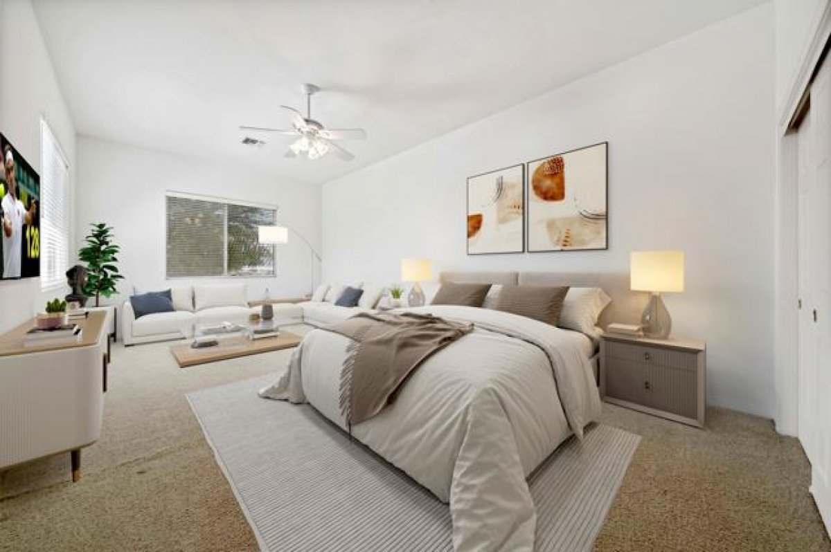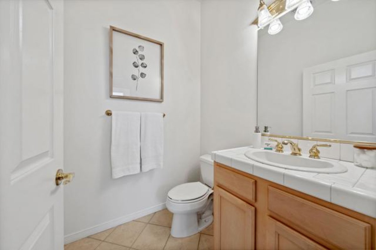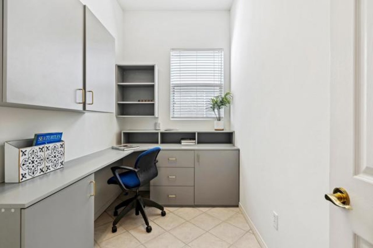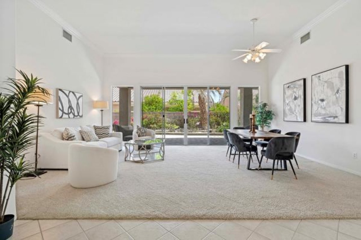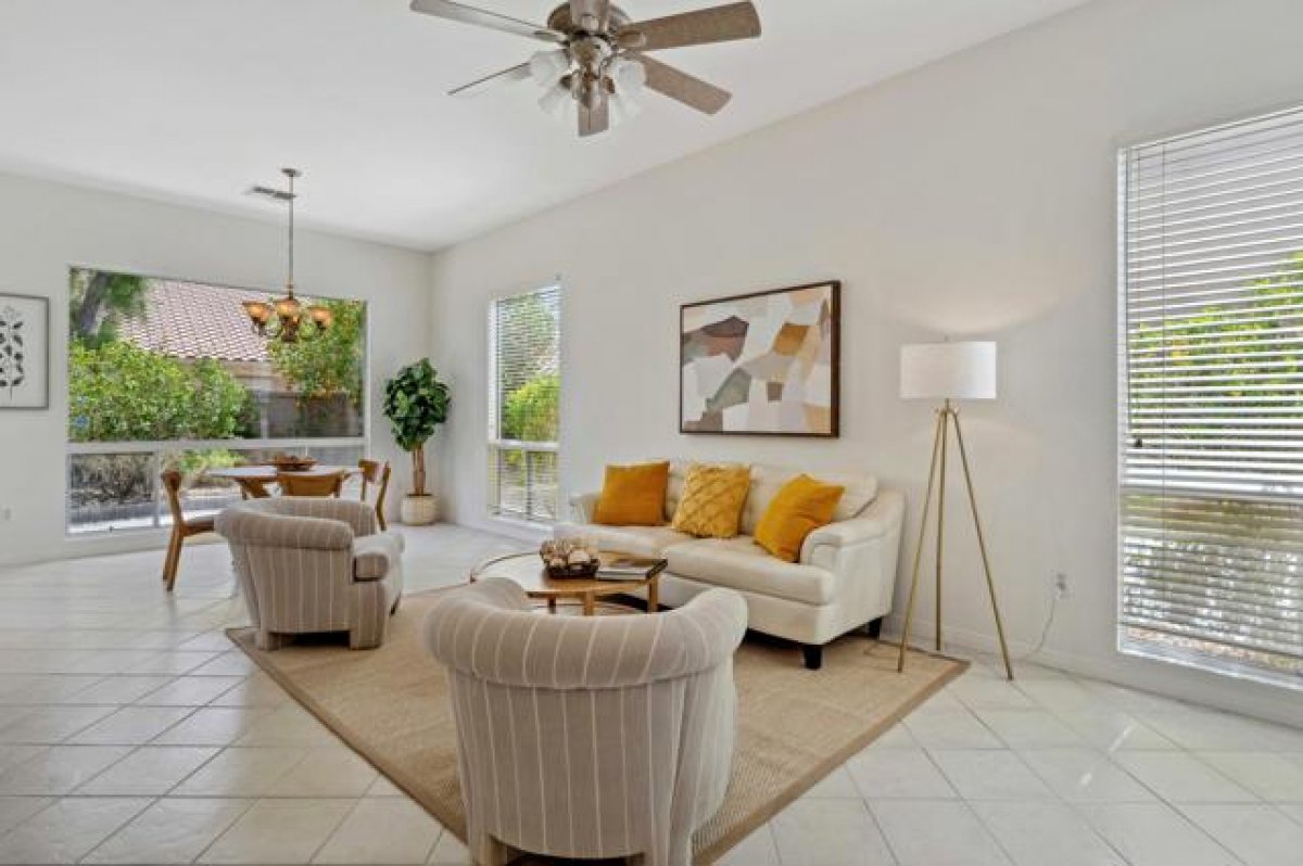 Sun City Palm Desert - Monaco. Conveniently located between the Sunset View and Mountain View clubhouses this estate model home exudes curb appeal with a paver hardscape updated paint scheme and stone accent on the facade. The rear yard is equally appealing with a large paver-patio surrounded by lush desert landscaping. Inside, the home is freshly painted. Diagonally laid tile flooring is used extensively. The greatroom and foyer have 12ft ceilings. 10ft ceilings are elsewhere. The greatroom has a double slider to the rear yard. The kitchen has corian counters with rounded edges, a large chef's island with breakfast bar, and stainless built-in appliances. The family room has a media nook and a door to the rear patio. The office has a custom built-in desk and shelving. The primary suite has a bay window, crown molding and a large walk-in closet with custom built-in storage and mirror doors. The primary suite bathroom has dual sinks, a stall shower with textured glass doors and an oversized tub. The extended guest suite has a shower/tub in its bathroom. Both en suite bathrooms and the powder room have tile surfaces. The extended 2+ golf cart garage has a utility sink, built-in and hanging rack storage