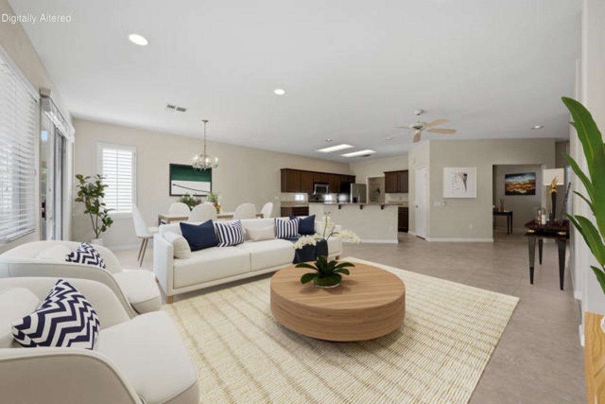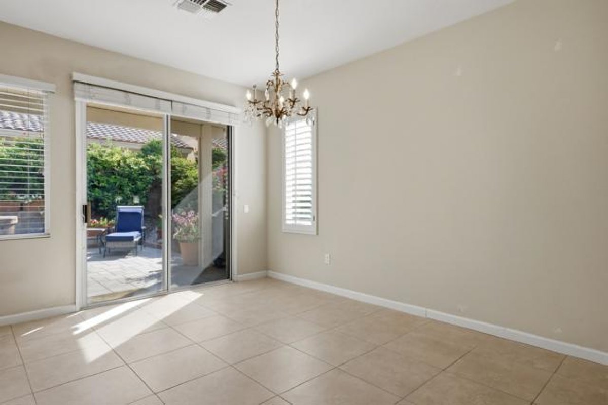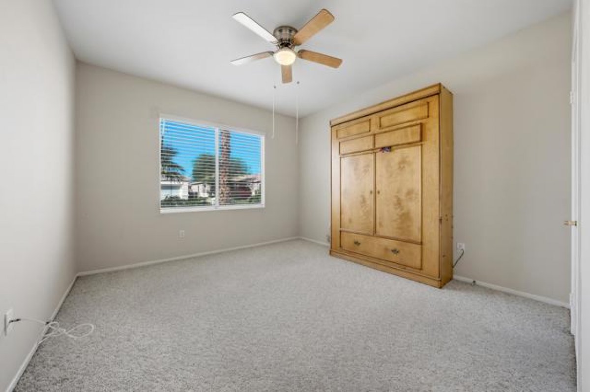 Sun City Palm Desert - St. Maarten. This beautiful home offers exceptional curb appeal with extended hardscape and stunning desert landscaping that create a warm and welcoming first impression. The east-facing rear yard feels like a private garden retreat, featuring an expansive paver patio, lush landscaping, mature citrus trees, an alumawood patio cover, and an above-ground hot tub--perfect for relaxing mornings or entertaining under the desert sky. Inside, the home offers 2 bedrooms, 2 bathrooms, and a versatile den. Tile flooring runs throughout all but the bedrooms, while upgraded baseboards and recessed lighting enhance the great room's open, inviting feel. The den/office sits just off the great room and includes built-in shelving and a solar tube that fills the space with natural light. The kitchen is both stylish and functional with slab granite counters, stainless steel appliances, an island with breakfast bar, pantry, and cabinetry with convenient pull-out shelves. The primary suite provides a peaceful retreat with an ample walk-in closet featuring built-in storage. The ensuite bathroom includes dual sinks and a stall shower with textured glass doors. The guest bedroom offers its own walk-in closet and a Murphy bed for flexible use of space, while the guest bath includes a shower/tub combination. Additional features include a water heater replaced in 2017 and a garage with epoxy flooring and built-in storage. This thoughtfully upgraded St. Maarten blends comfort, efficiency, and inviting indoor-outdoor living in one of the desert's most desirable active adult communities.