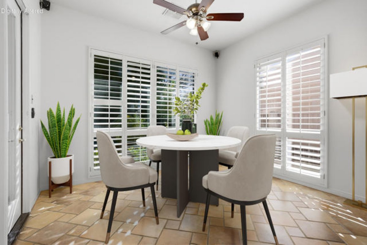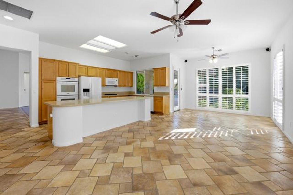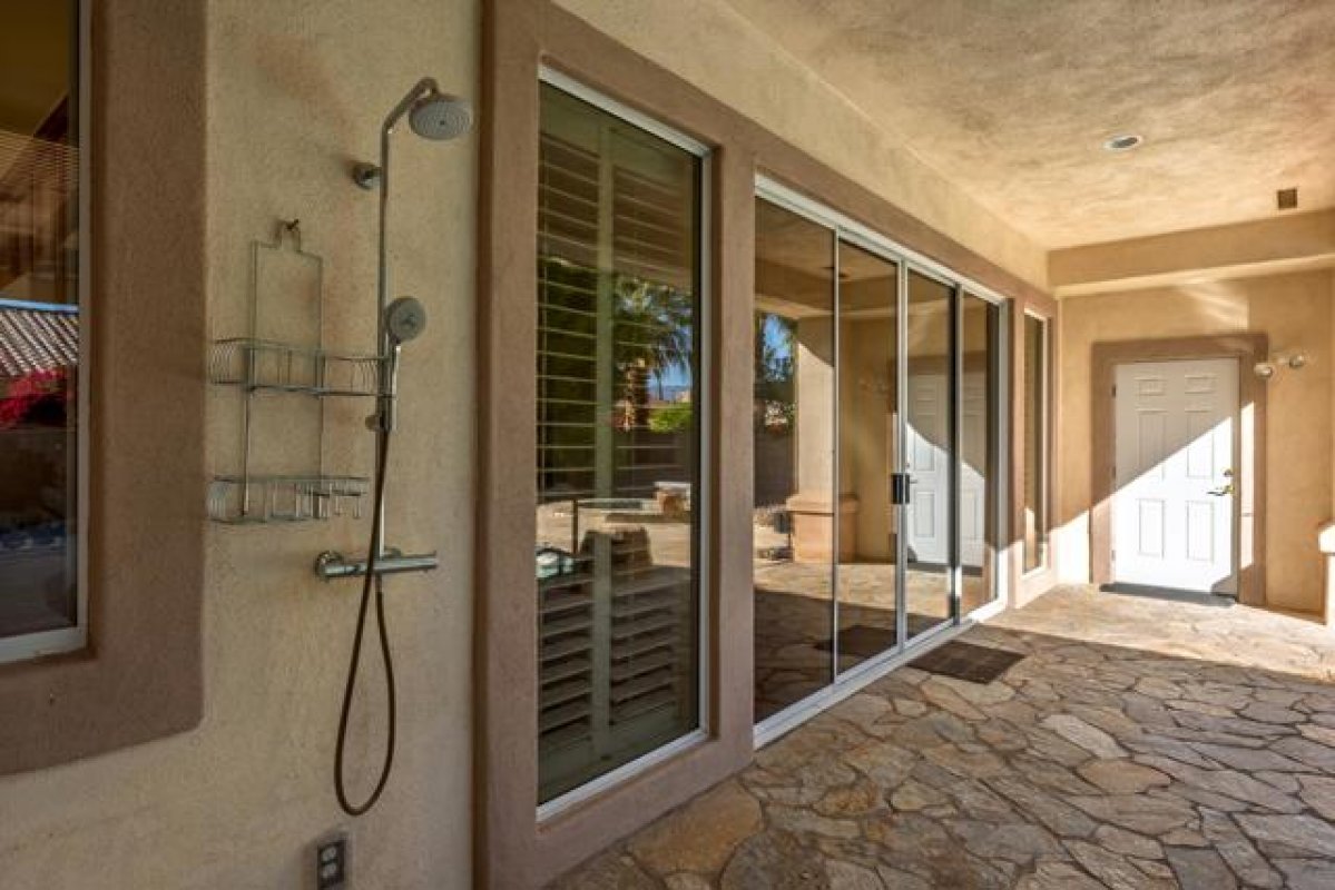 Sun City Palm Desert - Monaco (Extended). Located on a quiet cul-de-sac. this extended Monaco offers exceptional flexibility with three extended suites, including a rare double guest suite -- ideal for hosting guests or accommodating an in-home caregiver. The oversized east-facing rear yard is a true highlight, featuring a pool and spa surrounded by an expansive flagstone patio, lush landscaping, and a built-in BBQ island -- perfect for entertaining or relaxing in privacy. The gated front courtyard and leaded glass entry doors create inviting curb appeal. Inside, 12-foot ceilings elevate the greatroom, while mosaic tile and Pergo flooring, along with plantation shutters throughout, provide a cohesive and upgraded finish. The kitchen is designed for both function and gathering, featuring composite counters, a large island with breakfast bar, double wall ovens, a spacious pantry, and a skylight that fills the space with natural light. The extended primary suite offers direct access to the rear patio, a walk-in closet with built-in storage plus a bonus closet. The ensuite bath includes dual sinks with a sitting vanity, a walk-in shower, and a separate stall shower with textured glass doors. The double guest bedroom suite includes a wet bar, two closets, and a private bath with shower/tub combination. The additional extended guest suite also has its own shower/tub bathroom. A separate utility space or office adds even more versatility. The 2+ golf cart garage includes built-in cabinetry and overhead hanging rack storage. One AC unit was replaced in 2025, the other in 2013. A rare extended Monaco offering space, privacy, and resort-style outdoor living.