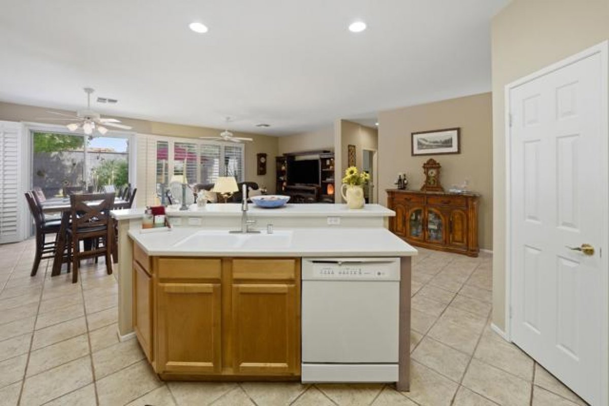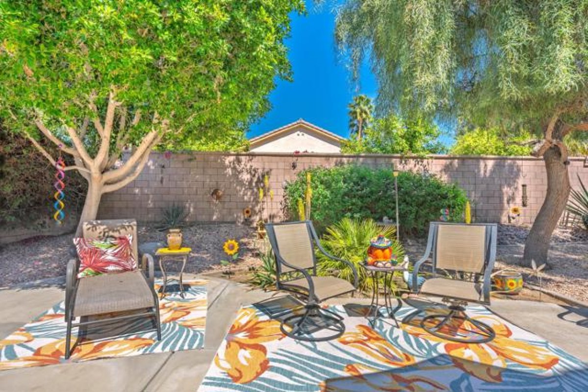 Sun City Palm Desert - St. Maaten. This St. Maarten greatroom home sits on a quiet cul-de-sac in the heart of the community, just a block from the Sunset View Clubhouse with its pool, restaurant, and bocce courts--making it easy to enjoy the resort-style lifestyle every day. The home features a spacious north-facing rear yard with an expansive patio and lush, low-maintenance desert landscaping--an ideal setting for relaxing or entertaining. Attractive curb appeal is enhanced by beautifully maintained landscaping with artificial turf. Inside, tile flooring is used throughout the home (no carpet), including wood-look tile in the bedrooms and den. Plantation shutters are also featured throughout. The kitchen opens to the greatroom and includes an island with breakfast bar, corian counters, a pantry, and light maple cabinetry that continues into the bathrooms and linen storage. A spacious den/office sits just off the greatroom, providing flexible living space. The primary suite features a bay window and a large walk-in closet. Its ensuite bathroom has dual sinks, cultured marble surfaces, and a stall shower with glass enclosure. The guest bathroom includes a tub/shower combination. Additional features include a laundry room with built-in storage and an extended 2-car garage with ample storage space. This well-located home combines comfort, functionality, and easy access to the many amenities that make Sun City Palm Desert such a desirable place to live.