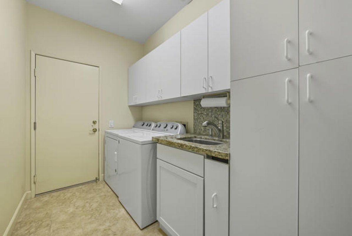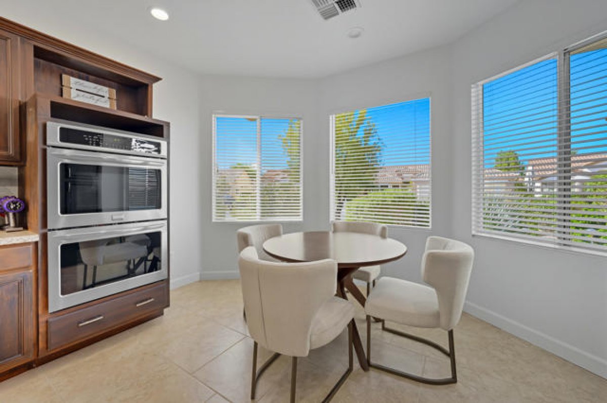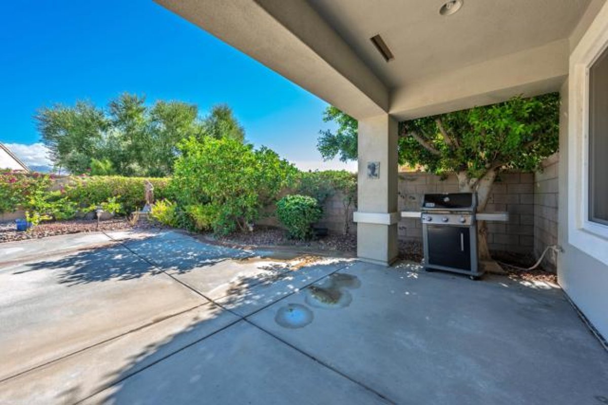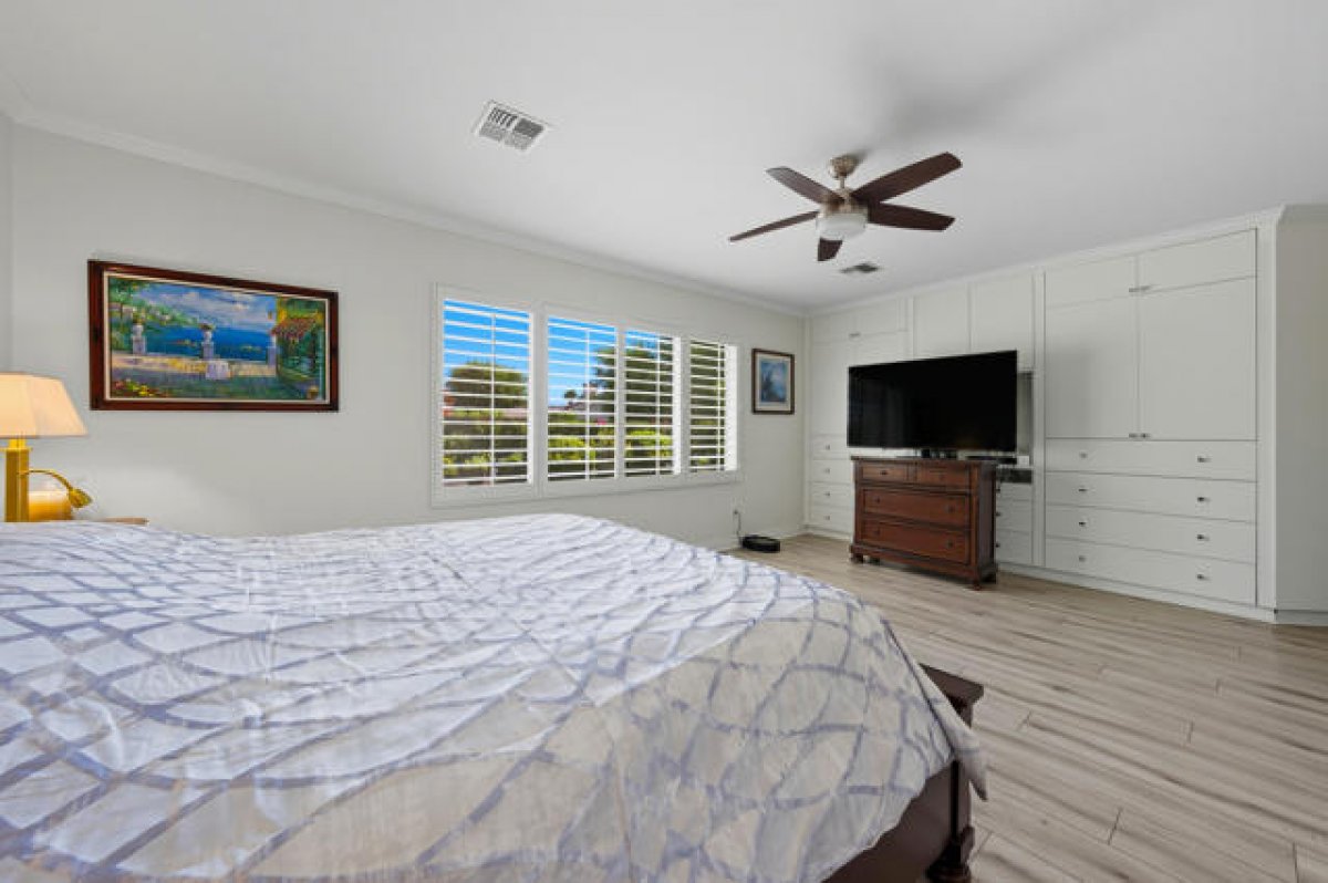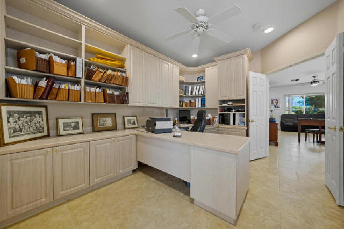 Sun City Palm Desert - St. Croix. This sought-after floorplan features 2 bedrooms, 2 bathrooms, a den, hobby/bonus room, and a 2-car plus golf cart garage. The north-facing rear yard offers privacy with no homes flush behind, lush desert landscaping including citrus, peekaboo mountain views, and an expanded patio for outdoor living. Curb appeal is enhanced by an updated paint scheme and leaded-glass entry door. Inside, 19-inch tile flooring runs throughout the main living areas, while the bedrooms feature vinyl plank. Upgraded baseboards and extensive crown molding add a refined touch. The greatroom boasts an upgraded slider and windows framing the rear yard. Double doors lead to a den with custom built-ins, while a pocket door opens to the hobby/bonus room, also equipped with built-in desk and shelving. The kitchen showcases abundant cabinetry with pullout shelves, a chef's island, breakfast bar, stainless appliances including double wall ovens, slab granite counters, tile backsplash, and upgraded fixtures. The primary suite offers a spacious retreat with custom built-in cabinetry, media center, shutters and a walk-in closet with built-in storage. Its spa-like bath includes a floating vanity with granite counter, upgraded dual sinks, lighting, and a custom tile shower with rimless glass enclosure. The guest bath is equally upgraded with a floating granite vanity, modern fixtures, and a tub/shower with glass enclosure. The laundry room provides ample cabinetry, granite counters, and a utility sink. Completing the home is a 2+ car garage with golf cart space and abundant storage.