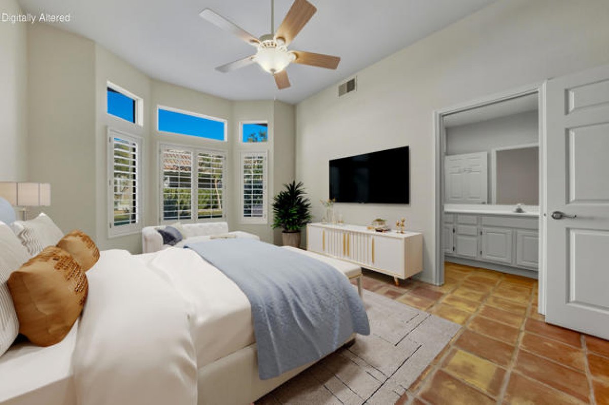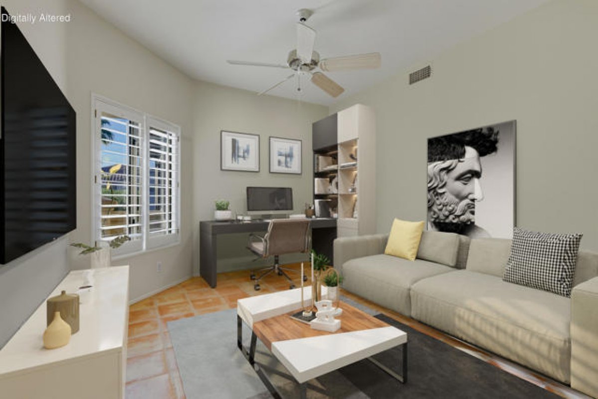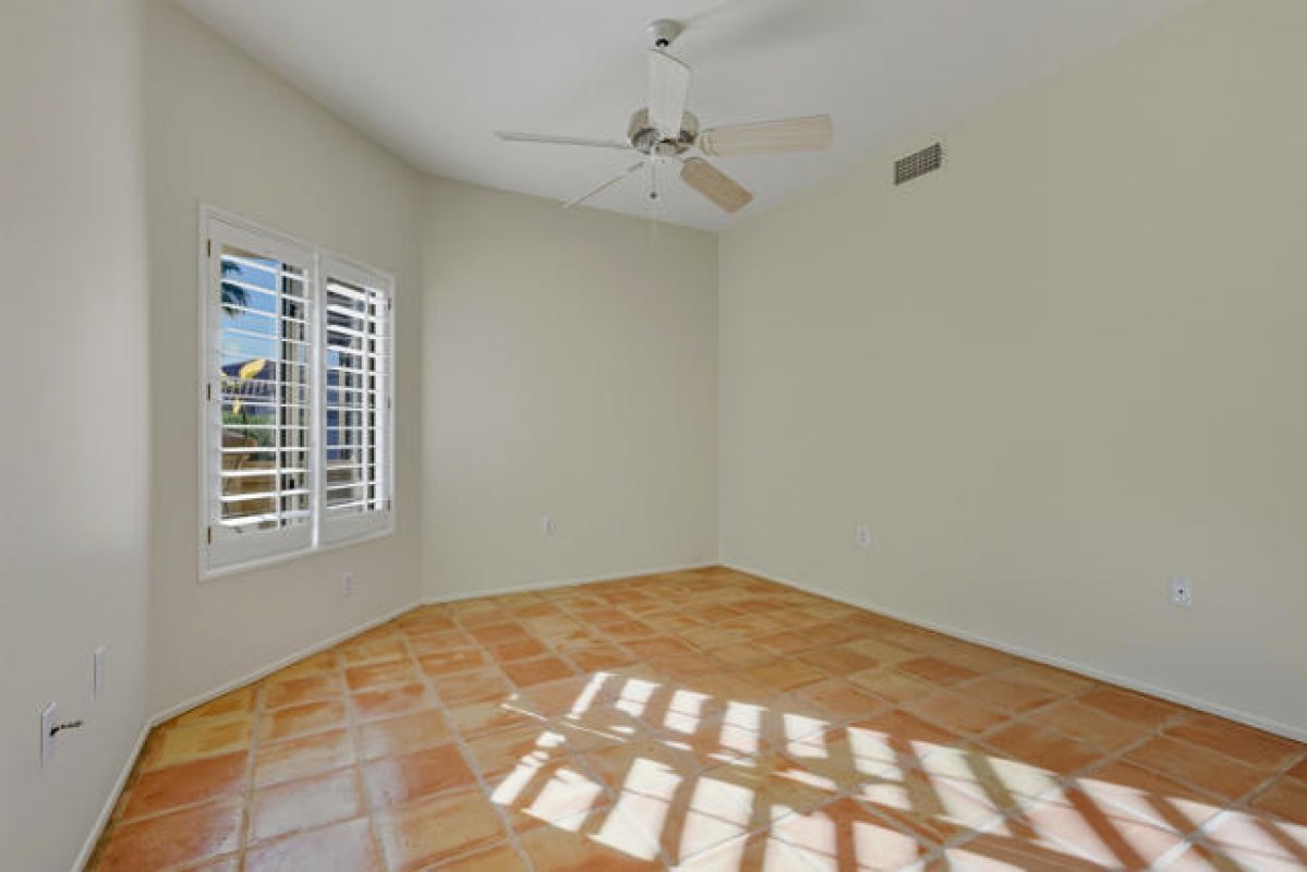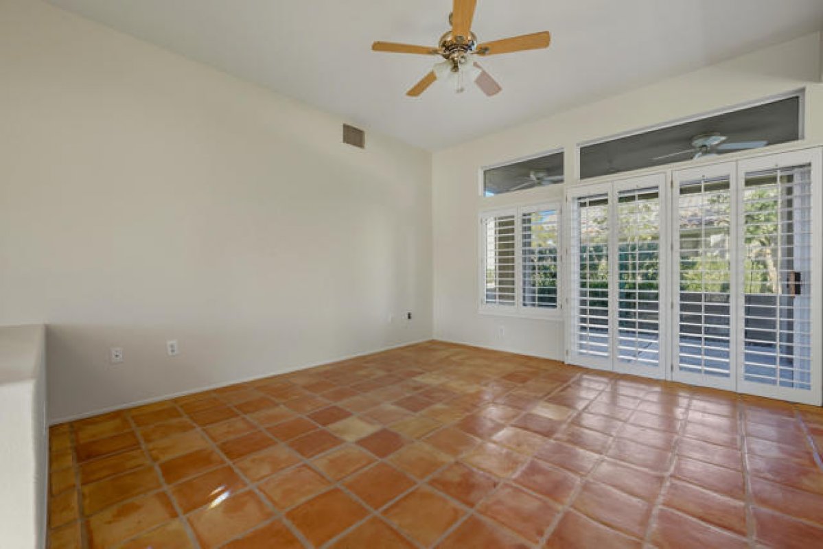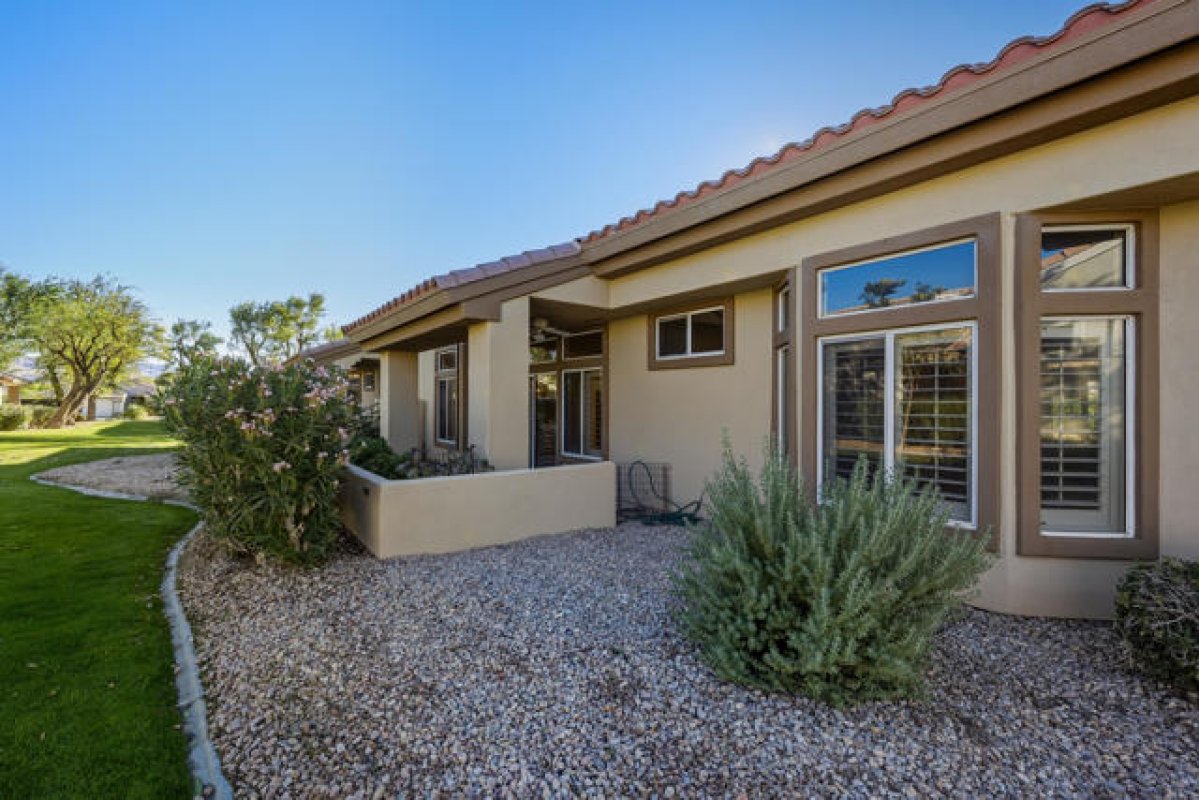 Sun City Palm Desert - Garnet. Beautifully appointed and perfectly located, this home sits in one of Sun City's most desirable neighborhoods--where the HOA maintains the common-area landscaping, stucco, and roof for truly carefree living. Just a short distance from both the Mountain View and Sunset View Clubhouses, the property offers convenient access to the community's premier amenities. Positioned along a lush greenbelt, the north-facing rear patio provides a peaceful setting for relaxing or entertaining amid mature landscaping. A gated, south-facing front courtyard with lemon tree adds curb appeal and an additional outdoor living space for morning coffee and watching hummingbirds. Inside, Saltillo tile flooring and plantation shutters create warm, timeless character. Transom windows and a leaded-glass front door fill the home with natural light. The interior has been freshly painted including the solid wood shutters and kitchen cabinets. The kitchen features corian counters and stainless appliances. The spacious living room opens to the rear patio, while an adjoining den/office can serve as a third bedroom. The primary suite offers a bay window, a large mirrored wardrobe closet, and an en-suite bath with dual sinks and a glass-enclosed stall shower. The guest bathroom includes a tub/shower combination, with both baths finished in cultured marble. Additional highlights include a small office/desktop are for bill paying, a spacious two-car garage with lots of built-in storage and a utility sink, plus a newer AC (2018). Washer and dryer included.