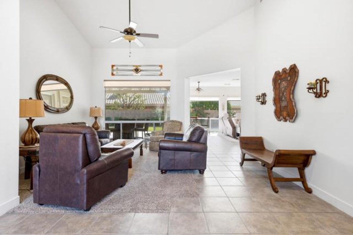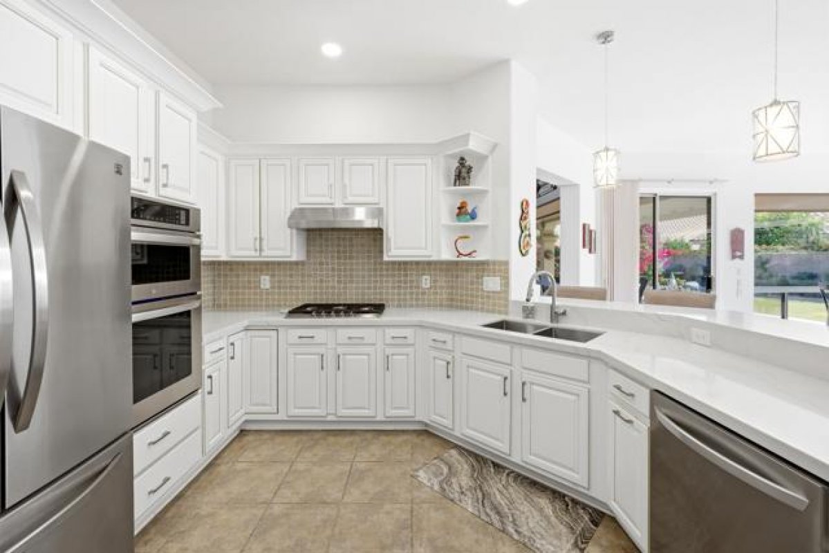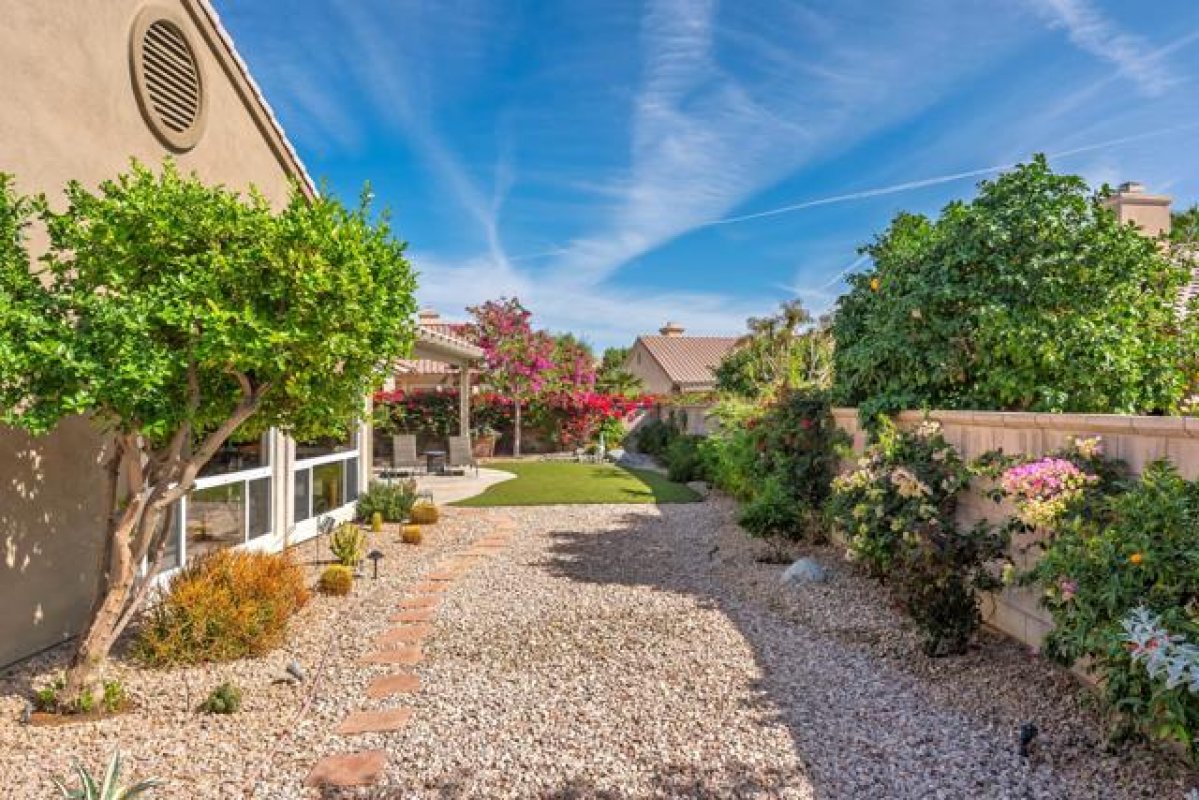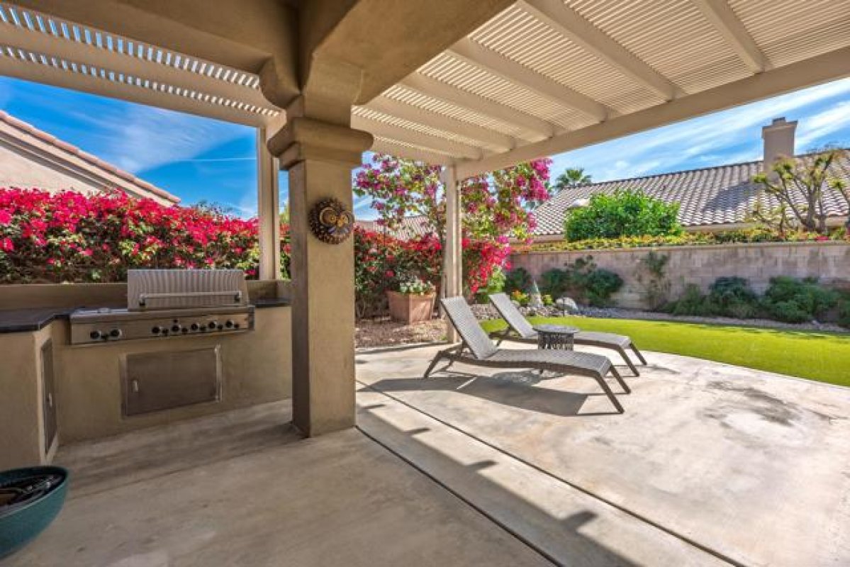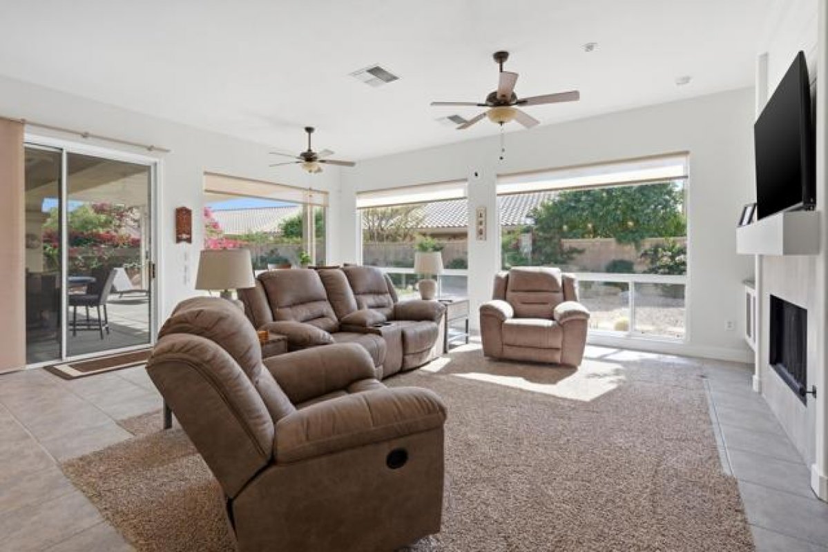 Sun City Palm Desert - San Remo. This beautifully upgraded home offers exceptional curb appeal with a refreshed paint scheme, meticulously maintained desert landscaping, and a gated front courtyard that creates both privacy and charm. Leaded glass French doors with a transom window provide a grand first impression. Inside, the greatroom stuns with a soaring vaulted ceiling approaching 14 feet and expansive tile flooring throughout much of the home. Large picture windows in both the living and family rooms flood the space with natural light while framing views of the lush south-facing rear yard. Solar shades throughout add comfort and efficiency. The family room features a custom floating built-in with shelving and a tile-trimmed gas fireplace, creating a stylish yet inviting focal point. The updated kitchen is thoughtfully designed with quartz countertops, a mosaic tile backsplash, stainless appliances including double wall ovens, a breakfast bar, raised panel cabinetry with pull-out shelves, and a large pantry with pull-out storage behind frosted French doors--ideal for both everyday living and entertaining. The primary suite enjoys a bay window overlooking the patio and a huge walk-in closet with custom built-in organization. Its spa-inspired bathroom showcases an underlit floating vanity with dual sinks, quartz counters, upgraded fixtures, designer lighting and mirrors, plus a spectacular walk-in shower with dual showerheads, custom tile surround, and rimless glass enclosure. On the opposite side of the home, the private guest wing includes two bedrooms and a beautifully updated bathroom featuring a quartz vanity and a tiled stall shower with textured glass doors. A stylish powder room with floating vanity and upgraded finishes serves guests with ease. The laundry room offers built-in storage and a utility sink. The extended 2-car plus golf cart garage is equally impressive with epoxy flooring, built-in storage, overhead racks, its own A/C (new in 2024), and abundant workspace. Major system upgrades provide peace of mind, including two new Bosch air-conditioning units, Rheem furnaces, and a water heater--all installed in 2024. The spacious south-facing rear yard is designed for relaxation and entertaining with an extended patio, alumawood cover, artificial turf, lush landscaping, and a built-in barbecue--your own private desert retreat.