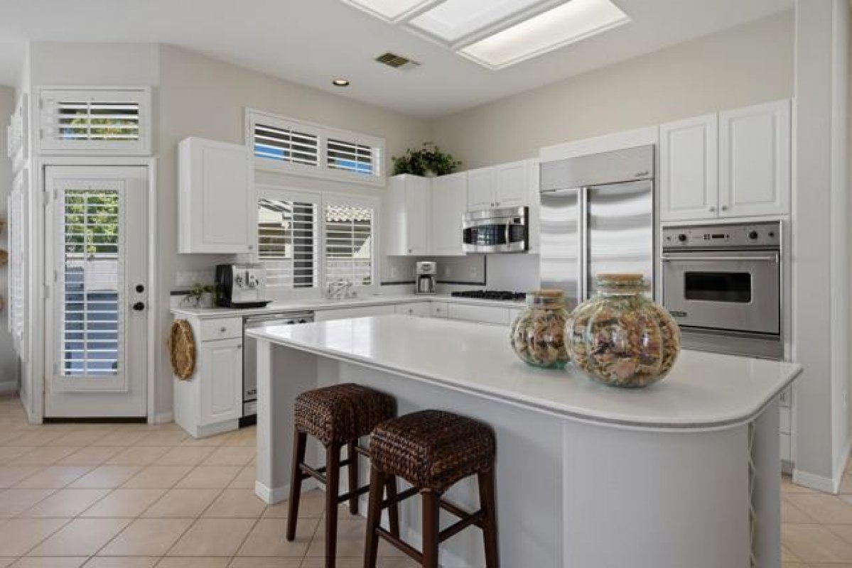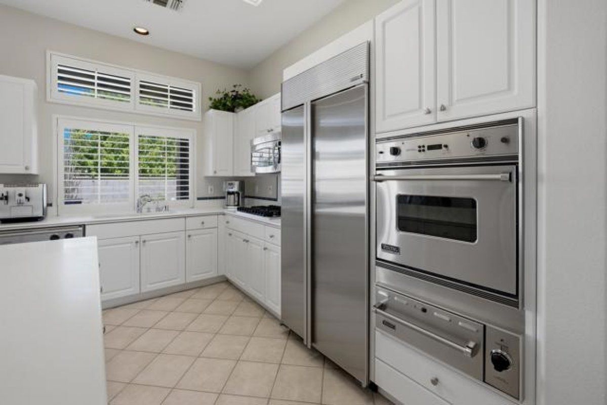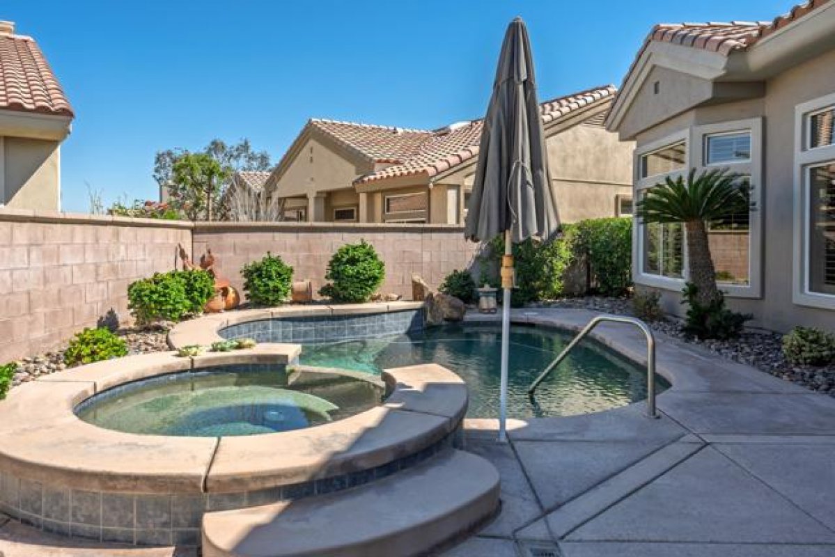 Sun City Palm Desert - Emerald. Ideally located near the Mountain View Clubhouse, this estate-model home sits on a one-of-a-kind oversized pie-shaped yard that provides an open and spacious fee and is in better condition than the day it was built. The north-facing rear yard is designed for resort-style outdoor living with a pebbletec pool with cascading spillover spa, gas fire pit, barbecue island and generous patio space for relaxing or entertaining. Exceptional curb appeal is highlighted by a gated front courtyard, double-door entry, updated paint scheme and salt-finished hardscape. Offered furnished. Inside, diagonally laid tile flooring runs throughout. The foyer and greatroom feature dramatic 12-foot coffered ceilings with uplighting, creating a light and open environment. Shutters are used throughout the home. The spacious kitchen has corian counters, a chef's island with breakfast bar, skylight, raised panel cabinetry with pullout shelves, and stainless appliances including Viking and Sub-Zero. The adjacent family room features a custom built-in media center. The primary suite has a bay window and a large walk-in closet with mirrored wardrobe doors. The primary bathroom includes dual sinks, a sitting vanity, skylight, stall shower with textured glass doors and an oversized spa tub with cultured marble surfaces. The guest suite also has mirrored wardrobe doors and an ensuite bathroom with shower/tub and tile surrounds. The guest bedroom includes a custom built-in desk and shelving along with French doors that open to the front courtyard. Additional features include a laundry room with utility sink and extensive cabinetry, a 2+ golf cart garage with abundant built-in storage, dual American Standard A/C systems new in 2017 and a 50-gallon water heater installed in 2016. This beautifully maintained home combines space, quality and an outstanding location within Sun City Palm Desert.