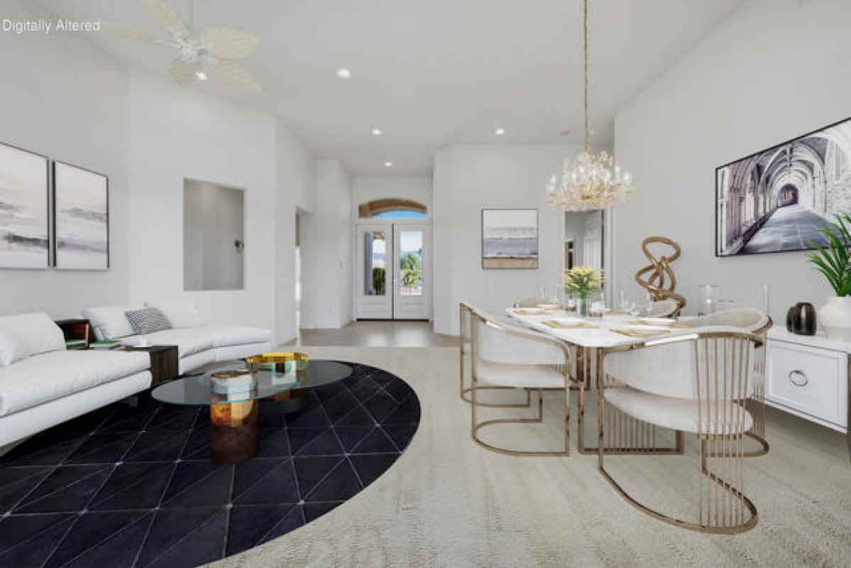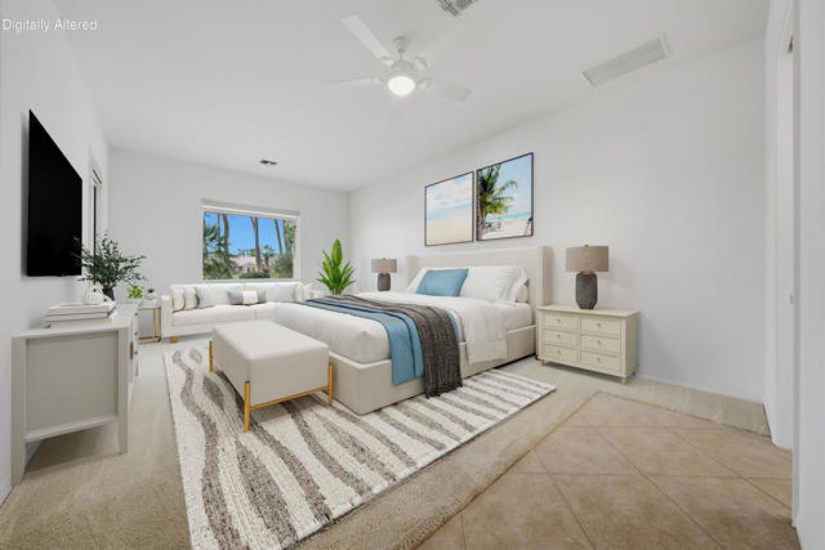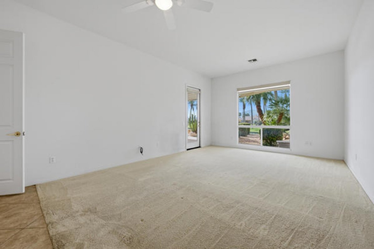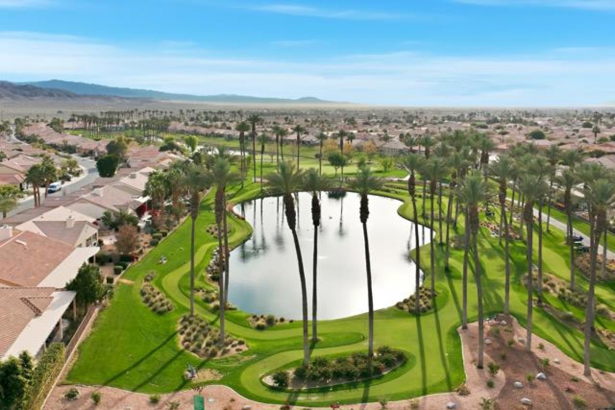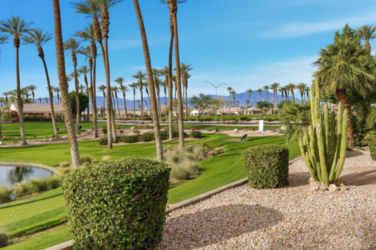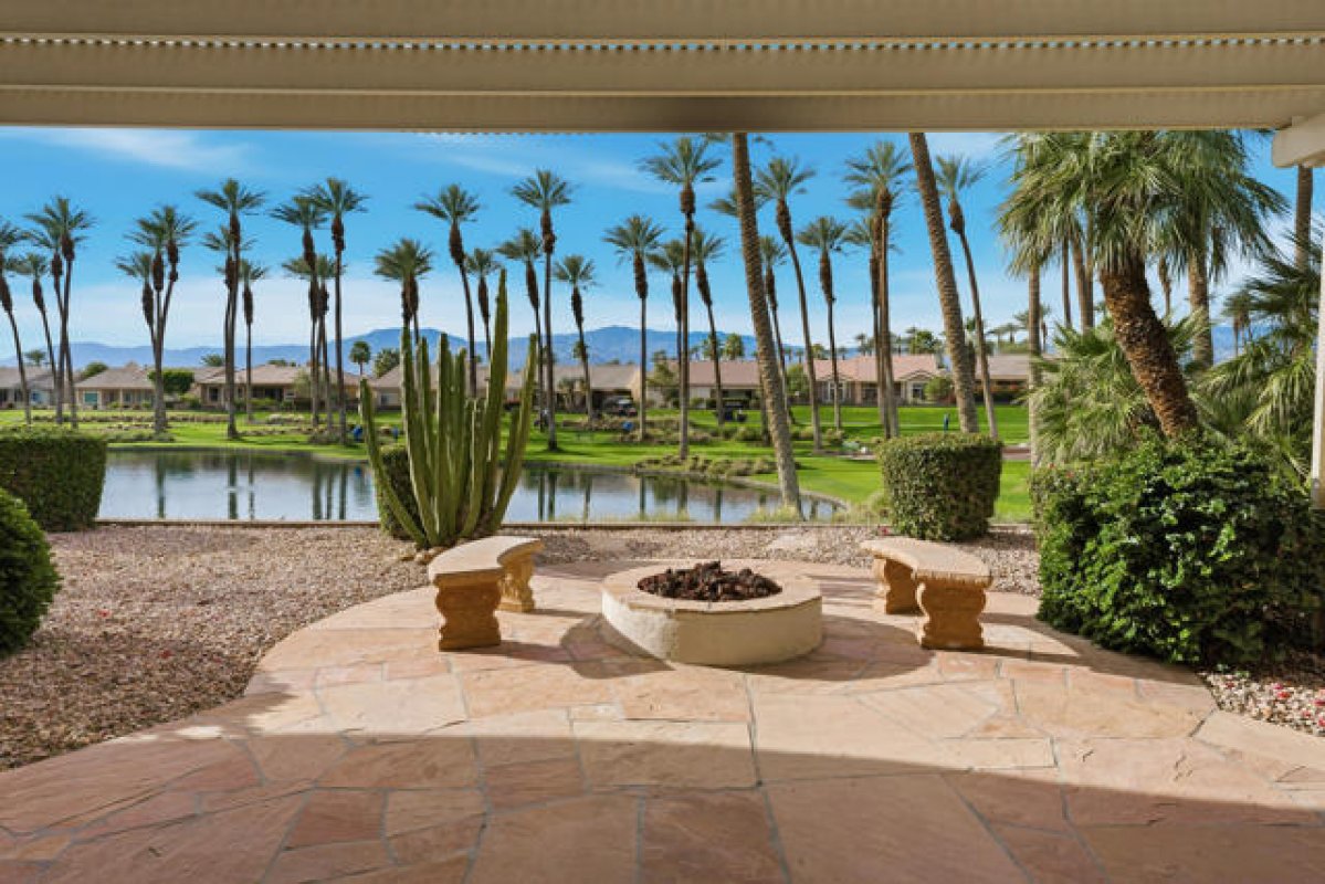 Sun City Palm Desert - Monaco. Set in a truly fabulous location overlooking the 18 hole putting course and just around the corner from the Lakeview Fitness Center and pool, this exceptional Monaco model captures the best of desert resort living. An elevated, south-facing rear yard features a flagstone patio with firepit and offers panoramic views of the putting course, lake, and surrounding mountains--an ideal setting for both relaxation and entertaining. A gated front courtyard and glass front doors create inviting curb appeal while filling the interior with natural light. Inside, the home impresses with soaring 12-foot ceilings in the foyer and great room, complemented by 10-foot ceilings throughout the rest of the home. Large-format 20-inch tile is featured in all living areas except the great room and bedrooms. The great room showcases expansive views through a double slider that opens to the rear patio, seamlessly blending indoor and outdoor living. The adjacent family room offers a cozy gathering space with a tile-trimmed gas fireplace. The kitchen is thoughtfully designed with extended maple cabinetry featuring an antiqued finish and pullout shelves, stainless steel appliances, a large chef's island, skylight, under-cabinet lighting, smooth glass electric cooktop (plumbed for gas), and a wall oven. Matching maple cabinetry continues throughout the bathrooms and laundry room. This well-designed home offers three bedrooms, each with an ensuite bathroom. The extended primary suite features a door to the rear patio, a spacious walk-in closet, and a luxurious ensuite bath with spa tub, dual sinks with sitting vanity, tile surfaces, and a stall shower with rimless glass enclosure. The extended guest suite includes French doors to the front courtyard and an ensuite bath with stall shower, rain glass doors, and tile finishes. A third guest suite also features an ensuite bath with stall shower and rain glass doors. Additional highlights include a laundry room with abundant storage and utility sink, a gigantic 2+ golf cart garage, recirculating hot water, and dual air-conditioning systems replaced in 2019. An exceptional opportunity to enjoy views, privacy, and close proximity to premier amenities in one of Sun City Palm Desert's most desirable settings.