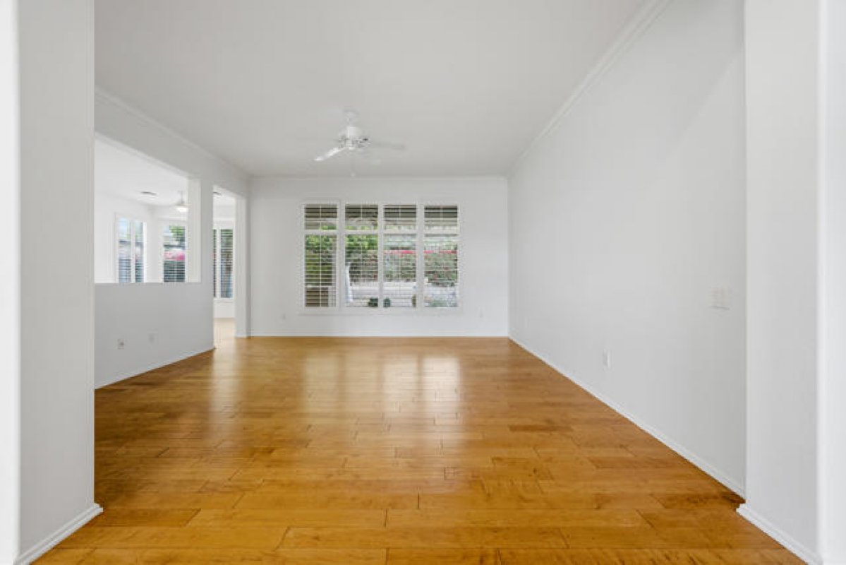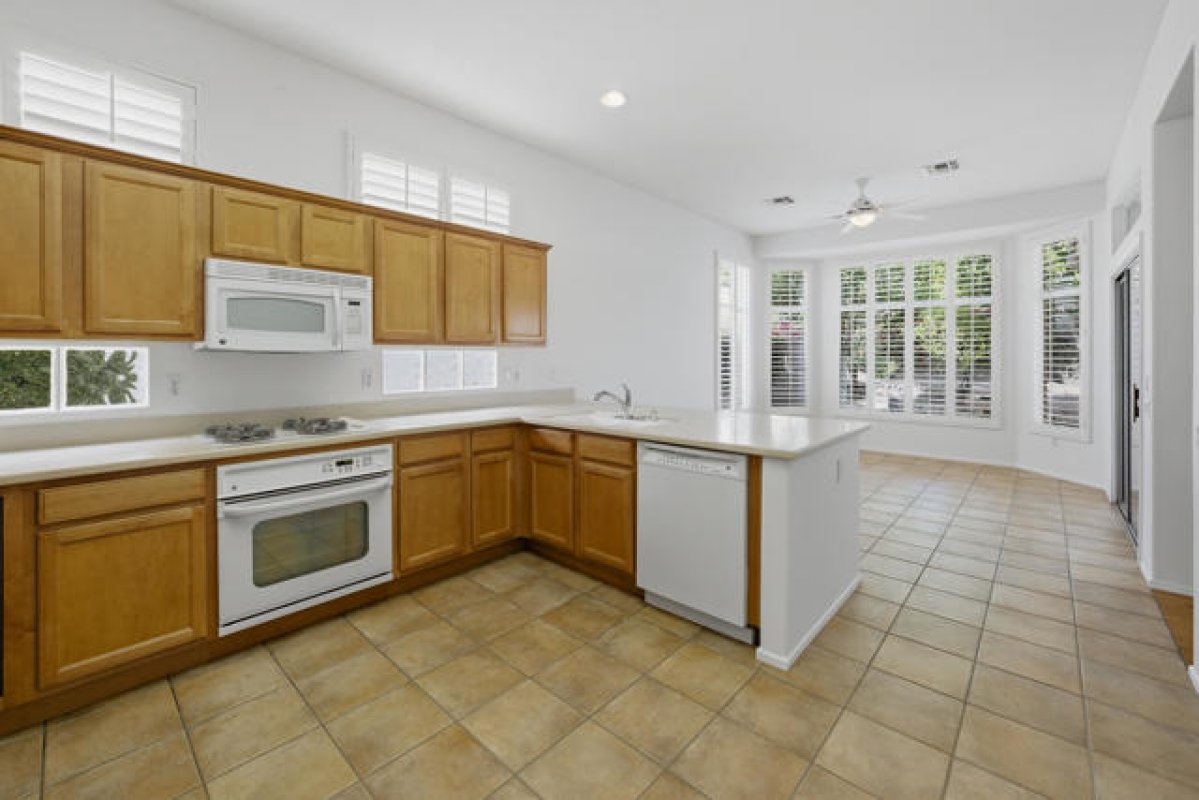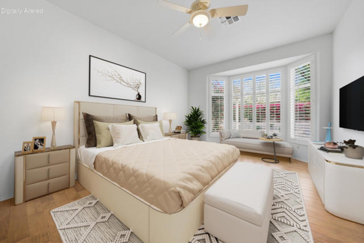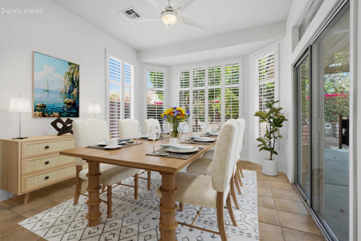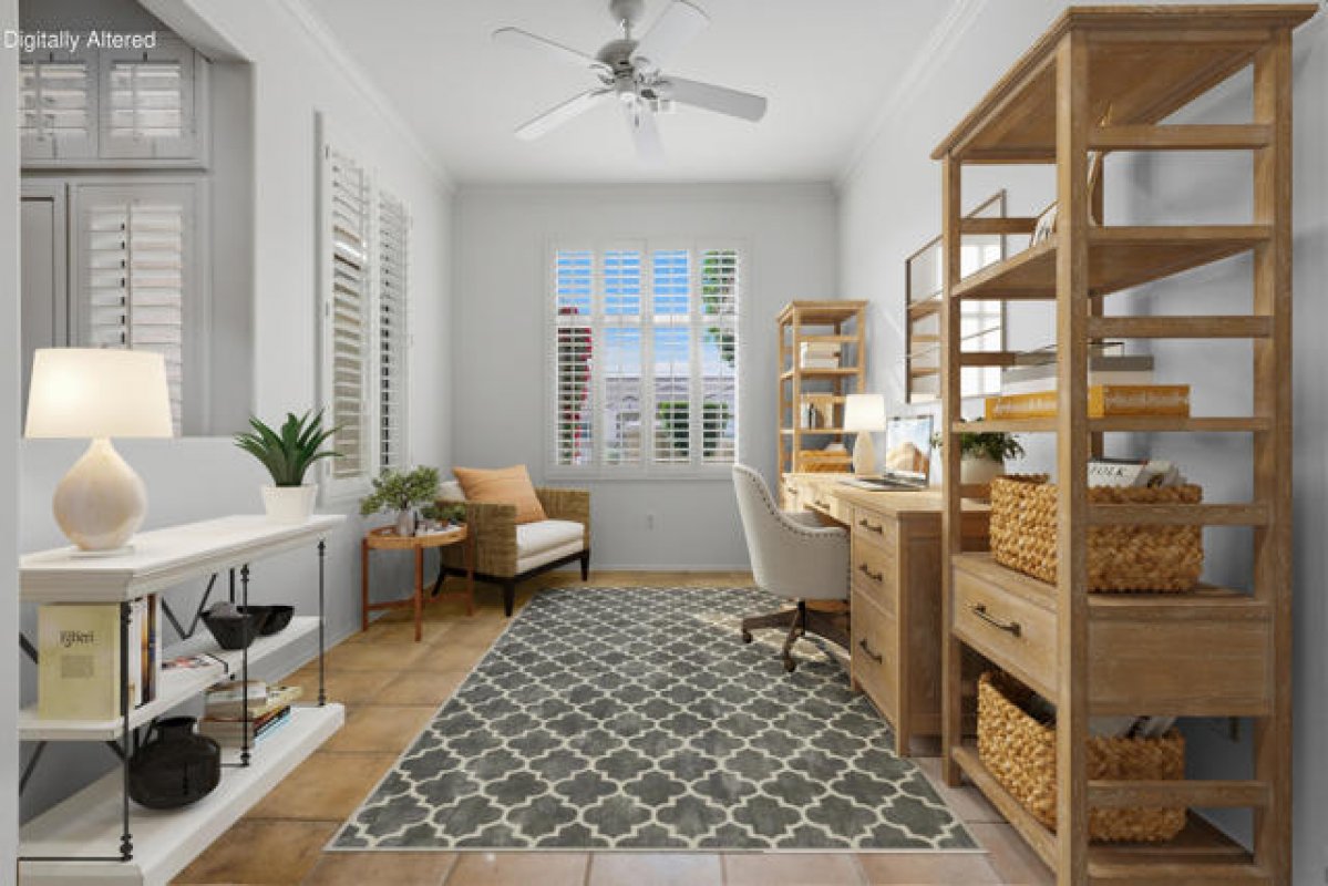 Sun City Palm Desert - Tangier. Ideally located between the Lakeview and Sunset View Clubhouses, this popular floorplan offers comfort, functionality, and easy desert living. The spacious north-facing rear yard features an extended patio with an aluamawood patio cover, lush desert landscaping with raised planters, and a built-in BBQ islanda"perfect for outdoor relaxation or entertaining. A gated front courtyard with patio adds both curb appeal and everyday usability. Inside, 10-foot ceilings and transom windows create a light and open atmosphere. Plantation shutters are found throughout, along with a tasteful mix of hardwood flooring in the living areas and bedrooms and tile flooring elsewhere. The kitchen is well appointed with Corian countertops, a breakfast bar, recipe windows, and cabinets with pull-out shelves. The den/office and living room are accented with crown molding, adding a refined touch. The primary suite features a bay window and a large walk-in closet, while the primary bath includes dual sinks, a glass-enclosed stall shower, and cultured marble surfaces. The extended guest bedroom offers French doors opening to the front courtyard and an adjacent bath with a shower/tub combination. Additional highlights include a laundry room with built-in storage and a separate closet, a new A/C installed in 2015, and an extended two-car garage with golf cart nook, built-in storage, and a work area.