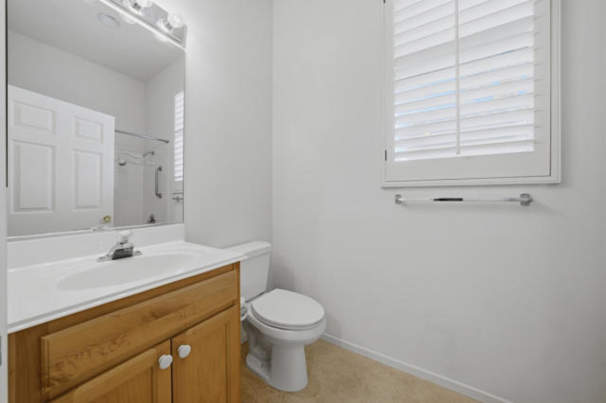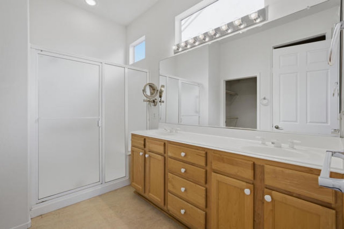 Sun City Palm Desert - Morocco with Casita. Ideally located in the heart of Sun City on a quiet street just a short distance from the Sunset View Clubhouse, this popular great room home offers comfort, privacy, and versatility. The north-facing rear yard features peekaboo mountain views, an extended patio, and lush desert landscaping with citrus--perfect for relaxing or entertaining. An updated exterior paint scheme and gated front courtyard with patio create inviting curb appeal. Inside, 10-foot ceilings and transom windows fill the home with natural light. Upgraded plank flooring and ceiling fans run throughout, and shutters cover all windows except the great room view windows. The spacious kitchen is appointed with Corian countertops, light maple cabinetry with pull-out shelves, recessed and under-cabinet lighting, and ample storage. Folding doors off the great room open to a flexible den or office. The primary suite features double-door entry, a bay window, an enlarged walk-in closet, and an en-suite bath with dual sinks and a stall shower with textured glass enclosure. The guest bath includes a tub/shower combination. French doors from the courtyard lead to the detached casita, providing a private guest bedroom with its own en-suite bath. Additional highlights include a laundry room with utility sink and built-in storage, a two-car garage with extensive built-ins, a golf cart parking nook, and man doors to both the courtyard and side yard. The main A/C was replaced in 2016.