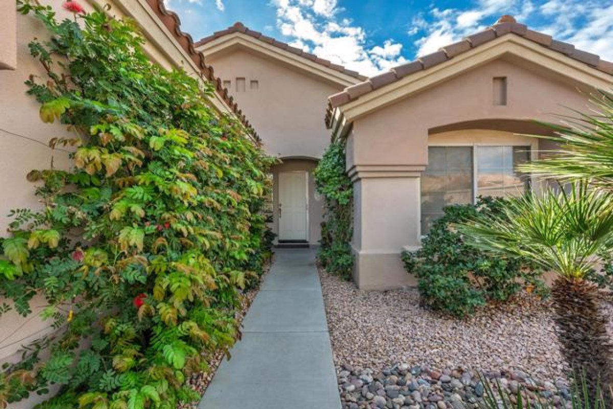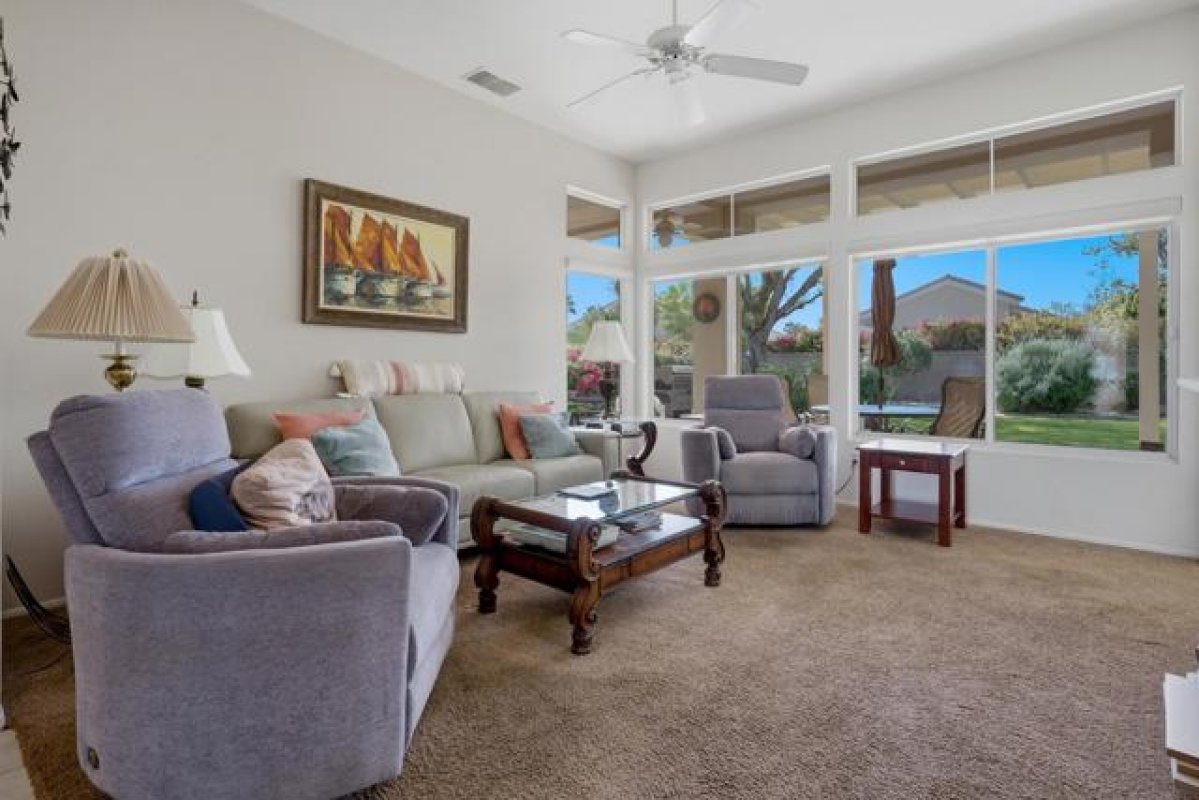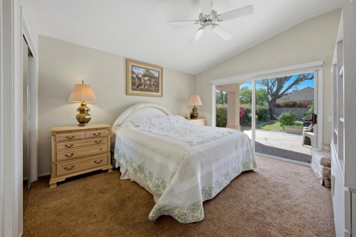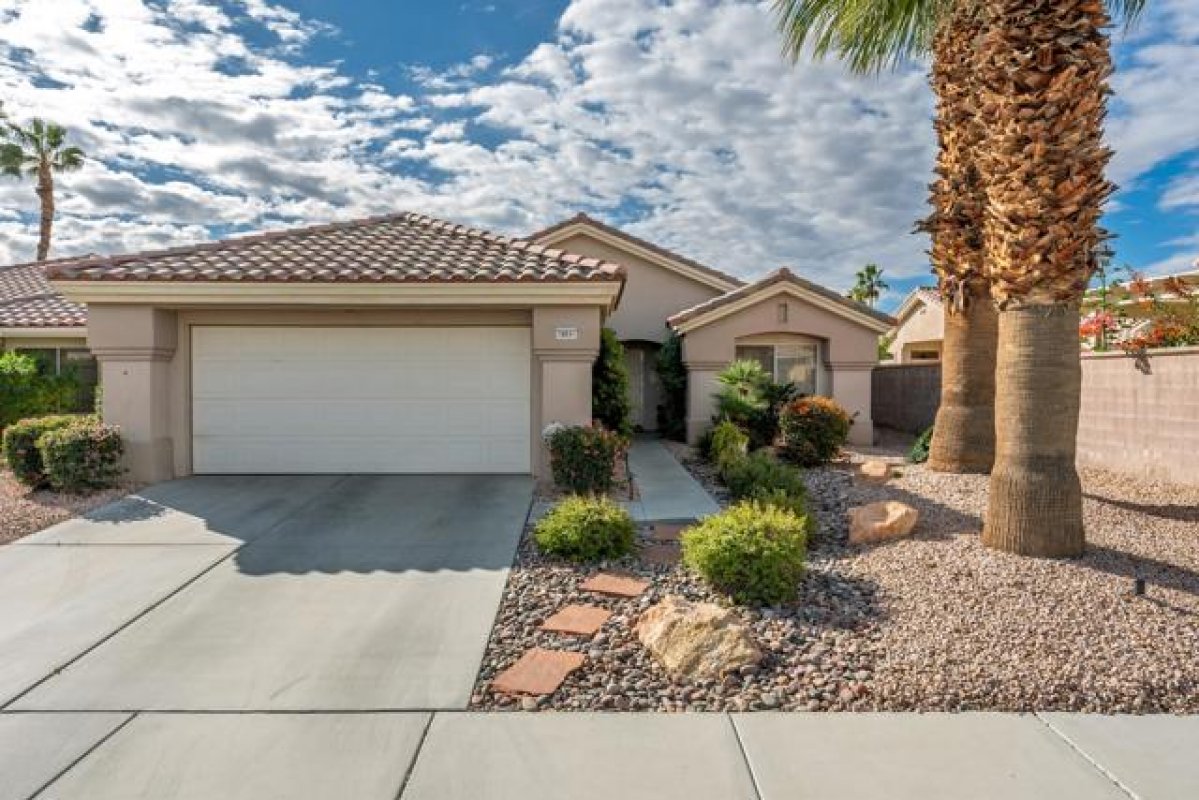 Sun City Palm Desert - Gorham. Just a short distance from the Mountain View Clubhouse, this charming home boasts a spacious, park-like south-facing rear yard adorned with lush landscaping, an extended patio with an alumawood cover, curbed planters, a sitting wall, and vibrant rose bushes and citrus trees--perfect for outdoor gatherings. Inside, enjoy tile floors throughout, except in the bedrooms, and vaulted ceilings in the kitchen, primary suite, and guest bedroom, creating an airy atmosphere. The kitchen is equipped with corian countertops, a breakfast bar, and a new. The primary suite offers dual closets with mirrored wardrobe doors and built-in storage, while the bathroom features dual sinks and a stall shower with textured glass doors. The guest bathroom includes a shower/tub while the guest bedroom also has a closet with mirrored wardrobe doors. Additional functional spaces include a utility room with a desk and cabinetry, and a two-car garage with built-in storage, a utility sink, and a garage opener replaced in 2025. Recent upgrades include a new water heater in 2023 and a new irrigation system in 2024.