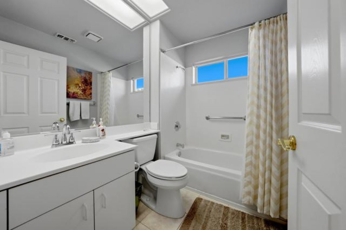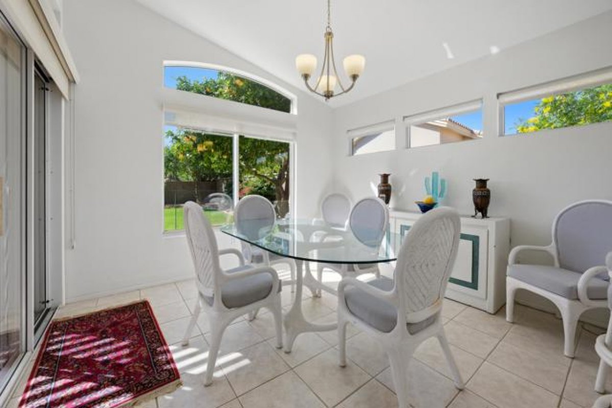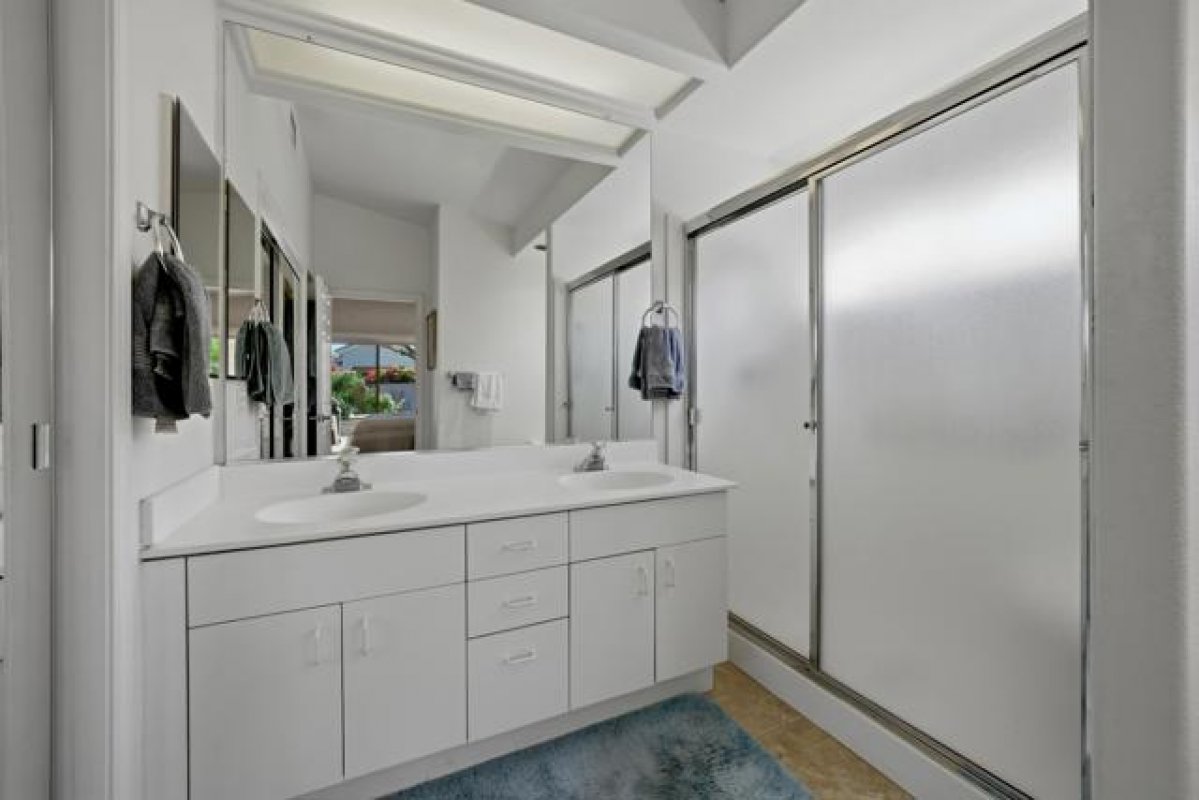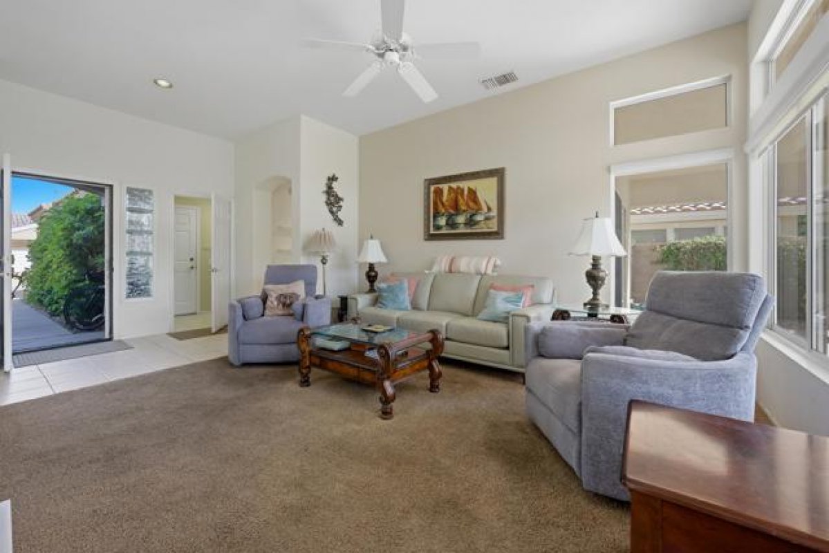 Sun City Palm Desert - Gorham. Just a short distance from the Mountain View Clubhouse, this charming home boasts a spacious, park-like south-facing rear yard adorned with lush landscaping, an extended patio with an alumawood cover, curbed planters, a sitting wall, and vibrant rose bushes and citrus trees--perfect for outdoor gatherings. Inside, enjoy tile floors throughout, except in the bedrooms, and vaulted ceilings in the kitchen, primary suite, and guest bedroom, creating an airy atmosphere. The kitchen is equipped with corian countertops, a breakfast bar, and a new. The primary suite offers dual closets with mirrored wardrobe doors and built-in storage, while the bathroom features dual sinks and a stall shower with textured glass doors. The guest bathroom includes a shower/tub while the guest bedroom also has a closet with mirrored wardrobe doors. Additional functional spaces include a utility room with a desk and cabinetry, and a two-car garage with built-in storage, a utility sink, and a garage opener replaced in 2025. Recent upgrades include a new water heater in 2023 and a new irrigation system in 2024.