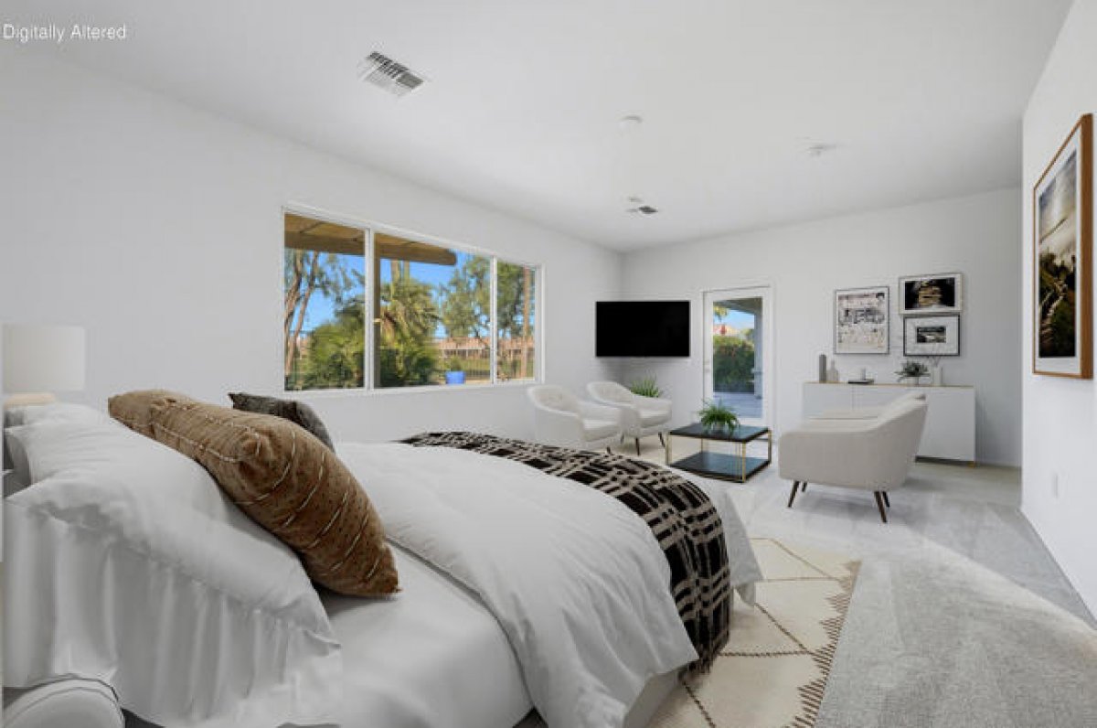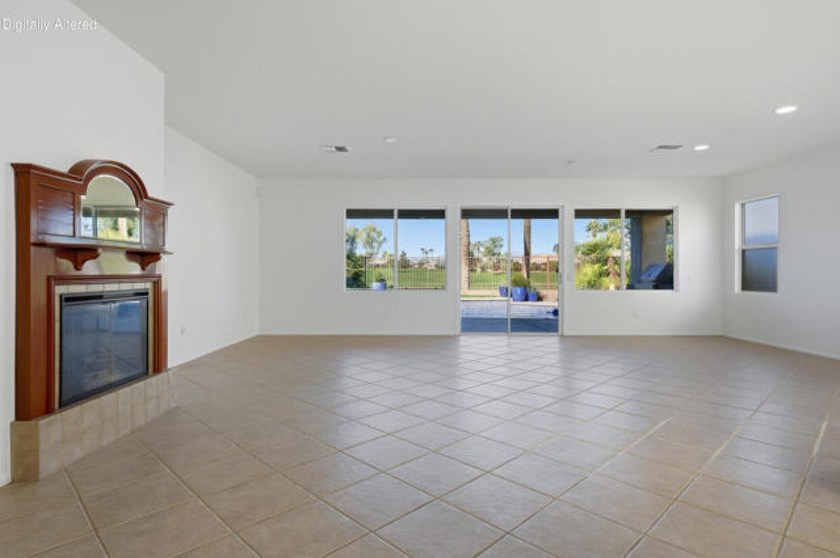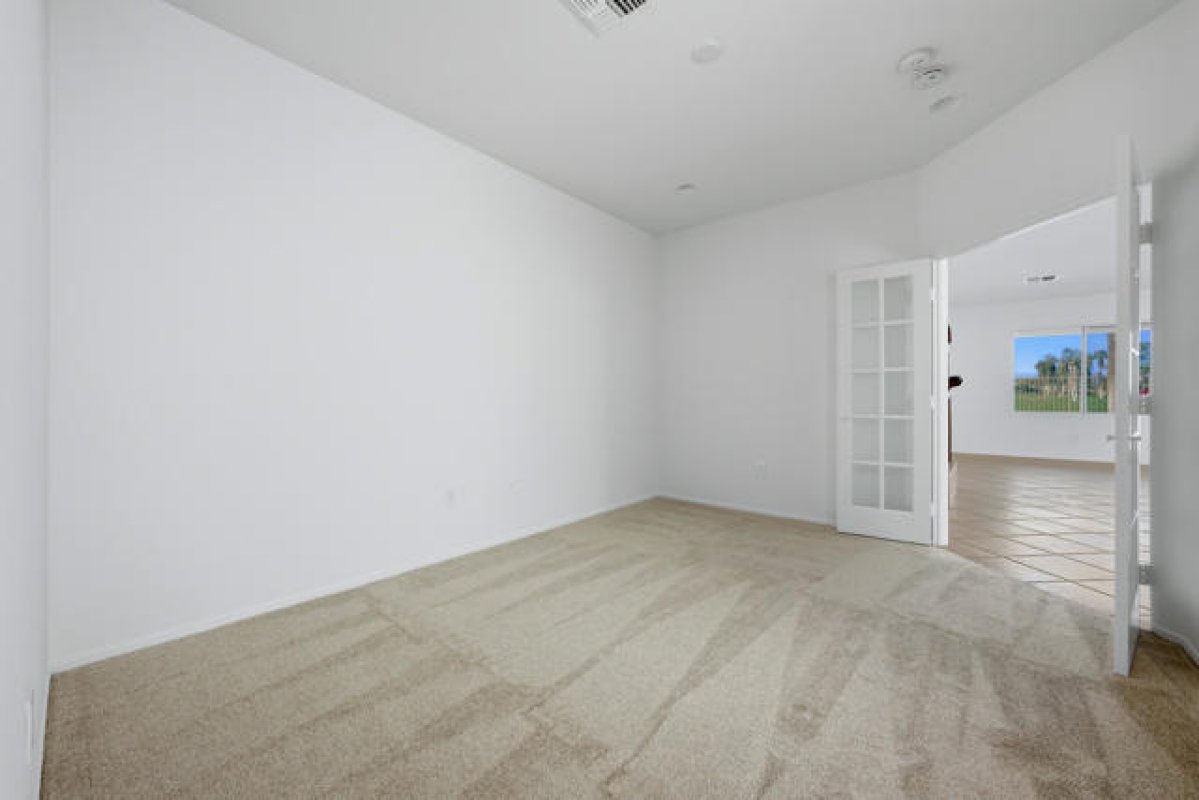 Sun City Palm Desert - St. Croix. Ideally positioned at the end of the 16th fairway, this highly sought-after St. Croix model offers sweeping golf course views and dramatic mountain panoramas, including Mount San Jacinto and Mount San Gorgonio. Sun City's most popular floor plan includes 2 bedrooms, 2 bathrooms, a den, a bonus hobby room, and an extended 2+ golf cart garage. Priced to reflect its outstanding location, views, and solid condition, this home presents a rare opportunity for buyers to add their own updates and finishes over time--creating a personalized retreat without paying a premium for someone else's renovations. The spacious rear yard is built for outdoor living, featuring an extended salt-finished patio, BBQ island, and pool and spa--perfect for relaxing or entertaining while enjoying the exceptional views. A front courtyard and desert landscaping add inviting curb appeal. Inside, the home has been freshly painted and well maintained, with tile flooring throughout the main living areas and newly installed carpet in the bedrooms, den, and hobby room. The kitchen features Corian countertops, a chef's island, breakfast bar, wall oven, and raised-panel maple cabinetry, which continues into the bathrooms. The great room includes an electric fireplace and sliding door that opens to the rear patio. French doors lead to the den, with a pocket door providing access to the hobby room. The primary suite offers patio access and a large walk-in closet with custom built-ins and mirrored doors, while the en suite bath features dual sinks and a stall shower with textured glass. The guest bath includes a shower/tub combination with cultured marble surfaces. Additional highlights include a guest bedroom with mirrored wardrobe doors, a laundry room with utility sink and built-in storage, and an extended 2+ golf cart garage with its own air conditioning and built-in cabinetry. The HVAC system was replaced in 2022.