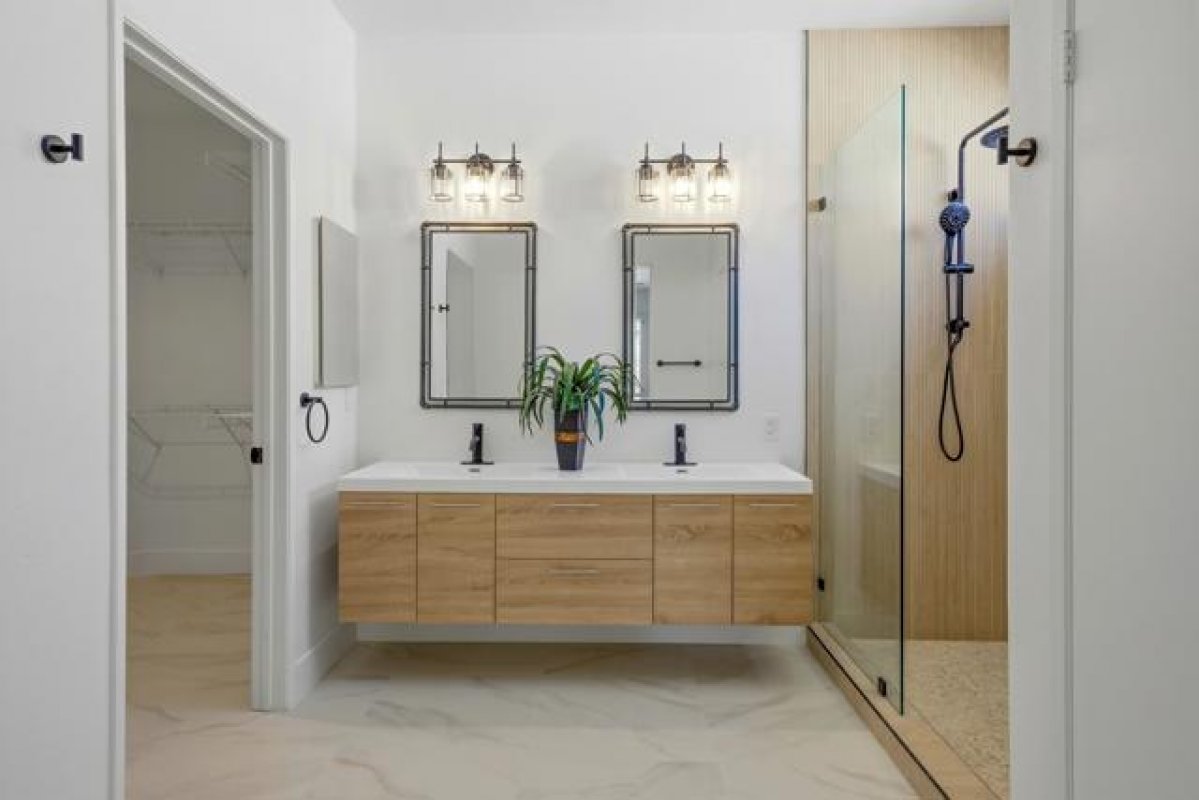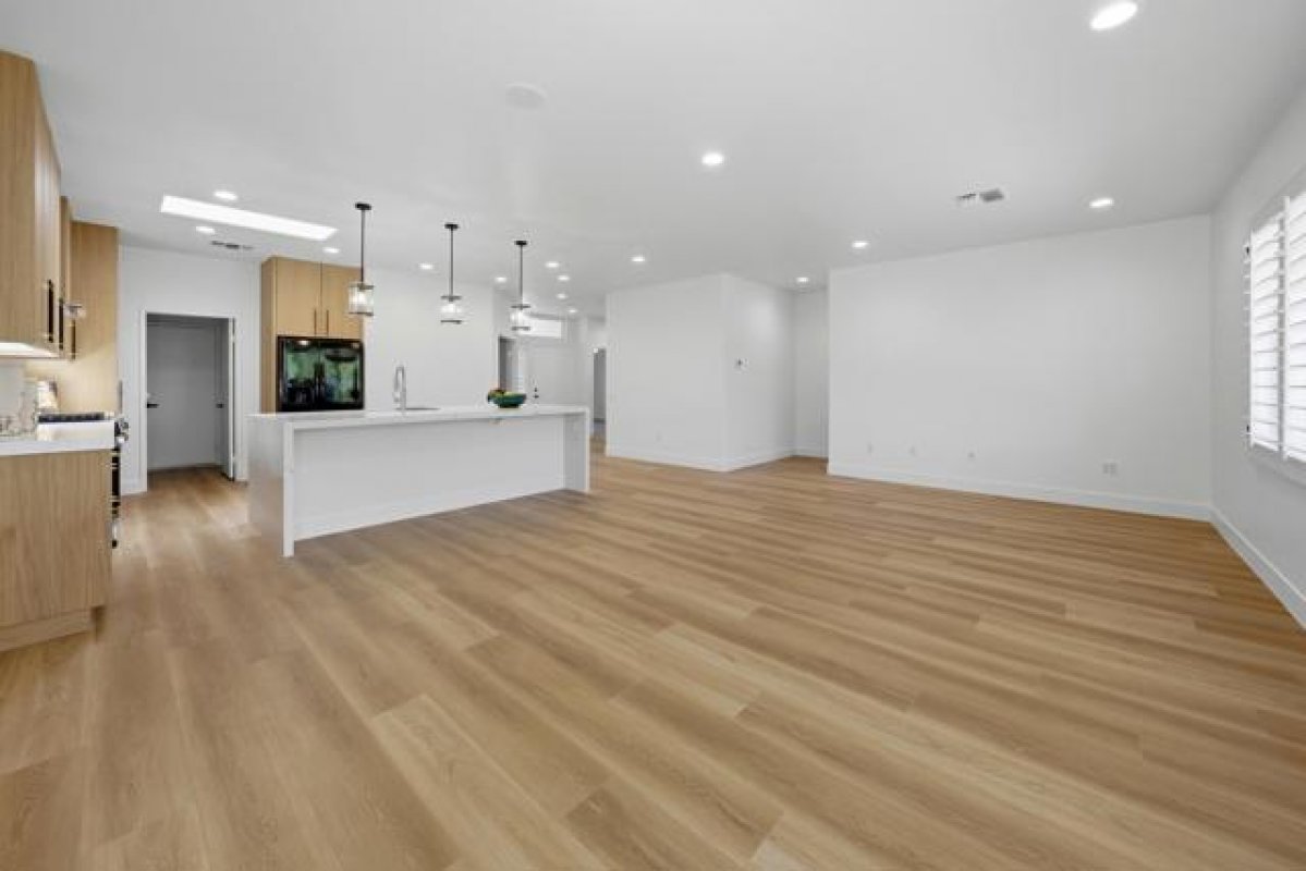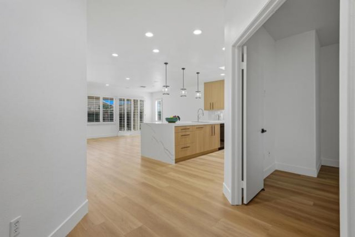Sun City Palm Desert - St. Maarten. This beautifully remodeled and reimagined St. Maarten offers a fresh take on one of Sun City's most popular great room floorplans, blending modern design with everyday comfort. Inside, the home showcases luxury vinyl plank flooring throughout, complemented by large-format tile in the bathrooms, 6-inch baseboards, recessed lighting, plantation shutters, and fresh interior paint--creating a clean, cohesive, and move-in ready environment. The redesigned kitchen is a standout, featuring custom extended-length cabinetry, quartz countertops, a subway tile backsplash, and an expanded island with waterfall edges, breakfast bar seating, and stylish pendant lighting--perfect for both casual living and entertaining. Double doors open from the great room to a versatile den or office, offering flexibility for work or relaxation. The spacious primary suite features a bay window, a large walk-in closet, and a fully upgraded bathroom with a floating dual-sink vanity, custom-tiled stall shower with rimless glass enclosure, and designer fixtures, lighting, and mirrors. Guests are comfortably accommodated with a well-sized bedroom featuring a walk-in closet and a beautifully updated bathroom with a custom tile tub/shower surround, upgraded vanity, mirrors, and lighting. The north-facing rear yard provides a peaceful outdoor retreat with an extended patio surrounded by lush desert landscaping--ideal for enjoying the desert climate. Additional features include a laundry room with built-in storage and a two-car garage with an epoxy floor. This home delivers the perfect combination of thoughtful upgrades, modern style, and the vibrant Sun City Palm Desert lifestyle.