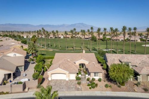 Sun City Palm Desert- Portofino (Greatroom). This is one of Sun City's most popular greatroom homes in an absolutely outstanding interior location. The home sits on an oversized lot at the outer bend of the 6th fairway which provides panoramic golf course and mountain views. The rear yard is made for leisure and entertaining with a pebbletec pool, spacious patio, and side yard, a built in BBQ and retractable solar shades. A gated front courtyard and leaded glass French doors provide curb appeal. Inside, the greatroom provides a open environment with a wall of windows to the rear yard, a tile trimmed gas fireplace, surround sound and built-in cabinetry. The formal dining room has an octagon shaped coffered ceiling. Plantation shutters are on all windows except the view windows. Tile flooring laid in an offset mosaic is in all but the bedroom. The kitchen's signature feature is a rimless corner window providing views down the fairway. But also there is slab granite counters, stainless appliances including double ovens, under cabinet lighting, walk-in pantry and skylight. The extended primary suite has a slider to the rear patio, crown molding, 2 walk-in closets with built-ins and a retreat that makes a great office or exercise room. The primary suite bathroom has dual sinks, a stall shower and oversized tub. 2 guest suites are on the opposite side of the home. The extended 2+ golf cart garage has its own AC, built-in and hanging rack storage.