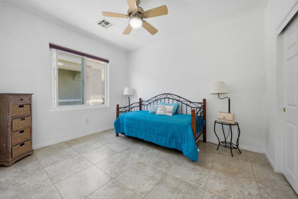 Sun City Palm Desert - Cayman. This popular greatroom home has been transformed into a private resort, featuring a stunning pebbletec pool and spa, a south facing rear yard with peekaboo mountain views, a spacious patio, and a folding glass panel wall that creates a seamless indoor-outdoor living experience. Upgraded windows, HVAC, and owned solar enhance comfort and efficiency. Inside, 20-inch tile flooring runs throughout the home--no carpeting. The upper portion of the wall between the greatroom and hallway has been removed, creating a more open, spacious feel. The kitchen is well appointed with granite countertops, stainless steel appliances, under-cabinet lighting, a chef's island, and a breakfast bar. Double pocket-doors off the greatroom open to a versatile den or office. The primary suite offers direct patio access and a walk-in closet with built-in storage. The en-suite bath includes dual sinks and a stall shower with textured glass doors. The guest bathroom features a tub/shower combination. The garage is finished with an epoxy floor, hanging rack storage, and a utility sink.
