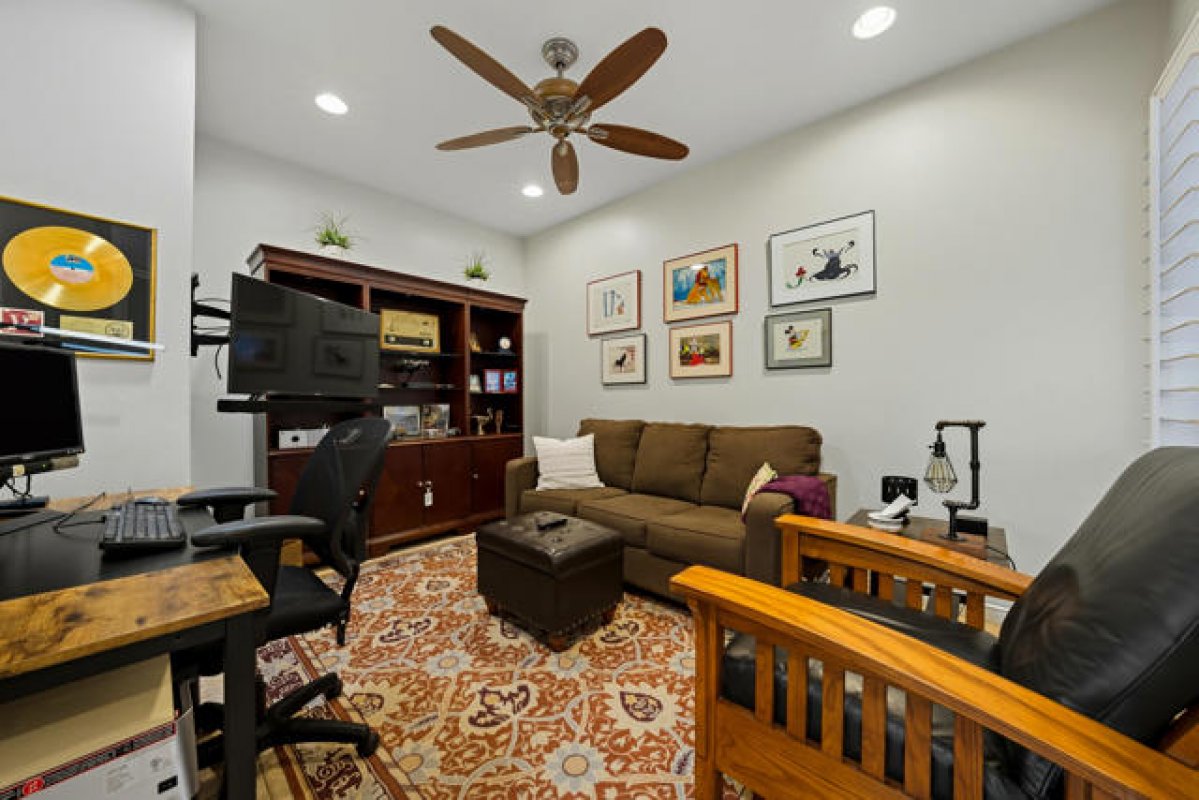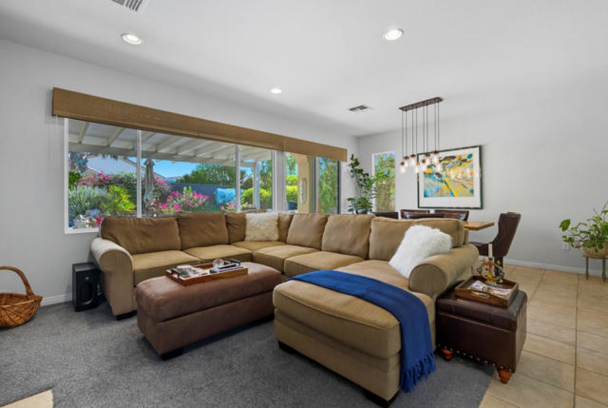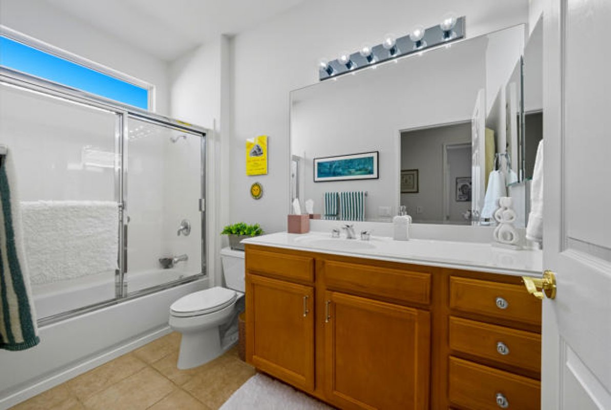 Sun City Palm Desert - St. Maarten. Located near two clubhouses and in the newest section of Sun City, this popular St. Maarten greatroom floor plan offers 2 bedrooms, 2 bathrooms, and a versatile den/office. One of the home's standout features is its spacious, north-facing rear yard situated on a large lot -- beautifully landscaped and designed for outdoor living with an extended decorative concrete patio, alumawood patio cover, and a sunken hot tub and fountain. Inside, the home is bright and open with abundant natural light enhanced by Solatubes in the kitchen, foyer, and den. Tile flooring runs throughout the main living areas, and the greatroom features a gas fireplace with a stacked-stone surround and direct access to the patio. The kitchen is both stylish and functional with granite countertops, under-cabinet lighting, recipe windows, stainless steel appliances, a breakfast bar, pantry, and pull-out shelving in the maple cabinetry -- which extends to the bathrooms, laundry, and linen storage. Accordion doors off the greatroom open to a spacious den/office with plantation shutters. The primary suite includes a media nook, large walk-in closet, and en suite bathroom with a sitting vanity and glass-enclosed shower. The guest bedroom also offers a walk-in closet and shutters, and the guest bath features a tub/shower combination. Additional highlights include a laundry room with built-in storage, a two-car garage with ample storage space, and a new AC installed in 2021.