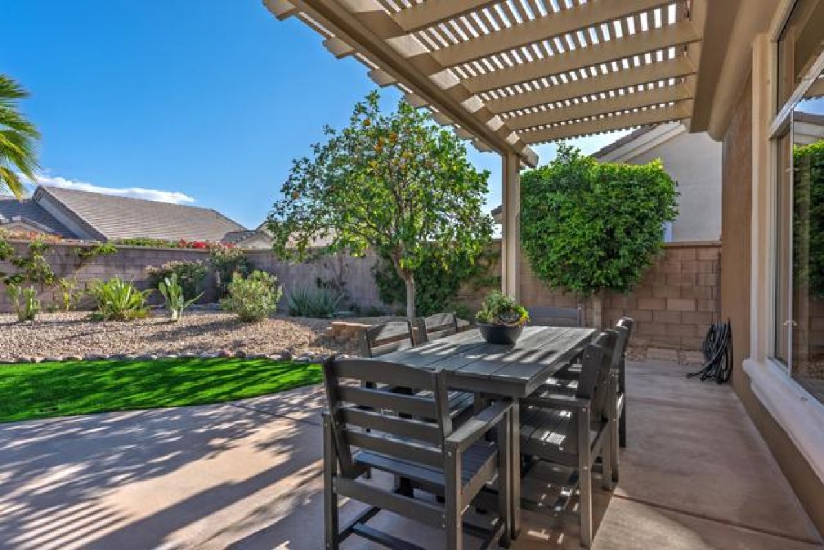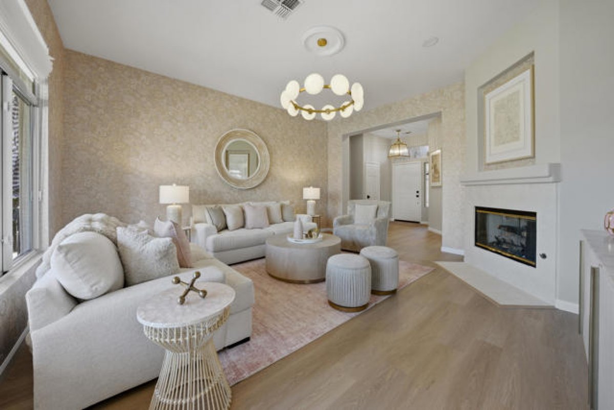 Sun City Palm Desert - Tangier. Beautifully renovated and thoughtfully transformed, this exceptional home is offered fully furnished. Ideally located in the heart of Sun City, just moments from the Sunset View Clubhouse, this residence has been completely re-imagined inside and out, blending modern design with effortless desert living. Inside, 10-foot ceilings and transom windows fill the home with abundant natural light. Vinyl plank flooring runs throughout, complemented by upgraded baseboards, LED lighting, and updated light switches. Upgraded door hardware and dramatic ligh fixtures are found throughout the home. The living room is highlighted by a striking designer light fixture and a fireplace that adds both style and warmth. The redesigned kitchen features upgraded appliances, a single-basin sink, gold fixtures, and refined finishes that pair seamlessly with curated designer wallpaper and furnishings. Double doors open to a den/office, adding both flexibility and style. The primary suite offers upgraded carpet, a pocket door to the bath, a custom walk-in closet with built-in storage, and a beautifully updated bathroom with dual-sink vanity, upgraded mirrors and lighting, and a tiled shower with glass enclosure. The guest bathroom includes a tub/shower combination with tasteful updates. Upgraded door hardware and fixtures are found throughout the home. Outdoors, the transformation continues with a freshly painted exterior, enhanced landscape lighting, desert landscaping, and low-maintenance artificial turf. Thoughtfully selected plantings and inviting outdoor furnishings create an ideal setting for relaxing or entertaining in the desert climate. Additional features include a two-car garage with a dedicated nook for golf cart parking. Impeccably styled and move-in ready, this rare offering allows you to enjoy the Sun City Palm Desert lifestyle immediately.