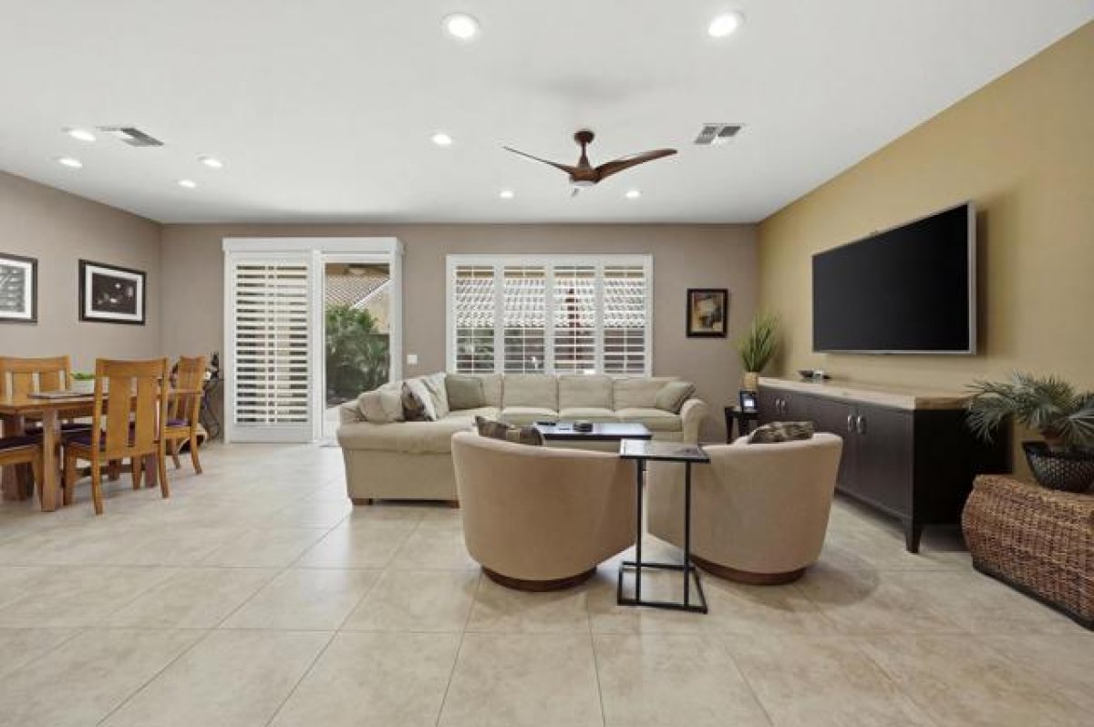 Sun City Palm Desert - Montego with Casita. This popular greatroom home offers the ideal blend of comfort, privacy, and flexibility with 3 bedrooms and 2 bathrooms in the main residence plus a detached 1 bedroom, 1 bathroom casita--perfect for guests or extended stays. Conveniently located just a short distance to both the Sunset View and Mountain View clubhouses, the home also enjoys an elevated east-facing rear yard that sits above neighboring homes, providing an open, airy, and private setting.Exceptional curb appeal begins with a gated front courtyard and desert landscaping. Inside, the home is beautifully appointed with tile flooring, shutters, and recessed lighting throughout. The greatroom features an electric fireplace and sliding glass doors that open to the rear patio, creating seamless indoor-outdoor living. The updated kitchen is designed for both style and function with slab granite counters, stainless steel appliances, under-cabinet lighting, pullout shelving, and a breakfast bar accented by pendant lighting.The spacious primary suite offers direct patio access and a large walk-in closet, while the ensuite bathroom includes a custom tile shower with a rimless glass enclosure and dual sink vanity. On the opposite side of the home, the guest wing provides two bedrooms and a bathroom with a quartz-topped vanity and a shower/tub with rain glass doors. The detached casita features its own bathroom with a stall shower and textured glass enclosure.Additional highlights include a laundry room with built-in storage and an extended two-car garage with additional built-in cabinetry. This well-maintained home is a perfect desert retreat with space for hosting and everyday living.