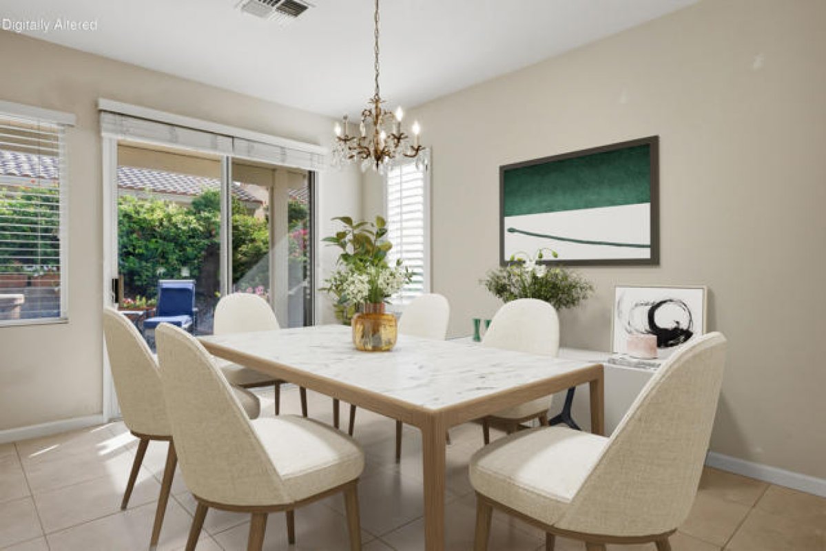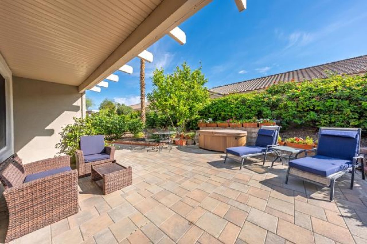 Sun City Palm Desert - St. Maarten. This beautiful home offers exceptional curb appeal with extended hardscape and stunning desert landscaping that create a warm and welcoming first impression. The east-facing rear yard feels like a private garden retreat, featuring an expansive paver patio, lush landscaping, mature citrus trees, an alumawood patio cover, and an above-ground hot tub--perfect for relaxing mornings or entertaining under the desert sky. Inside, the home offers 2 bedrooms, 2 bathrooms, and a versatile den. Tile flooring runs throughout all but the bedrooms, while upgraded baseboards and recessed lighting enhance the great room's open, inviting feel. The den/office sits just off the great room and includes built-in shelving and a solar tube that fills the space with natural light. The kitchen is both stylish and functional with slab granite counters, stainless steel appliances, an island with breakfast bar, pantry, and cabinetry with convenient pull-out shelves. The primary suite provides a peaceful retreat with an ample walk-in closet featuring built-in storage. The ensuite bathroom includes dual sinks and a stall shower with textured glass doors. The guest bedroom offers its own walk-in closet and a Murphy bed for flexible use of space, while the guest bath includes a shower/tub combination. Additional features include a water heater replaced in 2017 and a garage with epoxy flooring and built-in storage. This thoughtfully upgraded St. Maarten blends comfort, efficiency, and inviting indoor-outdoor living in one of the desert's most desirable active adult communities.