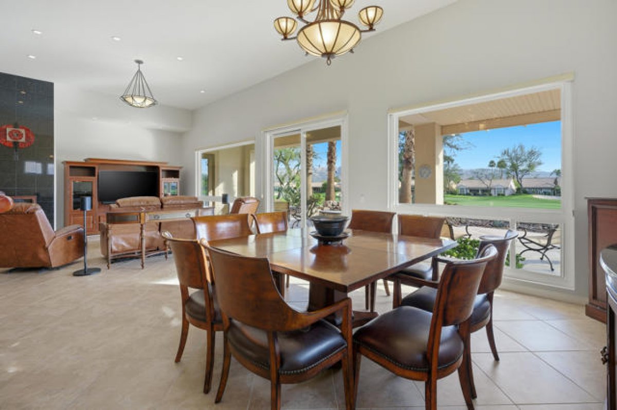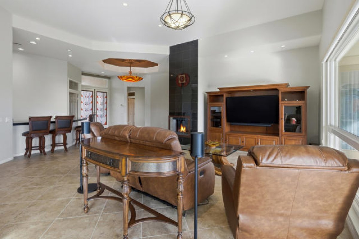 Sun City Palm Desert - St. Tropez. This sought-after St. Tropez model is one of Sun City's most dramatic great room floorplans--elevated on the 14th fairway of the Santa Rosa course with panoramic golf course and mountain views. The east-facing backyard is designed for entertaining, featuring an expanded decorative concrete patio, multiple seating areas, desert landscaping, and three gas firepits. Curb appeal shines with a decorative concrete driveway, gated courtyard, and leaded-glass double doors. Recent upgrades make this home move-in ready for the desert climate: new dual AC units (2024), owned solar eliminating electricity bills, and upgraded windows throughout. Inside, soaring 12-foot ceilings in the great room and foyer, upgraded lighting, and Hunter Douglas window treatments create a dramatic yet comfortable atmosphere. Diagonally laid 19-inch tile flows through the main living areas. The great room showcases a granite-surround fireplace, a granite-topped wet bar with refrigerator, and a wall of windows framing the view. Double doors open to a flexible den/office. The kitchen is a chef's delight with granite counters, a large breakfast bar, center island, wall oven, and pull-out cabinetry. The primary suite offers double-door entry, patio access, a custom walk-in closet, and a spa-style bath with dual sinks, sitting vanity, oversized soaking tub, and glass-block shower. A spacious guest suite includes its own full bath. Additional features: large laundry with storage and sink, 2-car + golf cart garage with epoxy floors and separate AC, and the option to purchase furnished outside of escrow.