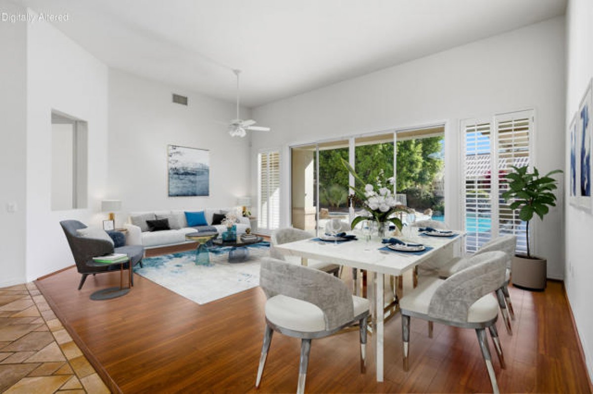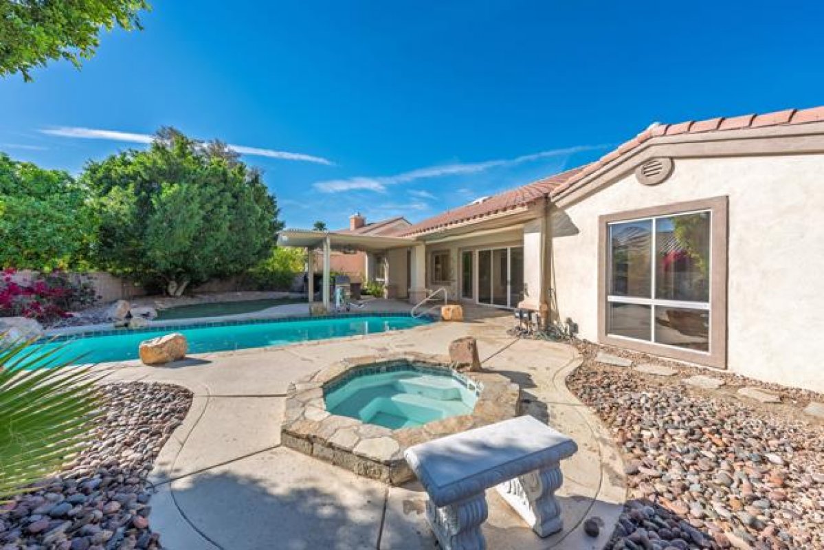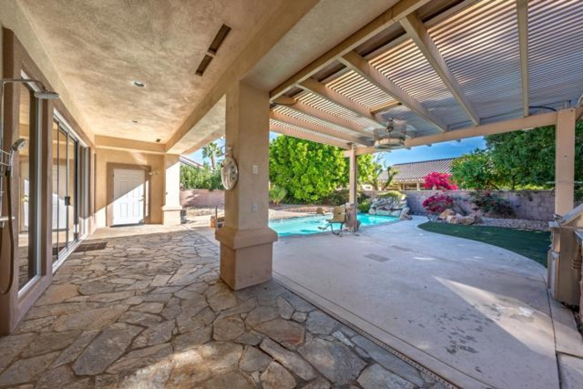 Sun City Palm Desert - Monaco (Extended). Located on a quiet cul-de-sac. this extended Monaco offers exceptional flexibility with three extended suites, including a rare double guest suite -- ideal for hosting guests or accommodating an in-home caregiver. The oversized east-facing rear yard is a true highlight, featuring a pool and spa surrounded by an expansive flagstone patio, lush landscaping, and a built-in BBQ island -- perfect for entertaining or relaxing in privacy. The gated front courtyard and leaded glass entry doors create inviting curb appeal. Inside, 12-foot ceilings elevate the greatroom, while mosaic tile and Pergo flooring, along with plantation shutters throughout, provide a cohesive and upgraded finish. The kitchen is designed for both function and gathering, featuring composite counters, a large island with breakfast bar, double wall ovens, a spacious pantry, and a skylight that fills the space with natural light. The extended primary suite offers direct access to the rear patio, a walk-in closet with built-in storage plus a bonus closet. The ensuite bath includes dual sinks with a sitting vanity, a walk-in shower, and a separate stall shower with textured glass doors. The double guest bedroom suite includes a wet bar, two closets, and a private bath with shower/tub combination. The additional extended guest suite also has its own shower/tub bathroom. A separate utility space or office adds even more versatility. The 2+ golf cart garage includes built-in cabinetry and overhead hanging rack storage. One AC unit was replaced in 2025, the other in 2013. A rare extended Monaco offering space, privacy, and resort-style outdoor living.