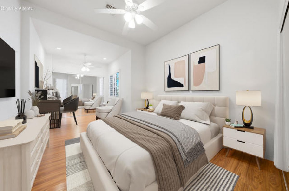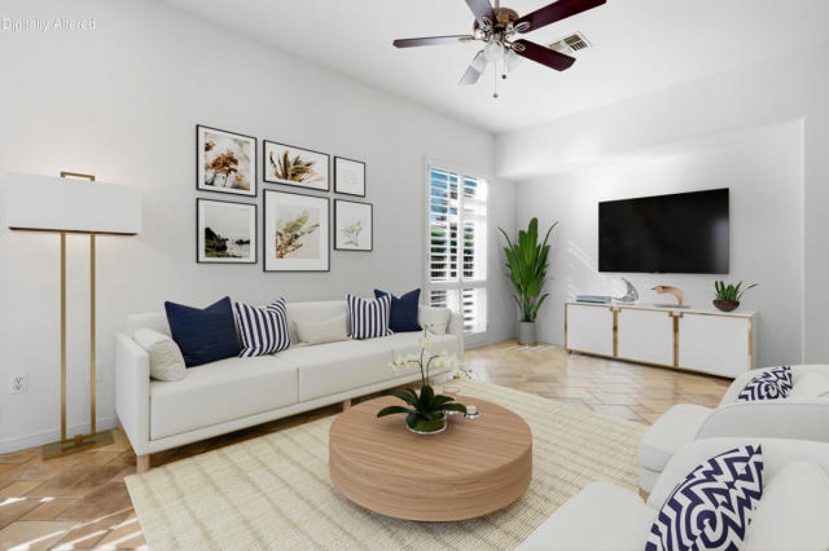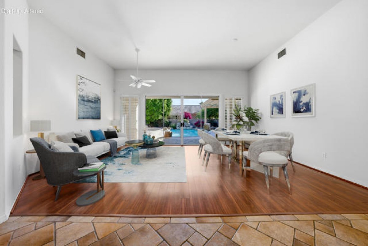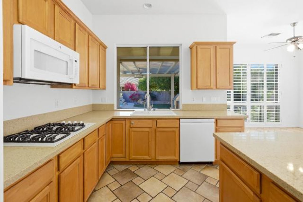 Sun City Palm Desert - Monaco (Extended). Located on a quiet cul-de-sac. this extended Monaco offers exceptional flexibility with three extended suites, including a rare double guest suite -- ideal for hosting guests or accommodating an in-home caregiver. The oversized east-facing rear yard is a true highlight, featuring a pool and spa surrounded by an expansive flagstone patio, lush landscaping, and a built-in BBQ island -- perfect for entertaining or relaxing in privacy. The gated front courtyard and leaded glass entry doors create inviting curb appeal. Inside, 12-foot ceilings elevate the greatroom, while mosaic tile and Pergo flooring, along with plantation shutters throughout, provide a cohesive and upgraded finish. The kitchen is designed for both function and gathering, featuring composite counters, a large island with breakfast bar, double wall ovens, a spacious pantry, and a skylight that fills the space with natural light. The extended primary suite offers direct access to the rear patio, a walk-in closet with built-in storage plus a bonus closet. The ensuite bath includes dual sinks with a sitting vanity, a walk-in shower, and a separate stall shower with textured glass doors. The double guest bedroom suite includes a wet bar, two closets, and a private bath with shower/tub combination. The additional extended guest suite also has its own shower/tub bathroom. A separate utility space or office adds even more versatility. The 2+ golf cart garage includes built-in cabinetry and overhead hanging rack storage. One AC unit was replaced in 2025, the other in 2013. A rare extended Monaco offering space, privacy, and resort-style outdoor living.