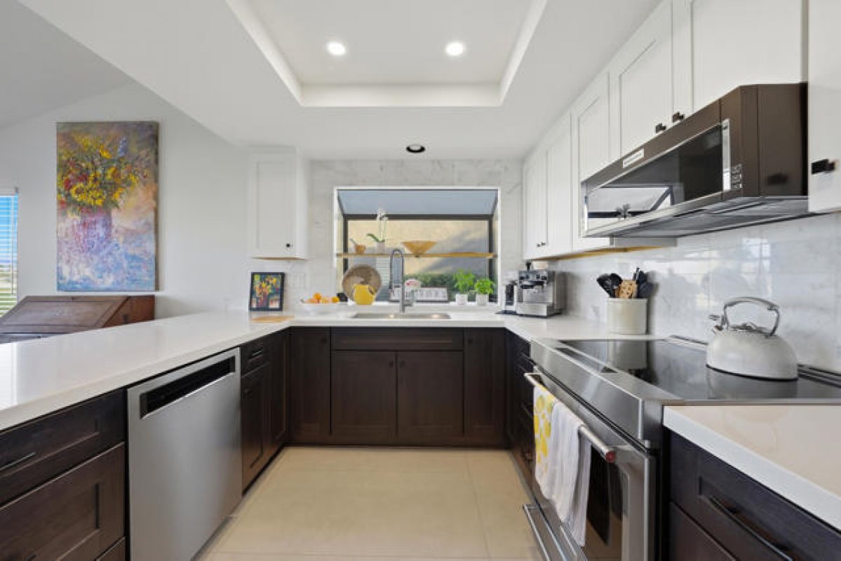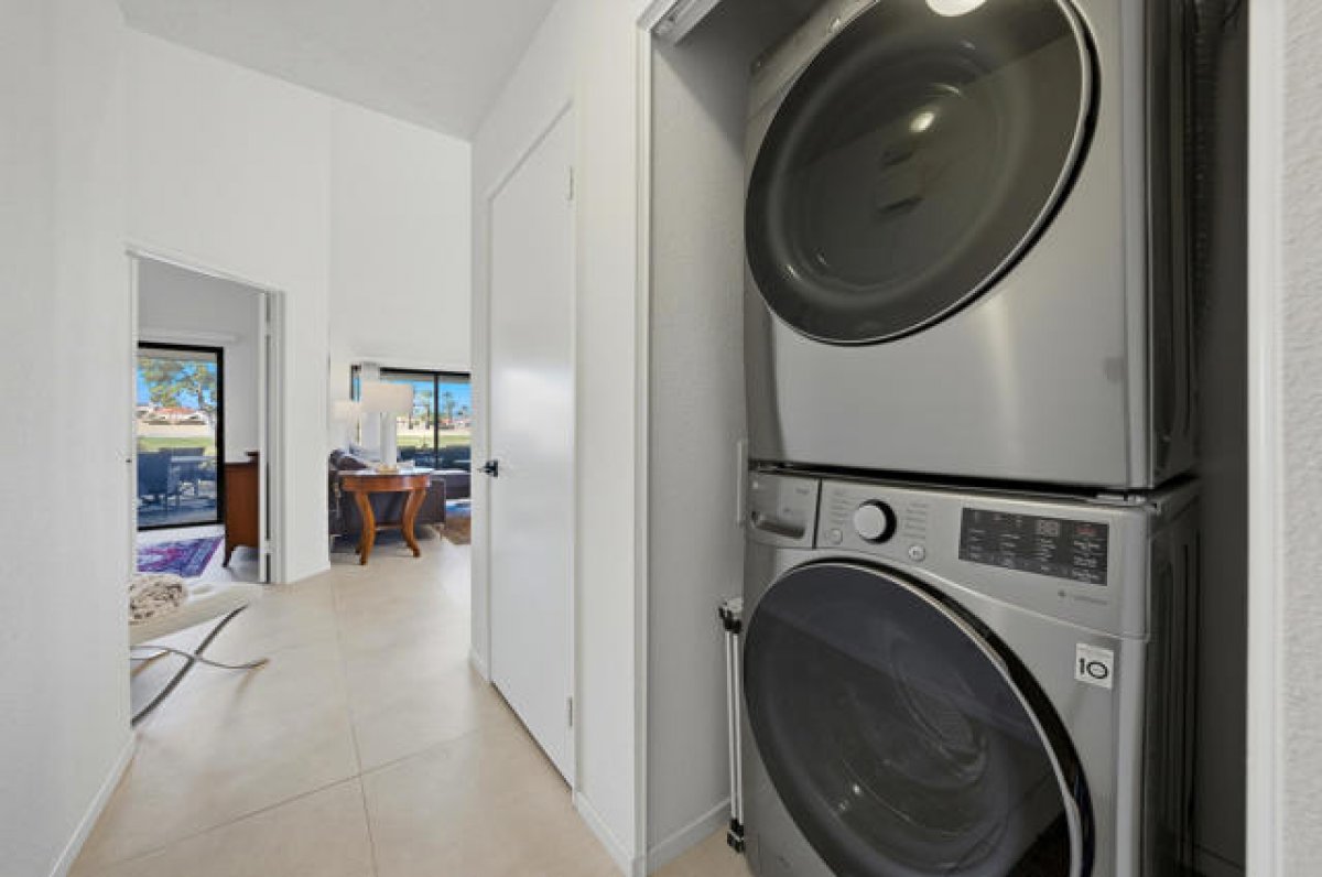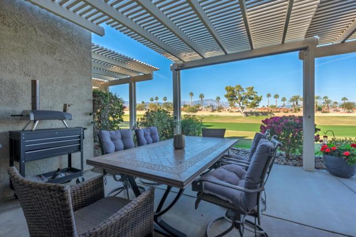 Located within the desirable Palm Desert Resort Country Club, this extensively upgraded Classic floor plan presents an exceptional opportunity for full-time living, seasonal enjoyment, or short-term rental income. Thoughtful updates begin with 4' x 2' tile flooring that flows throughout the entire condo, offering both style and durability. The fully remodeled kitchen features updated cabinetry, stunning countertops with a waterfall edge on the breakfast island, stainless steel appliances including an induction range, generous storage with pantry, and a bay window. There is also space for a dining table. The great room opens to the rear patio through rebuilt large sliding glass doors and includes a fireplace--perfect for cooler desert evenings. The primary suite offers a large closet with custom built-ins, direct access to the extended rear patio, and a beautiful en-suite bath with updated countertops and cabinetry, a soaking tub, and a tiled shower with decorative trim and glass enclosure. The guest bedroom is privately situated on the opposite side of the home and features mirrored closet doors and a convenient Jack-and-Jill bathroom. The guest bath has been updated with new cabinetry and a tiled walk-in shower with decorative trim. Outdoor living is enhanced by an extended rear patio with an Alumawood patio cover for shade and comfort, along with a patio heater over the seating area. West-facing views showcase snow-capped mountains in the winter and memorable sunsets year-round. Additional upgrades include new toilets, door hardware, plumbing fixtures, interior paint, updated baseboards, and more. Recent mechanical improvements include a new HVAC system with heat pump and Nest thermostat for energy-efficient comfort. Laundry is conveniently located inside, and the two-car garage offers extra storage space with built in cabinets. Palm Desert Resort Country Club is a gated community renowned for its resort-style amenities, including pools and spas, tennis and pickleball courts, a championship golf course, clubhouse, cafe, and pro shop. Short-term rentals are permitted.