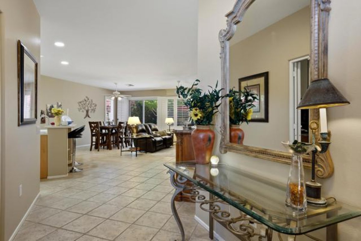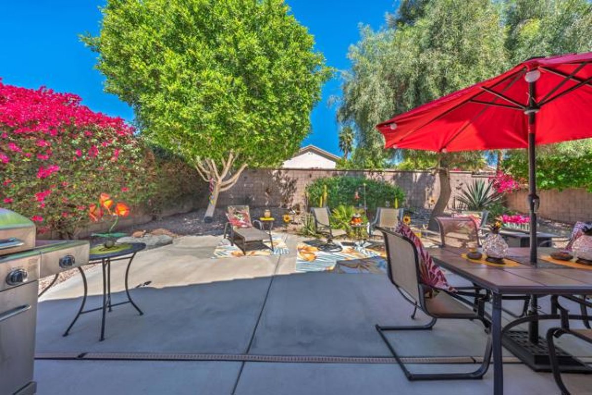 Sun City Palm Desert - St. Maaten. This St. Maarten greatroom home sits on a quiet cul-de-sac in the heart of the community, just a block from the Sunset View Clubhouse with its pool, restaurant, and bocce courts--making it easy to enjoy the resort-style lifestyle every day. The home features a spacious north-facing rear yard with an expansive patio and lush, low-maintenance desert landscaping--an ideal setting for relaxing or entertaining. Attractive curb appeal is enhanced by beautifully maintained landscaping with artificial turf. Inside, tile flooring is used throughout the home (no carpet), including wood-look tile in the bedrooms and den. Plantation shutters are also featured throughout. The kitchen opens to the greatroom and includes an island with breakfast bar, corian counters, a pantry, and light maple cabinetry that continues into the bathrooms and linen storage. A spacious den/office sits just off the greatroom, providing flexible living space. The primary suite features a bay window and a large walk-in closet. Its ensuite bathroom has dual sinks, cultured marble surfaces, and a stall shower with glass enclosure. The guest bathroom includes a tub/shower combination. Additional features include a laundry room with built-in storage and an extended 2-car garage with ample storage space. This well-located home combines comfort, functionality, and easy access to the many amenities that make Sun City Palm Desert such a desirable place to live.