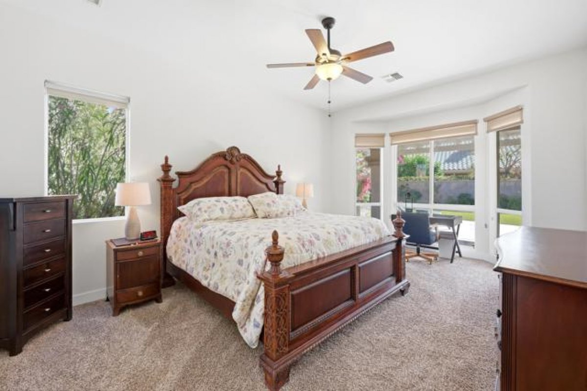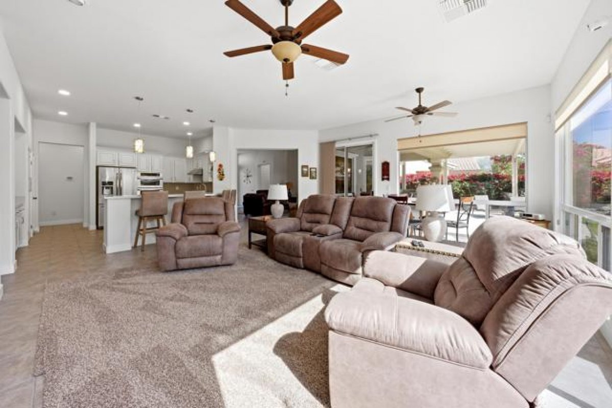 Sun City Palm Desert - San Remo. This beautifully upgraded home offers exceptional curb appeal with a refreshed paint scheme, meticulously maintained desert landscaping, and a gated front courtyard that creates both privacy and charm. Leaded glass French doors with a transom window provide a grand first impression. Inside, the greatroom stuns with a soaring vaulted ceiling approaching 14 feet and expansive tile flooring throughout much of the home. Large picture windows in both the living and family rooms flood the space with natural light while framing views of the lush south-facing rear yard. Solar shades throughout add comfort and efficiency. The family room features a custom floating built-in with shelving and a tile-trimmed gas fireplace, creating a stylish yet inviting focal point. The updated kitchen is thoughtfully designed with quartz countertops, a mosaic tile backsplash, stainless appliances including double wall ovens, a breakfast bar, raised panel cabinetry with pull-out shelves, and a large pantry with pull-out storage behind frosted French doors--ideal for both everyday living and entertaining. The primary suite enjoys a bay window overlooking the patio and a huge walk-in closet with custom built-in organization. Its spa-inspired bathroom showcases an underlit floating vanity with dual sinks, quartz counters, upgraded fixtures, designer lighting and mirrors, plus a spectacular walk-in shower with dual showerheads, custom tile surround, and rimless glass enclosure. On the opposite side of the home, the private guest wing includes two bedrooms and a beautifully updated bathroom featuring a quartz vanity and a tiled stall shower with textured glass doors. A stylish powder room with floating vanity and upgraded finishes serves guests with ease. The laundry room offers built-in storage and a utility sink. The extended 2-car plus golf cart garage is equally impressive with epoxy flooring, built-in storage, overhead racks, its own A/C (new in 2024), and abundant workspace. Major system upgrades provide peace of mind, including two new Bosch air-conditioning units, Rheem furnaces, and a water heater--all installed in 2024. The spacious south-facing rear yard is designed for relaxation and entertaining with an extended patio, alumawood cover, artificial turf, lush landscaping, and a built-in barbecue--your own private desert retreat.