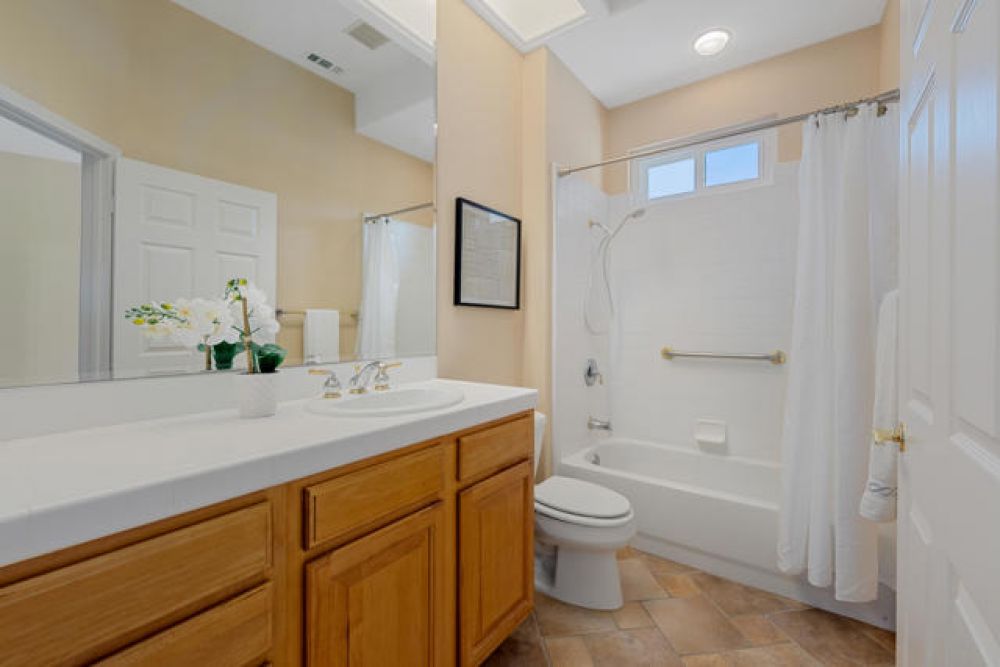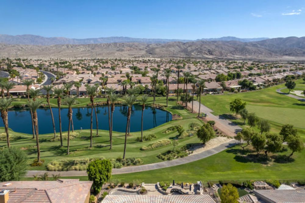 Sun City Palm Desert- Monaco. Located in one of Sun City's most premier locations... elevated over the 18-hole putting course and lake, around the corner from the Lakeview Recreation Center... this estate model home is special. The spacious entertainer's north facing rear yard with an expansive aggregate concrete patio. Panoramic greenbelt and mountain views can be enjoyed from multiple sitting areas, a built-in bar & BBQ. Leaded glass front doors, paver hardscape & an updated paint scheme w/stacked stone accents provides curb appeal. Inside,12ft ceilings are in the foyer & greatroom. Tile flooring is throughout. All the windows have been replaced and upgraded. The greatroom features French doors to the rear patio. The family room has a tile-trimmed gas fireplace. The kitchen has stainless appliances, corian counters w/tile backsplash, a skylight, chef's island, breakfast bar & large pantry. Raised panel, maple cabinetry is in the kitchen, laundry & bathrooms. The extended primary suite has a door to the rear patio & a large walk-in closet w/custom built in storage. Its bathroom has upgraded dual sinks & fixtures, quartz counters, a spa tub & custom tile stall shower. The extended guest suite has French doors to the courtyard. The other guest suite can double as an office. Both guest suite baths have shower/tubs & tile surfaces. The laundry room has built-in storage & a utility sink. The extended 2+ golf cart garage has abundant built-in storage. Dual AC new 2020.