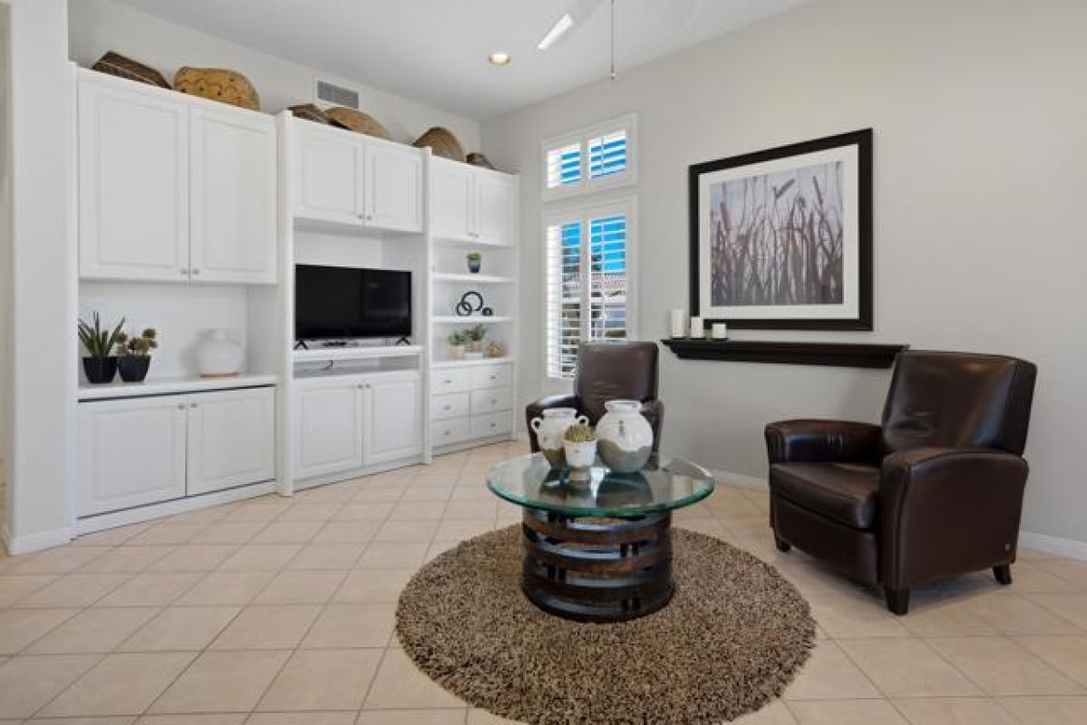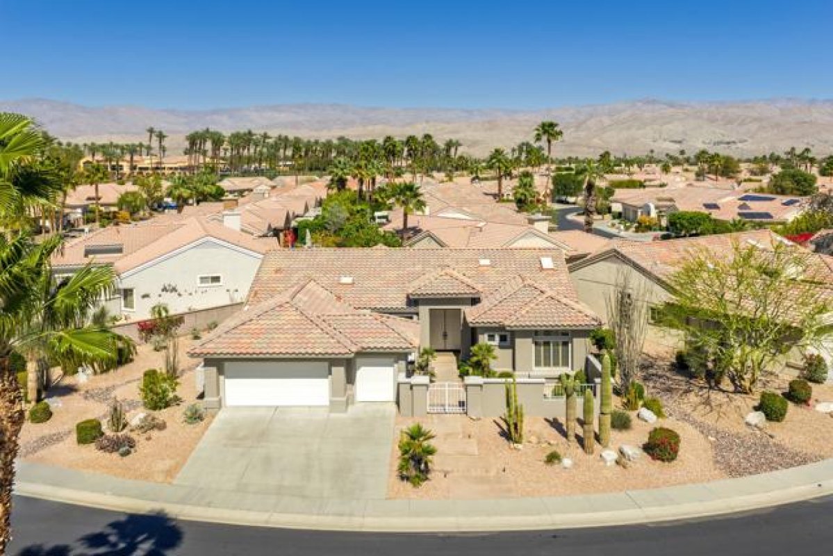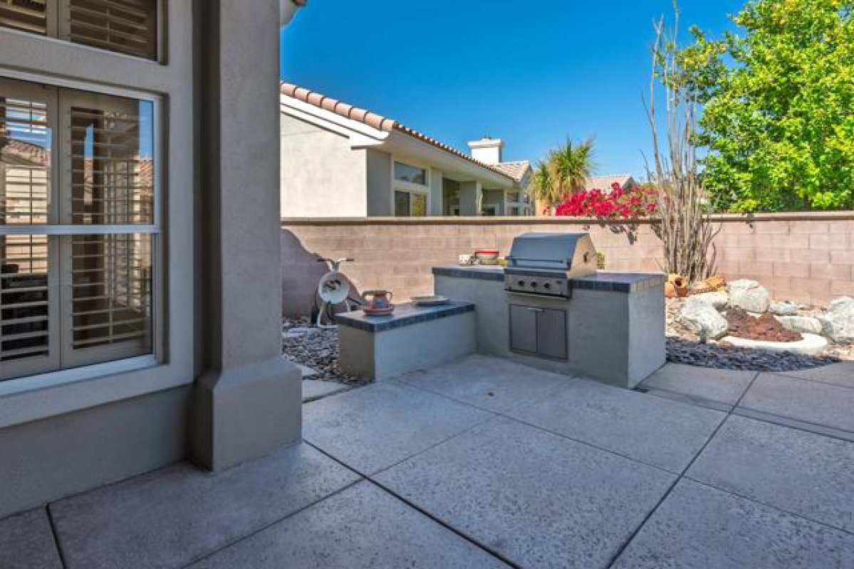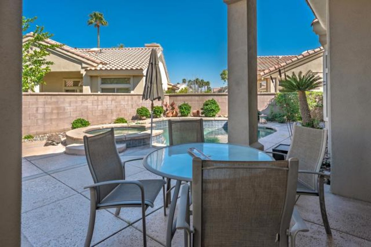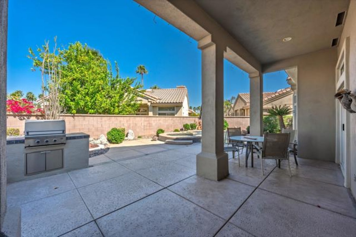 Sun City Palm Desert - Emerald. Ideally located near the Mountain View Clubhouse, this estate-model home sits on a one-of-a-kind oversized pie-shaped yard that provides an open and spacious fee and is in better condition than the day it was built. The north-facing rear yard is designed for resort-style outdoor living with a pebbletec pool with cascading spillover spa, gas fire pit, barbecue island and generous patio space for relaxing or entertaining. Exceptional curb appeal is highlighted by a gated front courtyard, double-door entry, updated paint scheme and salt-finished hardscape. Offered furnished. Inside, diagonally laid tile flooring runs throughout. The foyer and greatroom feature dramatic 12-foot coffered ceilings with uplighting, creating a light and open environment. Shutters are used throughout the home. The spacious kitchen has corian counters, a chef's island with breakfast bar, skylight, raised panel cabinetry with pullout shelves, and stainless appliances including Viking and Sub-Zero. The adjacent family room features a custom built-in media center. The primary suite has a bay window and a large walk-in closet with mirrored wardrobe doors. The primary bathroom includes dual sinks, a sitting vanity, skylight, stall shower with textured glass doors and an oversized spa tub with cultured marble surfaces. The guest suite also has mirrored wardrobe doors and an ensuite bathroom with shower/tub and tile surrounds. The guest bedroom includes a custom built-in desk and shelving along with French doors that open to the front courtyard. Additional features include a laundry room with utility sink and extensive cabinetry, a 2+ golf cart garage with abundant built-in storage, dual American Standard A/C systems new in 2017 and a 50-gallon water heater installed in 2016. This beautifully maintained home combines space, quality and an outstanding location within Sun City Palm Desert.
