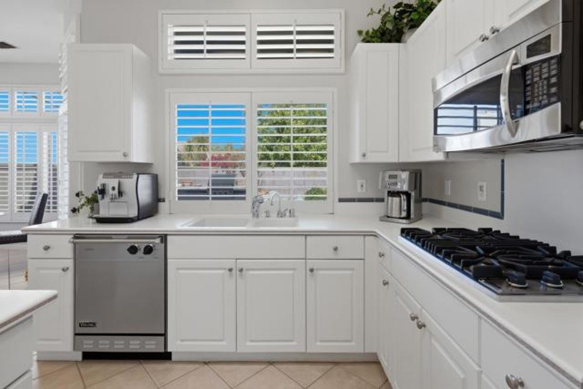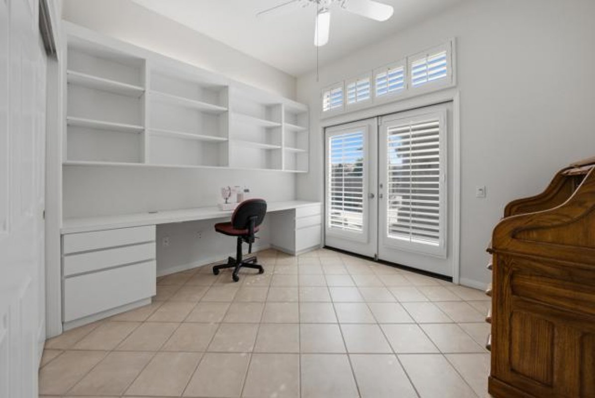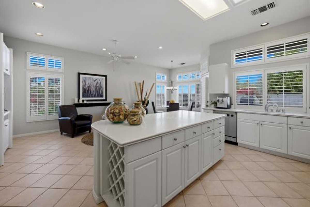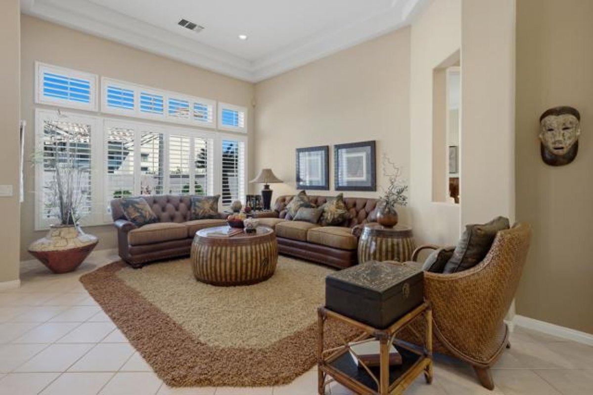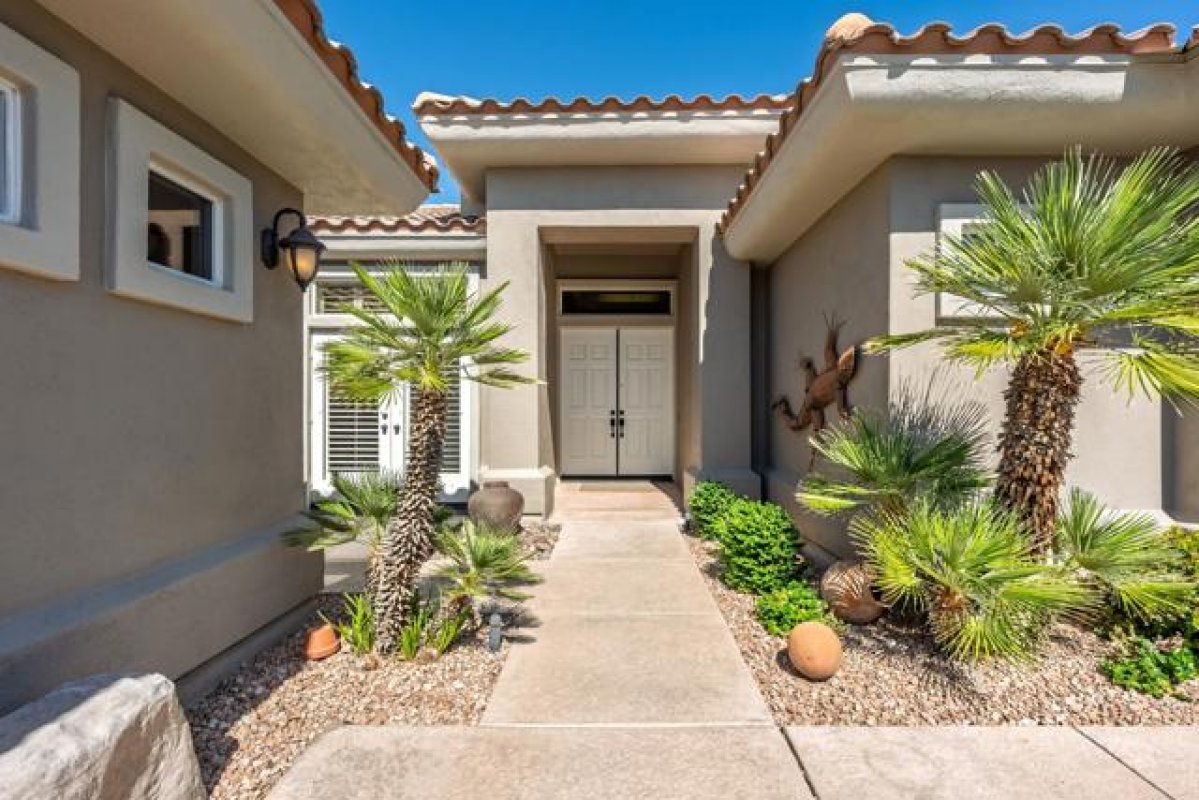 Sun City Palm Desert - Emerald. Ideally located near the Mountain View Clubhouse, this estate-model home sits on a one-of-a-kind oversized pie-shaped yard that provides an open and spacious fee and is in better condition than the day it was built. The north-facing rear yard is designed for resort-style outdoor living with a pebbletec pool with cascading spillover spa, gas fire pit, barbecue island and generous patio space for relaxing or entertaining. Exceptional curb appeal is highlighted by a gated front courtyard, double-door entry, updated paint scheme and salt-finished hardscape. Offered furnished. Inside, diagonally laid tile flooring runs throughout. The foyer and greatroom feature dramatic 12-foot coffered ceilings with uplighting, creating a light and open environment. Shutters are used throughout the home. The spacious kitchen has corian counters, a chef's island with breakfast bar, skylight, raised panel cabinetry with pullout shelves, and stainless appliances including Viking and Sub-Zero. The adjacent family room features a custom built-in media center. The primary suite has a bay window and a large walk-in closet with mirrored wardrobe doors. The primary bathroom includes dual sinks, a sitting vanity, skylight, stall shower with textured glass doors and an oversized spa tub with cultured marble surfaces. The guest suite also has mirrored wardrobe doors and an ensuite bathroom with shower/tub and tile surrounds. The guest bedroom includes a custom built-in desk and shelving along with French doors that open to the front courtyard. Additional features include a laundry room with utility sink and extensive cabinetry, a 2+ golf cart garage with abundant built-in storage, dual American Standard A/C systems new in 2017 and a 50-gallon water heater installed in 2016. This beautifully maintained home combines space, quality and an outstanding location within Sun City Palm Desert.