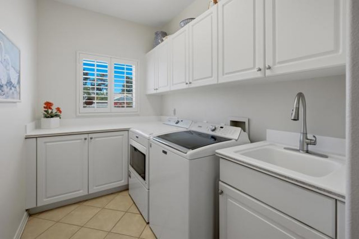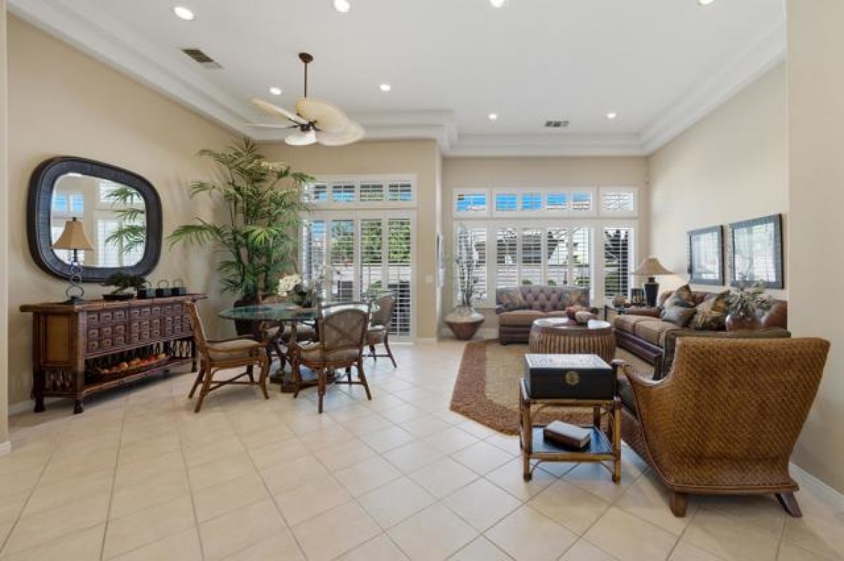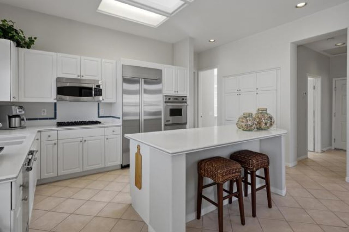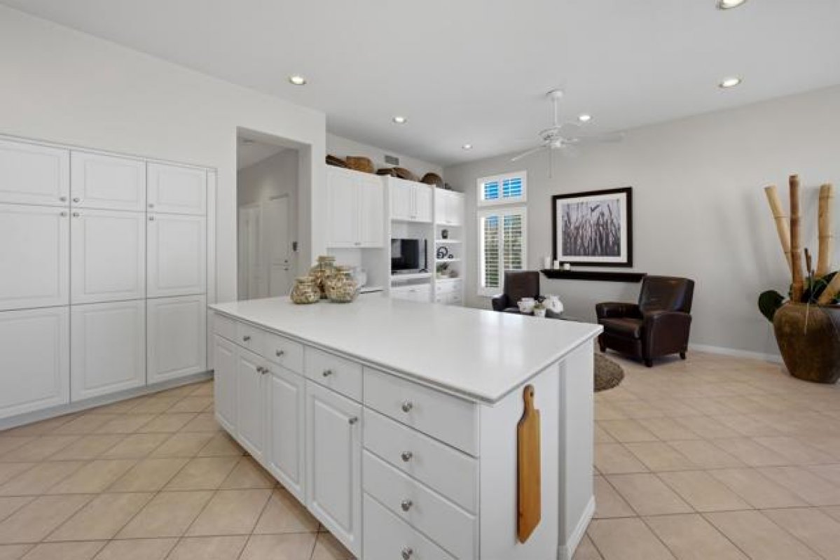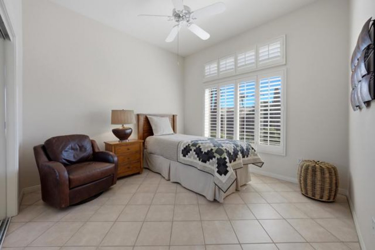 Sun City Palm Desert - Emerald. Ideally located near the Mountain View Clubhouse, this estate-model home sits on a one-of-a-kind oversized pie-shaped yard that provides an open and spacious fee and is in better condition than the day it was built. The north-facing rear yard is designed for resort-style outdoor living with a pebbletec pool with cascading spillover spa, gas fire pit, barbecue island and generous patio space for relaxing or entertaining. Exceptional curb appeal is highlighted by a gated front courtyard, double-door entry, updated paint scheme and salt-finished hardscape. Offered furnished. Inside, diagonally laid tile flooring runs throughout. The foyer and greatroom feature dramatic 12-foot coffered ceilings with uplighting, creating a light and open environment. Shutters are used throughout the home. The spacious kitchen has corian counters, a chef's island with breakfast bar, skylight, raised panel cabinetry with pullout shelves, and stainless appliances including Viking and Sub-Zero. The adjacent family room features a custom built-in media center. The primary suite has a bay window and a large walk-in closet with mirrored wardrobe doors. The primary bathroom includes dual sinks, a sitting vanity, skylight, stall shower with textured glass doors and an oversized spa tub with cultured marble surfaces. The guest suite also has mirrored wardrobe doors and an ensuite bathroom with shower/tub and tile surrounds. The guest bedroom includes a custom built-in desk and shelving along with French doors that open to the front courtyard. Additional features include a laundry room with utility sink and extensive cabinetry, a 2+ golf cart garage with abundant built-in storage, dual American Standard A/C systems new in 2017 and a 50-gallon water heater installed in 2016. This beautifully maintained home combines space, quality and an outstanding location within Sun City Palm Desert.