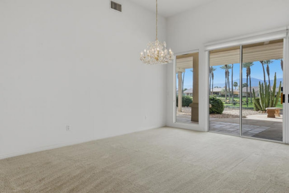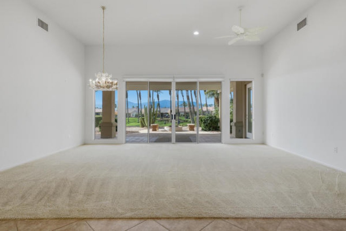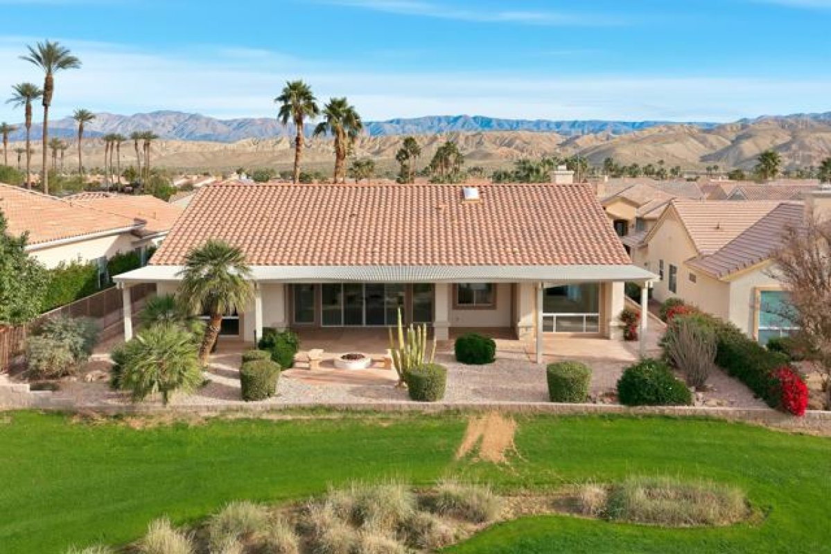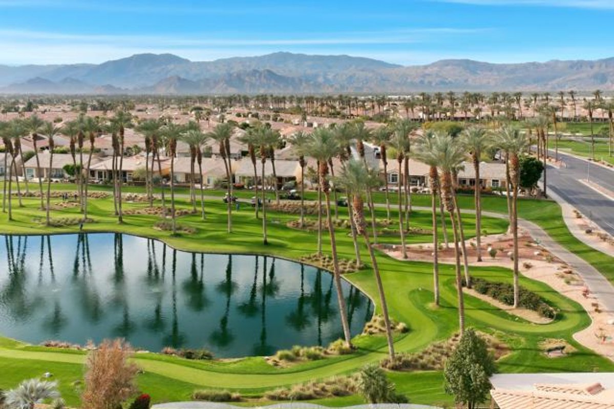 Sun City Palm Desert - Monaco. Set in a truly fabulous location overlooking the 18 hole putting course and just around the corner from the Lakeview Fitness Center and pool, this exceptional Monaco model captures the best of desert resort living. An elevated, south-facing rear yard features a flagstone patio with firepit and offers panoramic views of the putting course, lake, and surrounding mountains--an ideal setting for both relaxation and entertaining. A gated front courtyard and glass front doors create inviting curb appeal while filling the interior with natural light. Inside, the home impresses with soaring 12-foot ceilings in the foyer and great room, complemented by 10-foot ceilings throughout the rest of the home. Large-format 20-inch tile is featured in all living areas except the great room and bedrooms. The great room showcases expansive views through a double slider that opens to the rear patio, seamlessly blending indoor and outdoor living. The adjacent family room offers a cozy gathering space with a tile-trimmed gas fireplace. The kitchen is thoughtfully designed with extended maple cabinetry featuring an antiqued finish and pullout shelves, stainless steel appliances, a large chef's island, skylight, under-cabinet lighting, smooth glass electric cooktop (plumbed for gas), and a wall oven. Matching maple cabinetry continues throughout the bathrooms and laundry room. This well-designed home offers three bedrooms, each with an ensuite bathroom. The extended primary suite features a door to the rear patio, a spacious walk-in closet, and a luxurious ensuite bath with spa tub, dual sinks with sitting vanity, tile surfaces, and a stall shower with rimless glass enclosure. The extended guest suite includes French doors to the front courtyard and an ensuite bath with stall shower, rain glass doors, and tile finishes. A third guest suite also features an ensuite bath with stall shower and rain glass doors. Additional highlights include a laundry room with abundant storage and utility sink, a gigantic 2+ golf cart garage, recirculating hot water, and dual air-conditioning systems replaced in 2019. An exceptional opportunity to enjoy views, privacy, and close proximity to premier amenities in one of Sun City Palm Desert's most desirable settings.