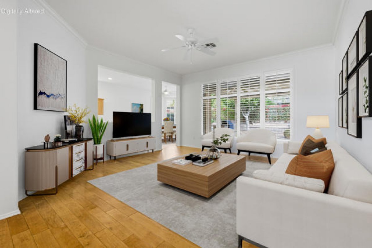 Sun City Palm Desert - Tangier. Ideally located between the Lakeview and Sunset View Clubhouses, this popular floorplan offers comfort, functionality, and easy desert living. The spacious north-facing rear yard features an extended patio with an aluamawood patio cover, lush desert landscaping with raised planters, and a built-in BBQ islanda"perfect for outdoor relaxation or entertaining. A gated front courtyard with patio adds both curb appeal and everyday usability. Inside, 10-foot ceilings and transom windows create a light and open atmosphere. Plantation shutters are found throughout, along with a tasteful mix of hardwood flooring in the living areas and bedrooms and tile flooring elsewhere. The kitchen is well appointed with Corian countertops, a breakfast bar, recipe windows, and cabinets with pull-out shelves. The den/office and living room are accented with crown molding, adding a refined touch. The primary suite features a bay window and a large walk-in closet, while the primary bath includes dual sinks, a glass-enclosed stall shower, and cultured marble surfaces. The extended guest bedroom offers French doors opening to the front courtyard and an adjacent bath with a shower/tub combination. Additional highlights include a laundry room with built-in storage and a separate closet, a new A/C installed in 2015, and an extended two-car garage with golf cart nook, built-in storage, and a work area.