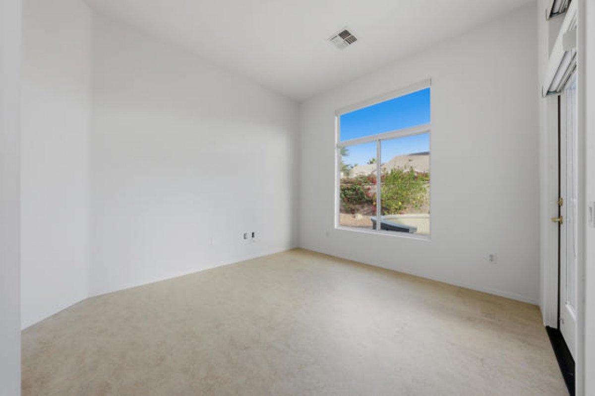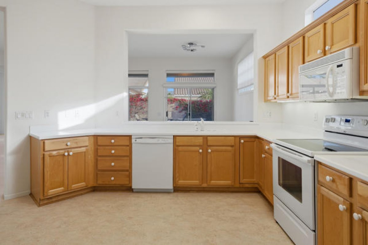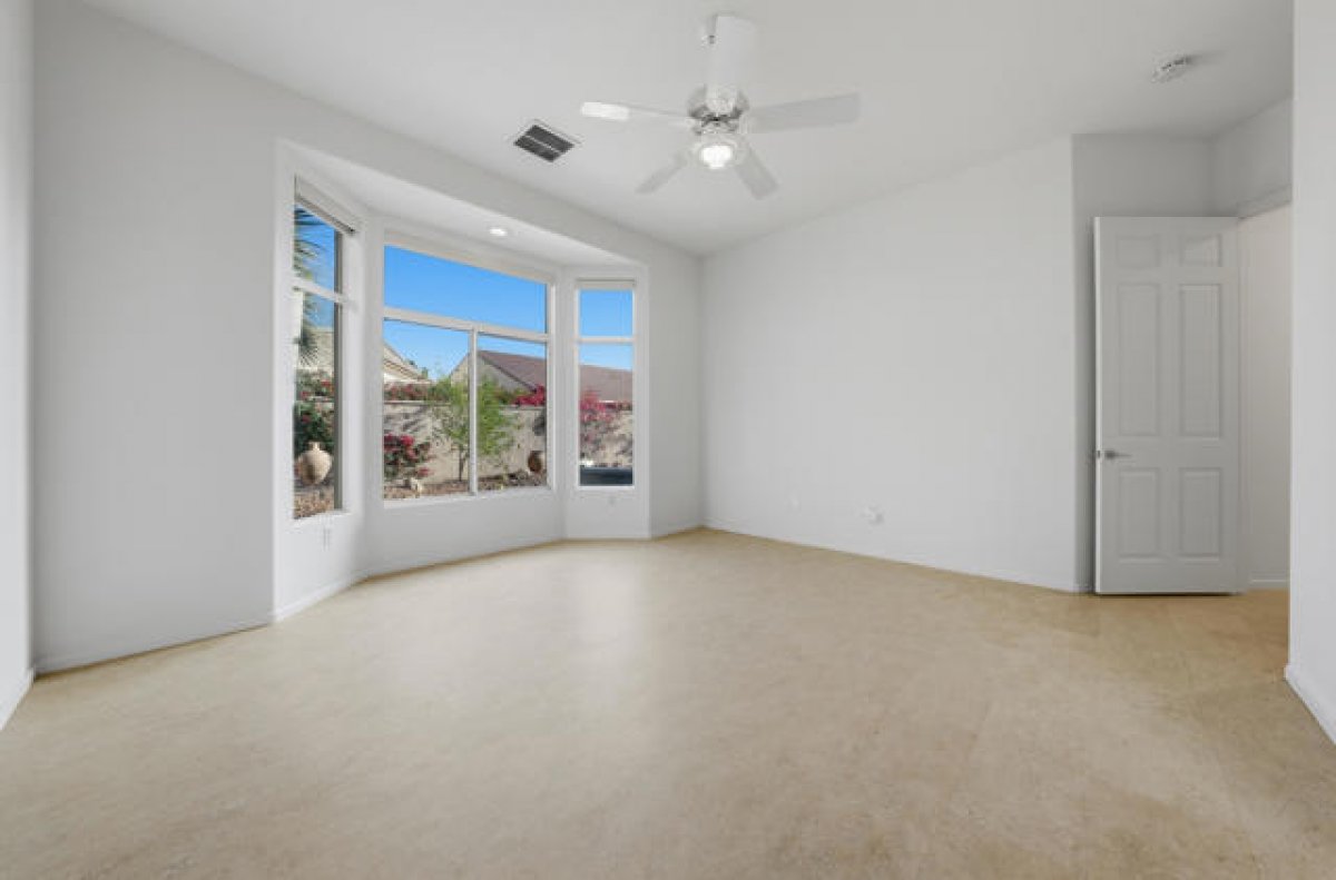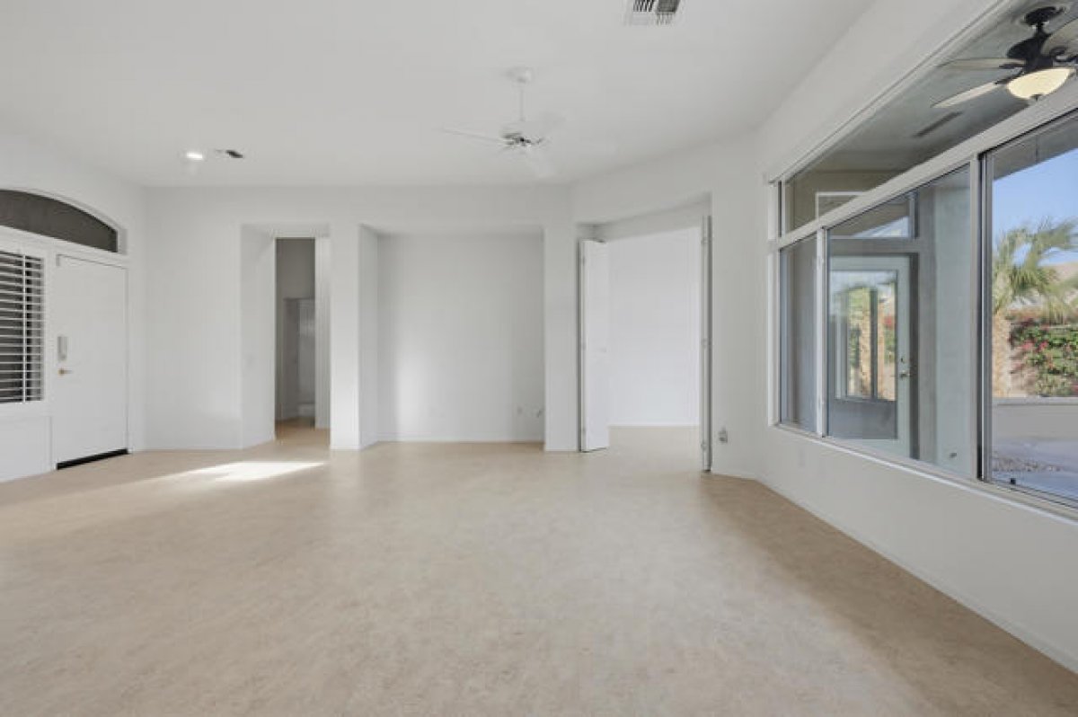 Sun City Palm Desert - Morocco with Casita. Ideally located in the heart of Sun City on a quiet street just a short distance from the Sunset View Clubhouse, this popular great room home offers comfort, privacy, and versatility. The north-facing rear yard features peekaboo mountain views, an extended patio, and lush desert landscaping with citrus--perfect for relaxing or entertaining. An updated exterior paint scheme and gated front courtyard with patio create inviting curb appeal. Inside, 10-foot ceilings and transom windows fill the home with natural light. Upgraded plank flooring and ceiling fans run throughout, and shutters cover all windows except the great room view windows. The spacious kitchen is appointed with Corian countertops, light maple cabinetry with pull-out shelves, recessed and under-cabinet lighting, and ample storage. Folding doors off the great room open to a flexible den or office. The primary suite features double-door entry, a bay window, an enlarged walk-in closet, and an en-suite bath with dual sinks and a stall shower with textured glass enclosure. The guest bath includes a tub/shower combination. French doors from the courtyard lead to the detached casita, providing a private guest bedroom with its own en-suite bath. Additional highlights include a laundry room with utility sink and built-in storage, a two-car garage with extensive built-ins, a golf cart parking nook, and man doors to both the courtyard and side yard. The main A/C was replaced in 2016.