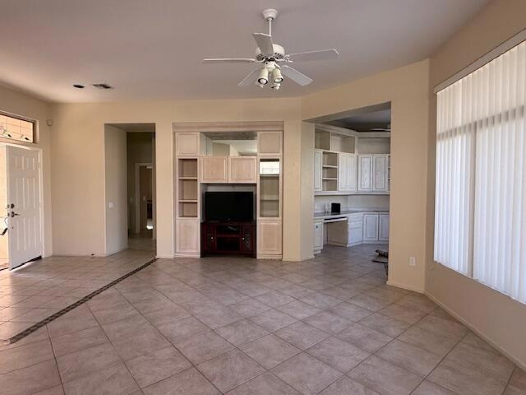 Sun City Palm Desert - Morocco. This popular great room floor plan offers exceptional potential and is attractively priced to allow you to update and personalize to your taste. The spacious north-facing rear yard features an extended patio, low-maintenance desert landscaping, and peekaboo mountain views--ideal for relaxed desert living. A gated front courtyard with patio adds both curb appeal and everyday functionality. Inside, 10-foot ceilings and transom windows create a light, open atmosphere. Tile flooring extends throughout the home except for the guest bedroom. The kitchen is equipped with Corian countertops, raised-panel cabinetry, and a chef's island, and flows seamlessly into the great room. Custom built-ins enhance the great room, den/office, and guest bedroom, adding style and storage. Double doors lead to the primary suite, featuring a bay window and a spacious walk-in closet with built-in organizers. The primary bath includes dual sinks and a glass-enclosed stall shower, while the guest bathroom offers a tub/shower combination. The two-car garage includes an enclosed, air-conditioned workspace that can easily be removed to restore golf cart parking if desired.