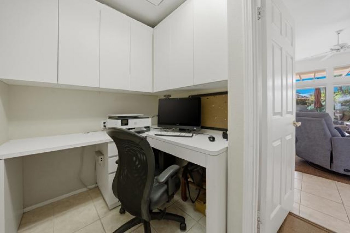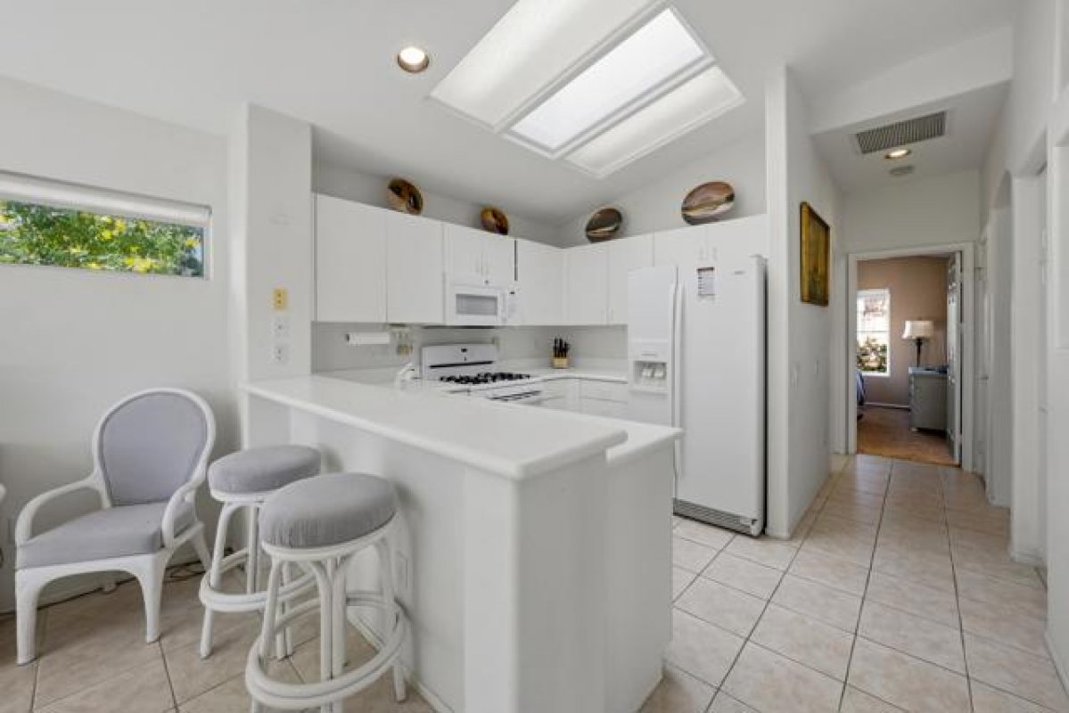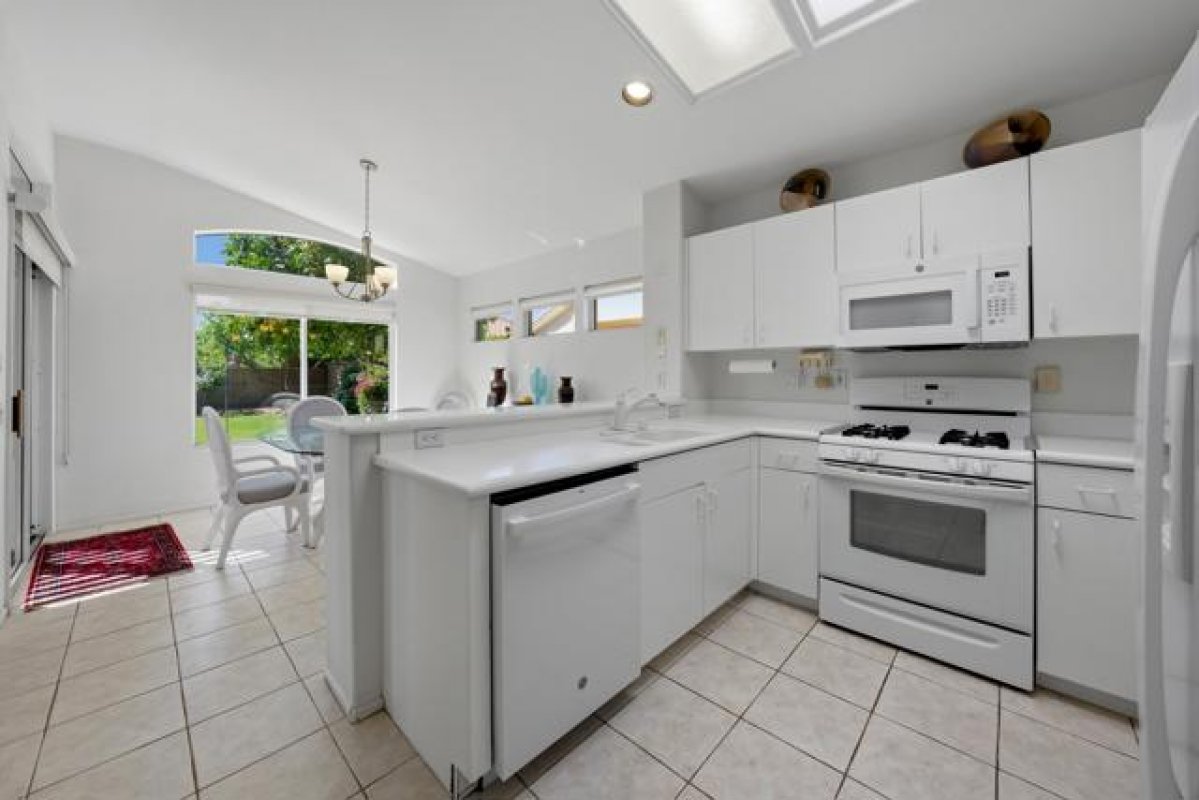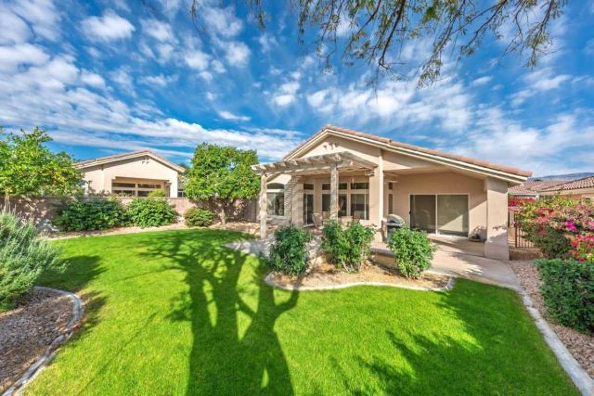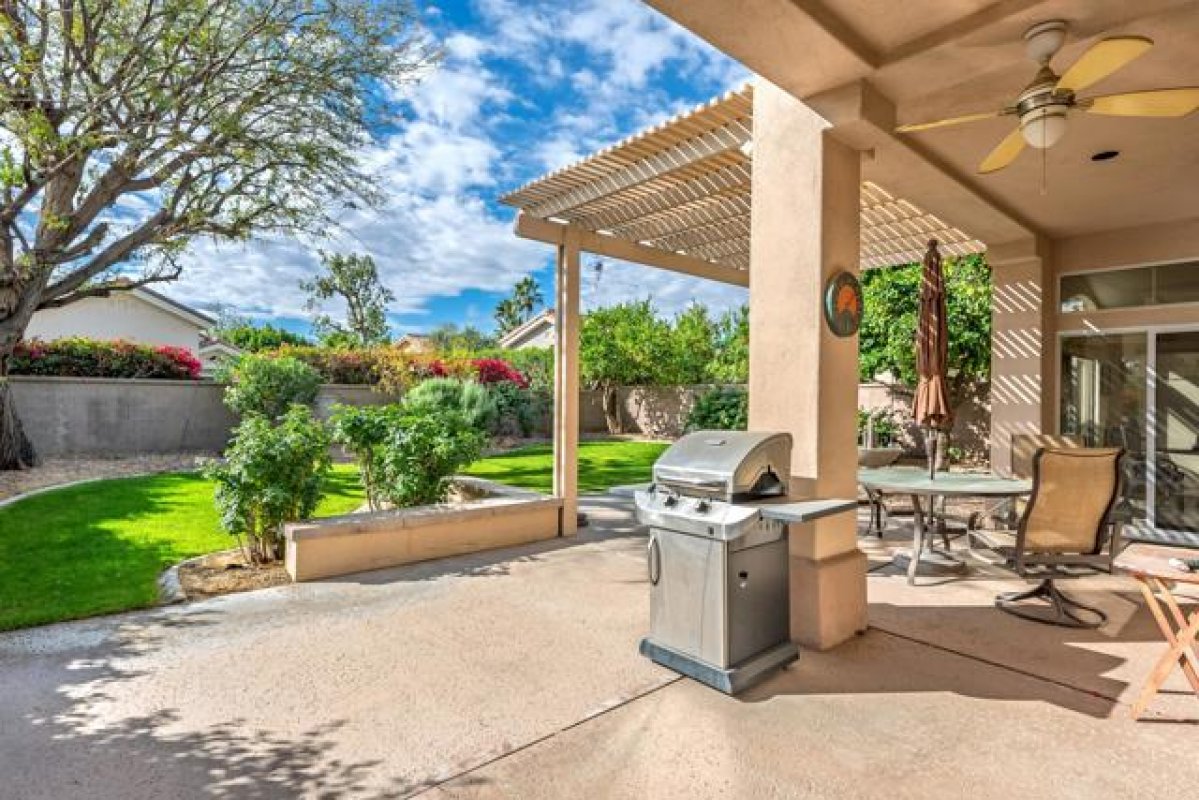 Sun City Palm Desert - Gorham. Just a short distance from the Mountain View Clubhouse, this charming home boasts a spacious, park-like south-facing rear yard adorned with lush landscaping, an extended patio with an alumawood cover, curbed planters, a sitting wall, and vibrant rose bushes and citrus trees--perfect for outdoor gatherings. Inside, enjoy tile floors throughout, except in the bedrooms, and vaulted ceilings in the kitchen, primary suite, and guest bedroom, creating an airy atmosphere. The kitchen is equipped with corian countertops, a breakfast bar, and a new. The primary suite offers dual closets with mirrored wardrobe doors and built-in storage, while the bathroom features dual sinks and a stall shower with textured glass doors. The guest bathroom includes a shower/tub while the guest bedroom also has a closet with mirrored wardrobe doors. Additional functional spaces include a utility room with a desk and cabinetry, and a two-car garage with built-in storage, a utility sink, and a garage opener replaced in 2025. Recent upgrades include a new water heater in 2023 and a new irrigation system in 2024.