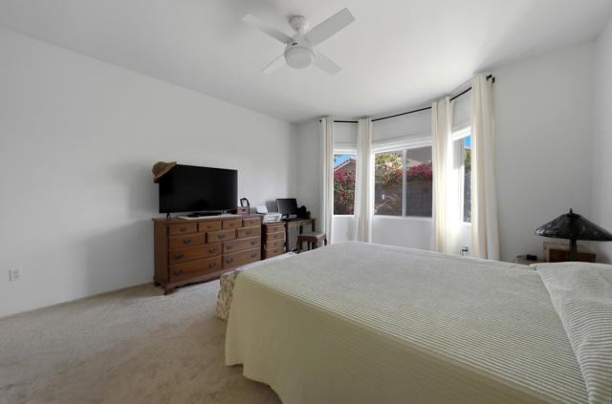 Sun City Palm Desert - Barbados. Ideally located just a short distance to the Mountain View Clubhouse and the convenient golf cart gate with access to Stater Bros. shopping center, this well-maintained Barbados model offers comfort, style, and an exceptional location. The home's inviting curb appeal is enhanced by beautiful palm trees and desert landscaping. Step outside to the north-facing rear yard featuring an extended tile patio, alumawood patio cover, and lush desert landscaping--perfect for relaxing or entertaining in the desert climate. Inside, tile flooring runs throughout all but the bedroms, creating a clean and cohesive look. The open living and dining areas are filled with natural light, with a large dining window and sliding glass door providing seamless access to the north-facing rear yard. The kitchen is tastefully updated with stainless steel LG appliances and quartz countertops, offering both functionality and modern appeal. The spacious primary suite features a bay window and a walk-in closet with custom built-in storage. Its ensuite bathroom has been upgraded with 12x24 tile laid offset, a sitting vanity, updated sink, fixtures, lighting, and a stall shower with textured glass doors. The guest bedroom includes mirrored wardrobe doors, while the updated guest bathroom showcases tile laid in a stylish herringbone pattern along with an upgraded vanity, sink, mirror, and lighting. Additional upgrades include a laundry room with built-in storage, a Lennox AC system (new in 2017), and upgraded ceiling fans and door hardware throughout. Enjoy all that Sun City Palm Desert has to offer, including golf, clubhouses, fitness centers, dining, and a vibrant social lifestyle.